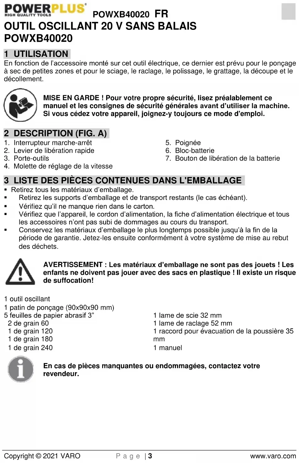 - Maintenez la propreté et l'affûtage des outils tranchants. Des outils tranchants entretenus avec soin, équipés de lames affûtées, se bloquent moins souvent et sont plus faciles à diriger.POWXB40020 FR Copyright © 2021 VARO P a g e | 6 www.varo.com