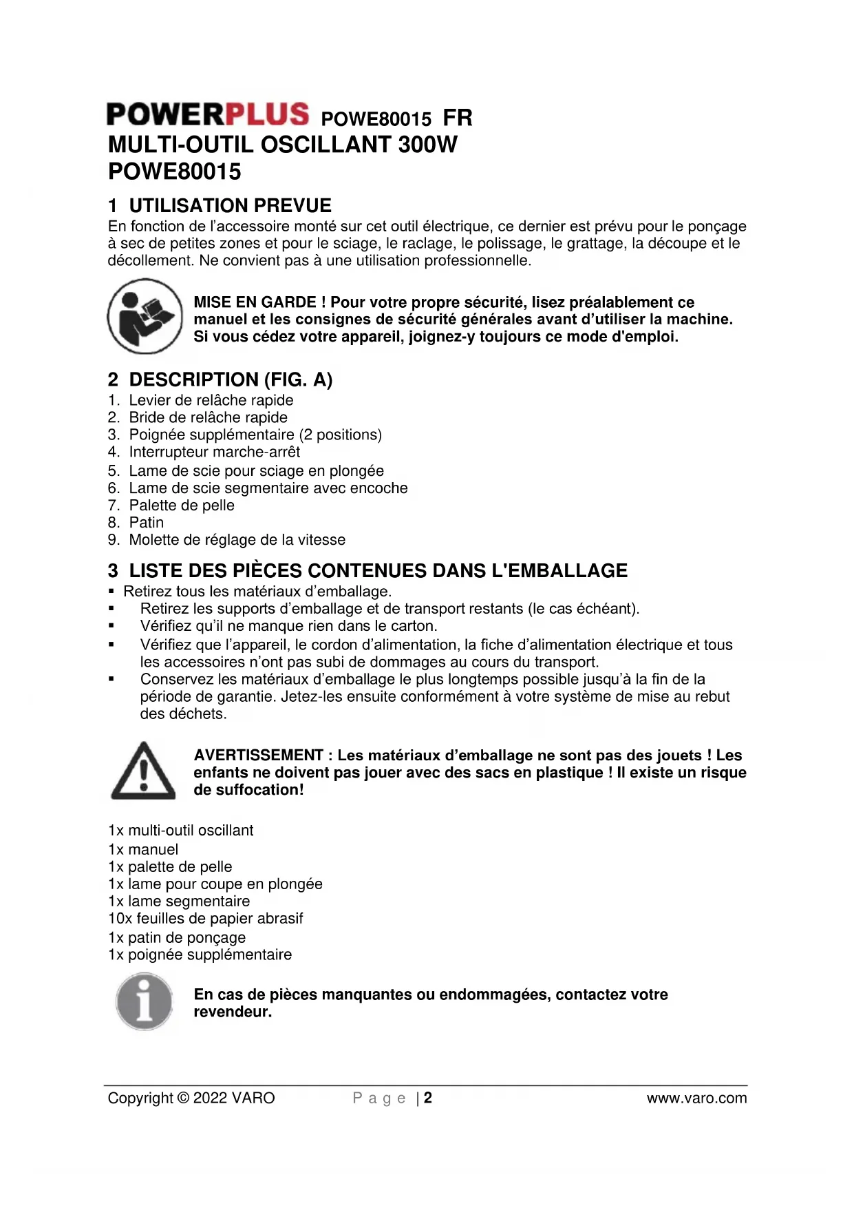enfants ne doivent pas jouer avec des sacs en plastique ! Il existe un risque de suffocation! 1x multi-outil oscillant 1x manuel 1x palette de pelle 1x lame pour coupe en plongée 1x lame segmentaire 10x feuilles de papier abrasif 1x patin de ponçage 1x poignée supplémentaire En cas de pièces manquantes ou endommagées, contactez votre revendeur.POWE80015 FR Copyright © 2022 VARO P a g e | 3 www.varo.com 4 PICTOGRAMMES Les symboles suivants sont utilisés dans ce mode d’emploi et/ou sur la machine :