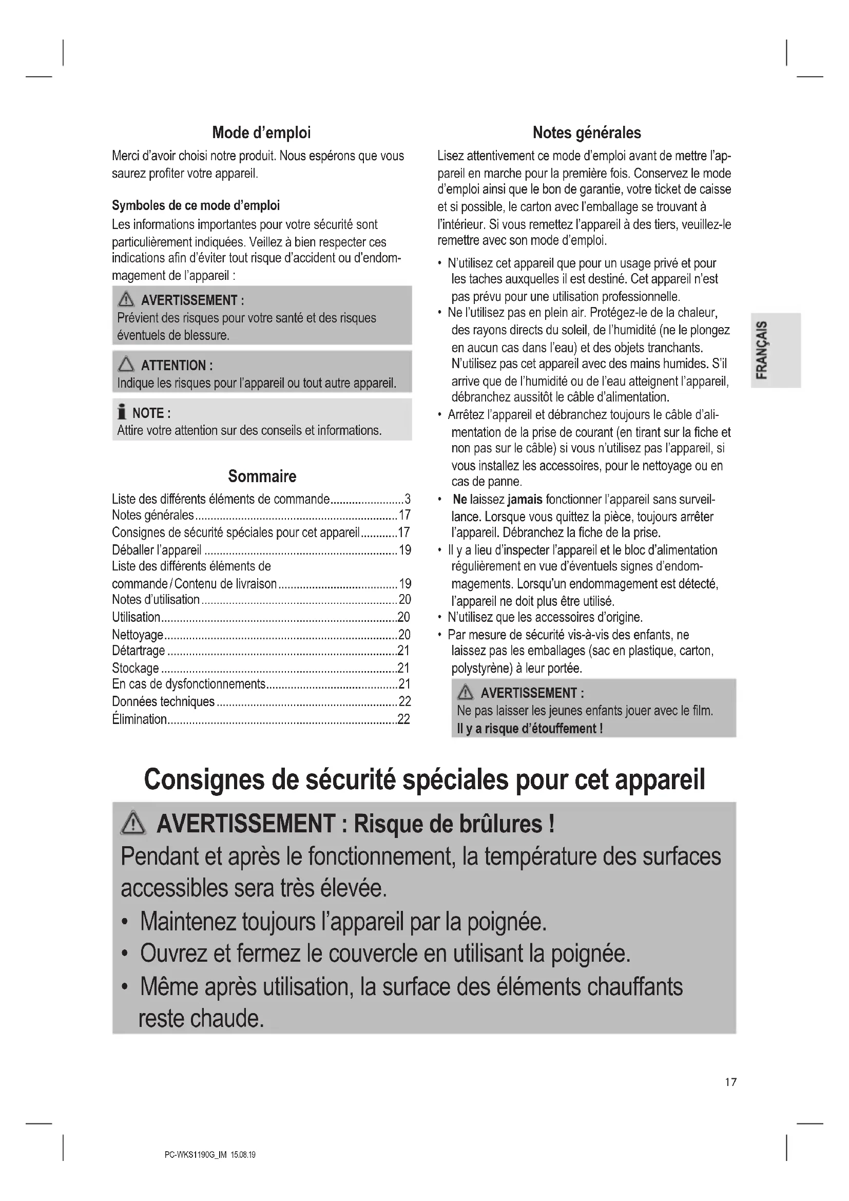 - Élimination Notes générales Lisez attentivement ce mode d’emploi avant de mettre l’ap- pareil en marche pour la première fois. Conservez le mode d’emploi ainsi que le bon de garantie, votre ticket de caisse et si possible, le carton avec l’emballage se trouvant à l’intérieur. Si vous remettez l’appareil à des tiers, veuillez-le remettre avec son mode d’emploi. p. 22