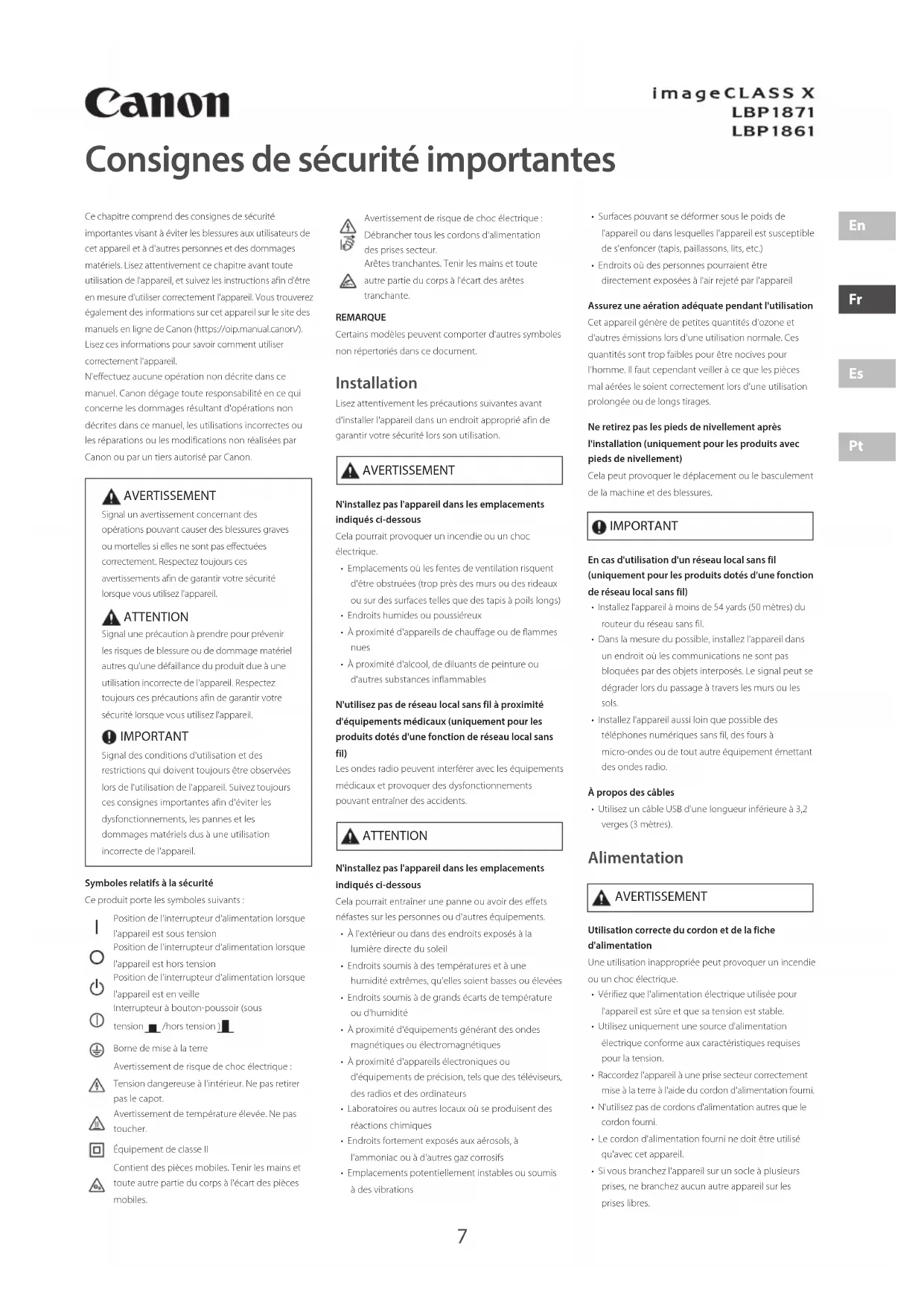 PtConsignes de sécurité importantes Ce chapitre comprend des consignes de sécurité importantes visant à éviter les blessures aux utilisateurs de cet appareil et à d'autres personnes et des dommages matériels. Lisez attentivement ce chapitre avant toute utilisation de l'appareil, et suivez les instructions afin d'être en mesure d'utiliser correctement l'appareil. Vous trouverez également des informations sur cet appareil sur le site des manuels en ligne de Canon (https://oip.manual.canon/). Lisez ces informations pour savoir comment utiliser correctement l'appareil. N'effectuez aucune opération non décrite dans ce manuel. Canon dégage toute responsabilité en ce qui concerne les dommages résultant d'opérations non décrites dans ce manuel, les utilisations incorrectes ou les réparations ou les modifications non réalisées par Canon ou par un tiers autorisé par Canon. AVERTISSEMENT Signal un avertissement concernant des opérations pouvant causer des blessures graves ou mortelles si elles ne sont pas effectuées correctement. Respectez toujours ces avertissements afin de garantir votre sécurité lorsque vous utilisez l'appareil. ATTENTION Signal une précaution à prendre pour prévenir les risques de blessure ou de dommage matériel autres qu'une défaillance du produit due à une utilisation incorrecte de l'appareil. Respectez toujours ces précautions afin de garantir votre sécurité lorsque vous utilisez l'appareil. IMPORTANT Signal des conditions d'utilisation et des restrictions qui doivent toujours être observées lors de l'utilisation de l'appareil. Suivez toujours ces consignes importantes afin d'éviter les dysfonctionnements, les pannes et les dommages matériels dus à une utilisation incorrecte de l'appareil.Symboles relatifs à la sécuritéCe produit porte les symboles suivants:Position de l'interrupteur d'alimentation lorsque l'appareil est sous tensionPosition de l'interrupteur d'alimentation lorsque l'appareil est hors tensionPosition de l'interrupteur d'alimentation lorsque l'appareil est en veilleInterrupteur à bouton-poussoir (sous tension/hors tension )Borne de mise à la terreAvertissement de risque de choc électrique: Tension dangereuse à l'intérieur. Ne pas retirer pas le capot.Avertissement de température élevée. Ne pas toucher.Équipement de classeIIContient des pièces mobiles. Tenir les mains et toute autre partie du corps à l'écart des pièces mobiles.Avertissement de risque de choc électrique: Débrancher tous les cordons d'alimentation des prises secteur.Arêtes tranchantes. Tenir les mains et toute autre partie du corps à l'écart des arêtes tranchante.REMARQUECertains modèles peuvent comporter d'autres symboles non répertoriés dans ce document. Installation Lisez attentivement les précautions suivantes avant d'installer l'appareil dans un endroit approprié afin de garantir votre sécurité lors son utilisation. AVERTISSEMENT N'installez pas l'appareil dans les emplacements indiqués ci-dessousCela pourrait provoquer un incendie ou un choc électrique.• Emplacements où les fentes de ventilation risquent d'être obstruées (trop près des murs ou des rideaux ou sur des surfaces telles que des tapis à poils longs)• Endroits humides ou poussiéreux• À proximité d'appareils de chauffage ou de flammes nues