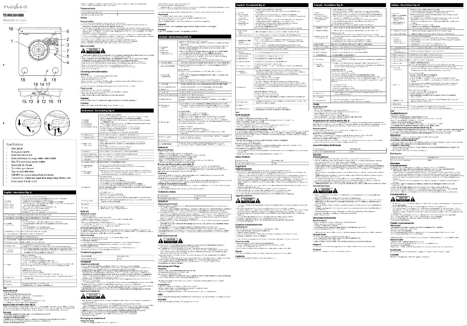 - Nettoyez l'appareil avec un chion doux et humide. Séchez soigneusement l'appareil avec un chion propre et sec. Disques vinyle• Tenez les disques vinyle par les bords avec les mains propres.• Ne touchez pas la surface des disques vinyle an de préserver la qualité sonore.• Ne touchez pas les sillons des disques vinyle.• Rangez les disques vinyle à la verticale et dans leur housse de protection si vous ne les utilisez pas. Support Si vous avez des commentaires, des suggestions ou besoin d'aide, veuillez visiter www.nedis.com/support Contact NEDIS B.V., De Tweeling 28, 5215 MC ‘s-Hertogenbosch, Pays-Bas Italiano - Descrizione (g. A) 1. Giradischi2. Braccio di riproduzione3. Meccanismo di sollevamento del braccio4. Supporto del braccio5. Fermo del braccio• Collocare un disco in vinile sul piatto del giradischi.• Rimuovere la copertura della puntina slandola dal braccio di riproduzione.• Premere il fermo del braccio lateralmente per sbloccare il braccio.• Utilizzare il meccanismo di sollevamento apposito per sollevare il braccio oppure sollevare manualmente il braccio.• Collocare il braccio di riproduzione sul bordo esterno del disco in vinile. Il giradischi inizia automaticamente a ruotare e riprodurre il disco in vinile.• Sollevare il braccio di riproduzione. Collocare il braccio di riproduzione sull’apposito supporto.• Innestare il fermo per bloccare il braccio.• Rimuovere il disco in vinile dal piatto del giradischi.Nota: Prima del trasporto, assicurarsi che il braccio di riproduzione sia bloccato.