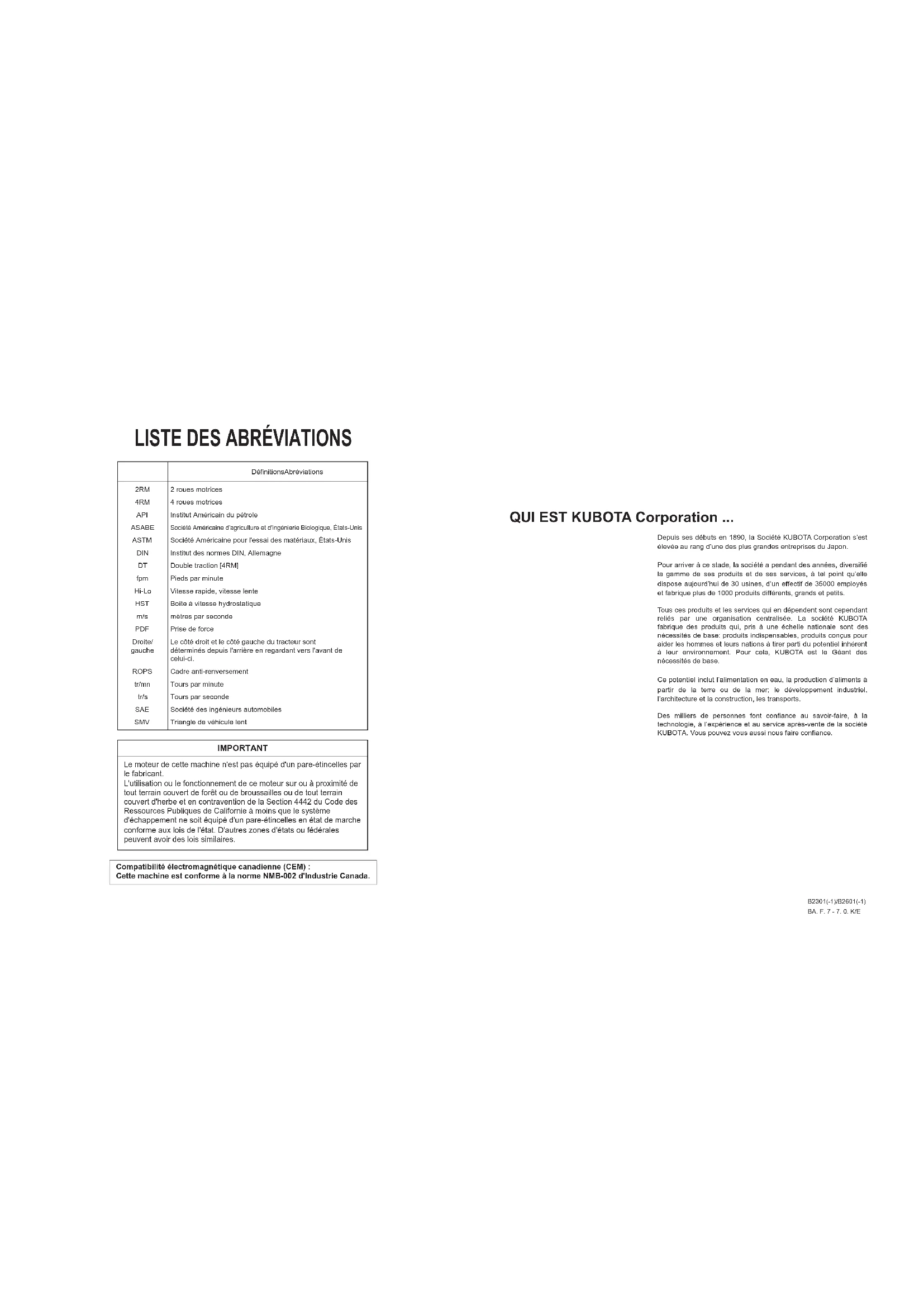 fpm Hi-Lo HST m/s PDF Droite/ gauche ROPS tr/mn tr/s SAE SMV 2 roues motrices 4 roues motrices Institut Américain du pétrole Société Américaine d'agriculture et d'ingénierie Biologique, États-UnisSociété Américaine pour l'essai des matériaux, États-UnisInstitut des normes DIN, AllemagneDouble traction [4RM]Pieds par minuteVitesse rapide, vitesse lenteBoîte à vitesse hydrostatiquemètres par secondePrise de forceLe côté droit et le côté gauche du tracteur sont déterminés depuis l'arrière en regardant vers l'avant decelui-ci. Cadre anti-renversement Tours par minute Tours par seconde Société des ingénieurs automobiles Triangle de véhicule lent Compatibilité électromagnétique canadienne (CEM) : Cette machine est conforme à la norme NMB-002 d'Industrie Canada. B2301(-1)/B2601(-1)BA. F. 7 - 7. 0. K/ESYMBOLES UNIVERSELS Employés comme guide lors de l’utilisation de votre tracteur, des symboles universels variés ont été apposés sur les contrôles et les instruments. Ces symboles et leur signification sont montrés ci-dessous. Symbole d´alerte à la sécurité Carburant diesel Niveau du carburant Fréquence de rotation du moteur Compteur horaire/ Heures de fonctionnement écoulées Température du fluide de refroidissement du moteur Système de freinage Frein de stationnement Condition de charge de la batteries Pression d´huile du moteur Indicateur de direction Arrêt du moteur Moteur en marche Préchauffage du Diesel/Bougies de préchauffage (Aide à un démarrage à basse température) Commande de démarrage Prise de force-Position “DÉSENGAGER” Prise de force-Position “ENGAGER” Verrouillage du différentiel Contrôle de position-Position relevée Contrôle de position-Position abaissée Contrôle de la vitesse de descente du 3-points Réglage de vitesse Cylindre auxiliaire rétracté Cylindre auxiliaire allongé Volant-Contrôle de l'inclinaison Verrouillé Déverrouillé Feux d´avertissement de danger Phare allumé Feu de travail 4 roues motrices enclenchées 4 roues motrices déclenchées Rapide Lente Lire le manuel de l´utilisateur Vue de la machine par le haut lors du déplacement du tracteur vers l´avant Vue de la machine par le haut lors du déplacement du tracteur vers l´arrière Commande de régime du moteur Avertissement du système principalAVANT PROPOS