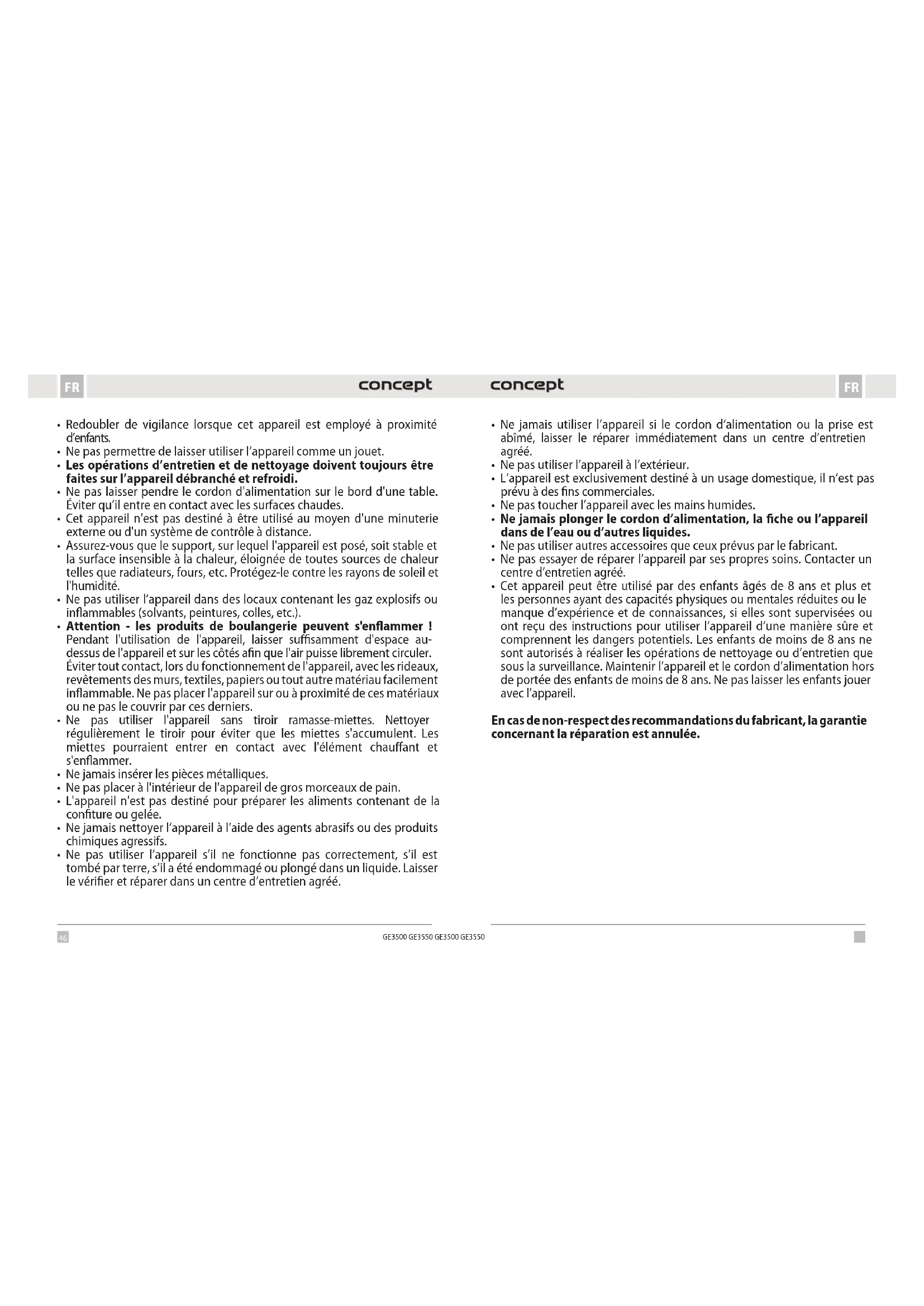 GE3500 GE3550 MERCI Nous vous remercions d’avoir acheté le produit de la marque Concept et nous espérons qu’il vous apportera votre entière satisfaction pendant son utilisation. Lire attentivement le manuel d’emploi avant la première utilisation et le conserver. Faire prendre connaissance du manuel d’emploi par les autres personnes pouvant manipuler le produit. Caractéristiques techniques Tension 220–240 V ~ 50/60 Hz Puissance 2000 W PRÉCAUTIONS PARTICULIÈRES DE SÉCURITÉ
