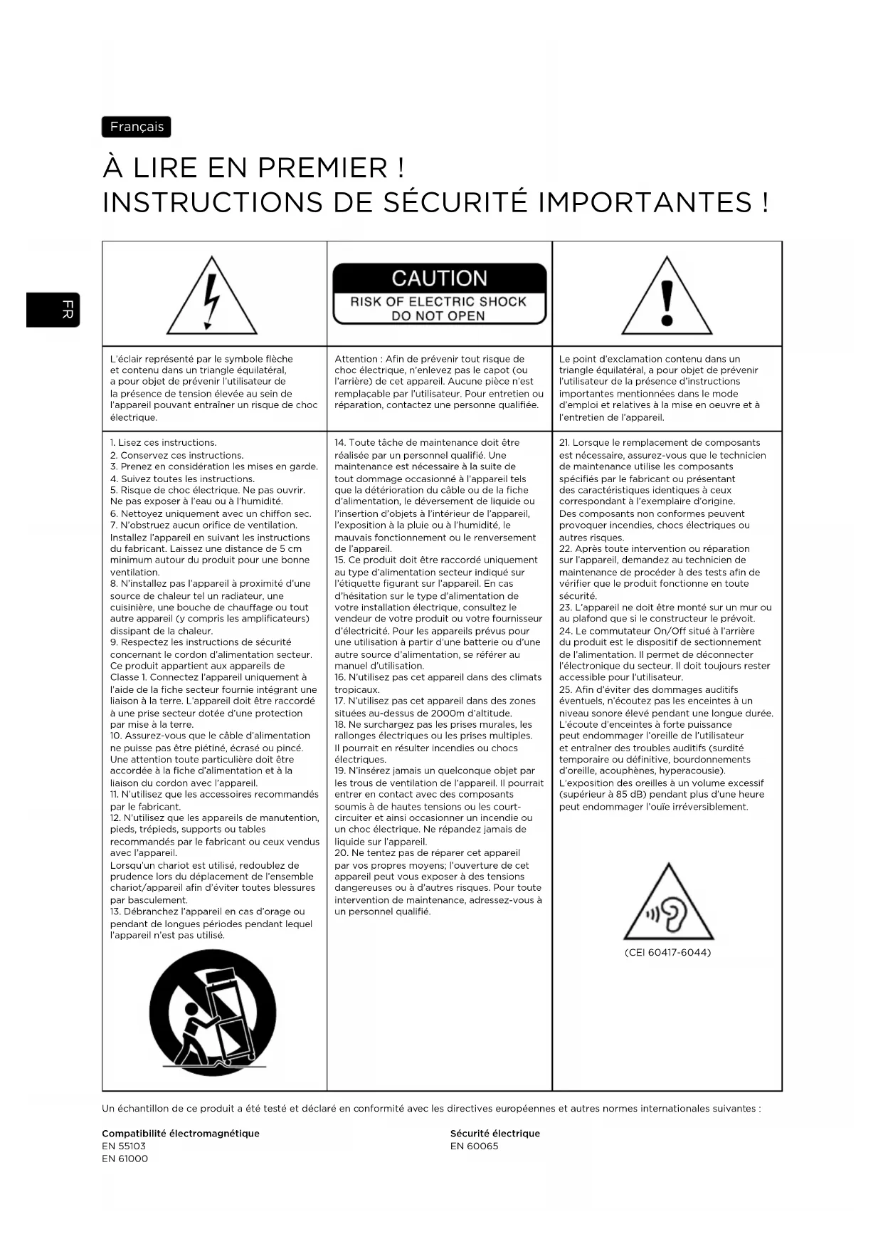 Sub6 controls (fig. G) LevelThis adjustement allows to set the sound level of the subwoofer relative to that of the main loudspeakers. It should also be optimised taking into account the actual location of the subwoofer and its acoustic consequences: for example in an angle the 6 dB acoustic gain should be compensated by an equivalent attenuation to maintain the overall balance of the system. Mute This switch will turn out the output signal of the subwoofer channel (making it silent does not require to switch the power off). When muting the subwoofer the high pass filters used for the main speakers will remain active.Hi PassThis area is dedicated to the setting of the high pass filters intended for the main speakers in a 2.1 configuration. The “Defeat” switch allows to disable (ie by-pass) these filters. The 75 Hz / 100 Hz switch allows to select the cut-off frequency, in order to optimise the acoustic recombination between the satellites and Sub6.Lo PassThis potentiometer adjusts the cut-off frequency of the low pass filter on the subwoofer channel, thus setting the upper frequency range to be reproduced by Sub6. The goal is to achieve the smoothest frequency response of the whole system: sub + satellites.PolarityThis switch inverts the signal polarity on the subwoofer channel (ie 180° phase shift).PhaseThis potentiomer provides some fine ajustment of the phase on the subwoofer channel. Combined with the polarity switch it can be used to compensate for the spacing between the sub and the main speakers, so to get a coherent soundfield through a proper time alignment of the different sources.2.1 BypassThis input allows for plugging in a control footswitch (not supplied) via a ¼” jack connector.Turning it active will :- mute the subwoofer channel - defeat the high pass filters in the satellites signal paths. The satellites will then be fed with full range signals. This facility allows for instantaneous comparison between the 2.1 configuration (with sub) and the traditional stereo setup (without sub) with the same system.Power indicatorPower "LED" indicator.FR L’éclair représenté par le symbole flèche et contenu dans un triangle équilatéral, a pour objet de prévenir l’utilisateur de la présence de tension élevée au sein de l’appareil pouvant entraîner un risque de choc électrique.Attention : Afin de prévenir tout risque de choc électrique, n’enlevez pas le capot (ou l’arrière) de cet appareil. Aucune pièce n’est remplaçable par l’utilisateur. Pour entretien ou réparation, contactez une personne qualifiée.Le point d’exclamation contenu dans un triangle équilatéral, a pour objet de prévenir l’utilisateur de la présence d’instructions importantes mentionnées dans le mode d’emploi et relatives à la mise en oeuvre et à l’entretien de l’appareil.1. Lisez ces instructions.2. Conservez ces instructions.3. Prenez en considération les mises en garde.4. Suivez toutes les instructions.5. Risque de choc électrique. Ne pas ouvrir. Ne pas exposer à l’eau ou à l’humidité.6. Nettoyez uniquement avec un chion sec.7. N’obstruez aucun orifice de ventilation.Installez l’appareil en suivant les instructions du fabricant. Laissez une distance de 5 cm minimum autour du produit pour une bonne ventilation.8. N’installez pas l’appareil à proximité d’une source de chaleur tel un radiateur, une cuisinière, une bouche de chauage ou tout autre appareil (y compris les amplificateurs) dissipant de la chaleur.9. Respectez les instructions de sécurité concernant le cordon d’alimentation secteur. Ce produit appartient aux appareils de Classe1. Connectez l’appareil uniquement à l’aide de la fiche secteur fournie intégrant une liaison à la terre. L’appareil doit être raccordé à une prise secteur dotée d’une protection par mise à la terre.10. Assurez-vous que le câble d’alimentation ne puisse pas être piétiné, écrasé ou pincé. Une attention toute particulière doit être accordée à la fiche d’alimentation et à la liaison du cordon avec l’appareil.11. N’utilisez que les accessoires recommandés par le fabricant.12. N’utilisez que les appareils de manutention, pieds, trépieds, supports ou tables recommandés par le fabricant ou ceux vendus avec l’appareil.Lorsqu’un chariot est utilisé, redoublez de prudence lors du déplacement de l’ensemble chariot/appareil afin d’éviter toutes blessures par basculement.13. Débranchez l’appareil en cas d’orage ou pendant de longues périodes pendant lequel l’appareil n’est pas utilisé.14. Toute tâche de maintenance doit être réalisée par un personnel qualifié. Une maintenance est nécessaire à la suite de tout dommage occasionné à l’appareil tels que la détérioration du câble ou de la fiche d’alimentation, le déversement de liquide ou l’insertion d’objets à l’intérieur de l’appareil, l’exposition à la pluie ou à l’humidité, le mauvais fonctionnement ou le renversement de l’appareil.15. Ce produit doit être raccordé uniquement au type d’alimentation secteur indiqué sur l’étiquette figurant sur l’appareil. En cas d’hésitation sur le type d’alimentation de votre installation électrique, consultez le vendeur de votre produit ou votre fournisseur d’électricité. Pour les appareils prévus pour une utilisation à partir d’une batterie ou d’une autre source d’alimentation, se référer au manuel d’utilisation.16. N’utilisez pas cet appareil dans des climats tropicaux.17. N’utilisez pas cet appareil dans des zones situées au-dessus de 2000m d’altitude.18. Ne surchargez pas les prises murales, les rallonges électriques ou les prises multiples. Il pourrait en résulter incendies ou chocs électriques.19. N’insérez jamais un quelconque objet par les trous de ventilation de l’appareil. Il pourrait entrer en contact avec des composants soumis à de hautes tensions ou les court-circuiter et ainsi