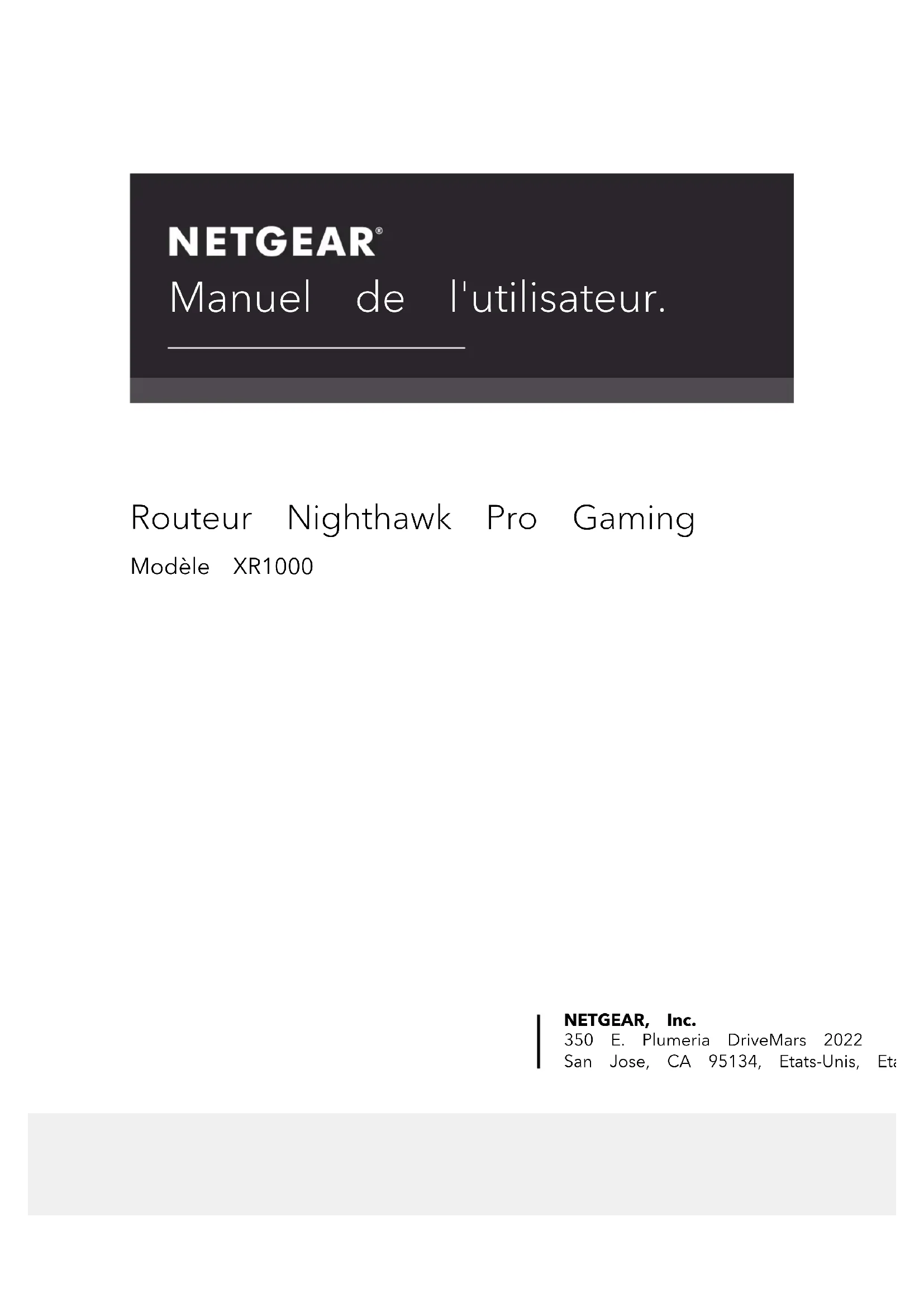 Manuel de l'utilisateur. Routeur Nighthawk Pro Gaming Modèle XR1000 NETGEAR, Inc. 350 E. Plumeria DriveMars 2022 San Jose, CA 95134, Etats-Unis, Etats-Unis202-12174-022 Routeur Nighthawk Pro Gaming Support et communauté Visitez netgear.com/support pour obtenir des réponses à vos questions et accéder aux derniers téléchargements. Vous pouvez également consulter notre communauté NETGEAR pour obtenir de bons conseils sur community.netgear.com. Réglementation et juridique Pour les informations à propos de la conformité réglementaire, y compris la Déclaration de conformité pour l'UE, rendez-vous sur https://www.netgear.com/about/regulatory/. Avant de brancher l'alimentation, reportez-vous au document de conformité légale. Marques commerciales © NETGEAR, Inc., NETGEAR et le logo NETGEAR sont des marques commerciales de NETGEAR, Inc. Toutes les marques commerciales autres que NETGEAR sont utilisées à des fins de référence uniquement.Sommaire
