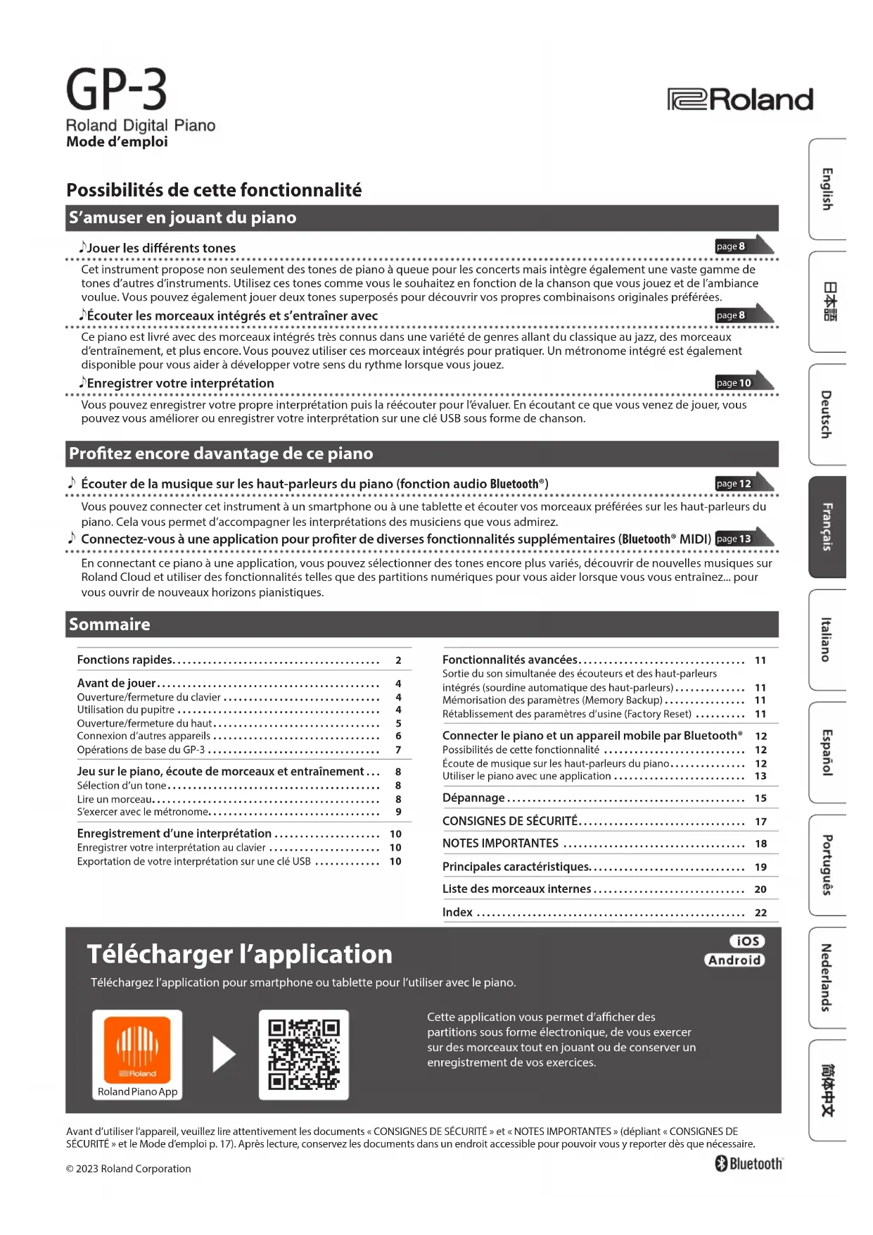 - Index Cette application vous permet d’acher des partitions sous forme électronique, de vous exercer sur des morceaux tout en jouant ou de conserver un enregistrement de vos exercices. Télécharger l’application Téléchargez l’application pour smartphone ou tablette pour l’utiliser avec le piano.Roland Piano App Mode d’emploi Possibilités de cette fonctionnalité S’amuser en jouant du piano ň Jouer les diérents tones Cet instrument propose non seulement des tones de piano à queue pour les concerts mais intègre également une vaste gamme de tones d’autres d’instruments. Utilisez ces tones comme vous le souhaitez en fonction de la chanson que vous jouez et de l’ambiance voulue. Vous pouvez également jouer deux tones superposés pour découvrir vos propres combinaisons originales préférées. ň Écouter les morceaux intégrés et s’entraîner avec Ce piano est livré avec des morceaux intégrés très connus dans une variété de genres allant du classique au jazz, des morceaux d’entraînement, et plus encore. Vous pouvez utiliser ces morceaux intégrés pour pratiquer. Un métronome intégré est également disponible pour vous aider à développer votre sens du rythme lorsque vous jouez. ň Enregistrer votre interprétation Vous pouvez enregistrer votre propre interprétation puis la réécouter pour l’évaluer. En écoutant ce que vous venez de jouer, vous pouvez vous améliorer ou enregistrer votre interprétation sur une clé USB sous forme de chanson. Protez encore davantage de ce piano ň Écouter de la musique sur les haut-parleurs du piano (fonction audio Bluetooth®) Vous pouvez connecter cet instrument à un smartphone ou à une tablette et écouter vos morceaux préférées sur les haut-parleurs du piano. Cela vous permet d’accompagner les interprétations des musiciens que vous admirez. ň Connectez-vous à une application pour proter de diverses fonctionnalités supplémentaires (Bluetooth® MIDI) En connectant ce piano à une application, vous pouvez sélectionner des tones encore plus variés, découvrir de nouvelles musiques sur Roland Cloud et utiliser des fonctionnalités telles que des partitions numériques pour vous aider lorsque vous vous entraînez pour vous ouvrir de nouveaux horizons pianistiques.page page page page page p. 22