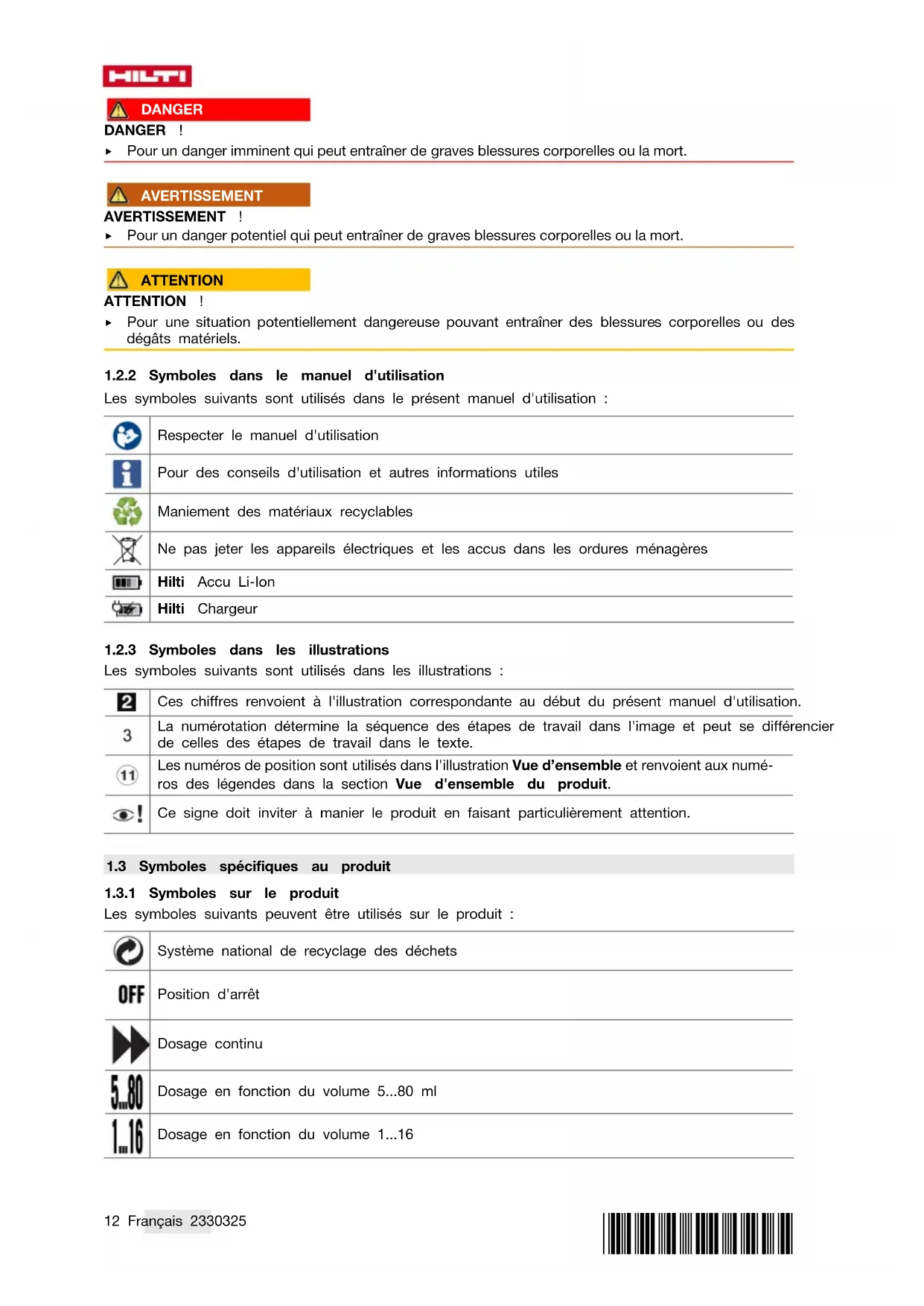 Les avertissements attirent l'attention sur des dangers liés à l'utilisation du produit. Les termes de signalisation suivants sont utilisés :12 Français 2330325 *2330325* DANGER DANGER ! ▶ Pour un danger imminent qui peut entraîner de graves blessures corporelles ou la mort. AVERTISSEMENT AVERTISSEMENT ! ▶ Pour un danger potentiel qui peut entraîner de graves blessures corporelles ou la mort. ATTENTION ATTENTION ! ▶ Pour une situation potentiellement dangereuse pouvant entraîner des blessures corporelles ou des dégâts matériels.