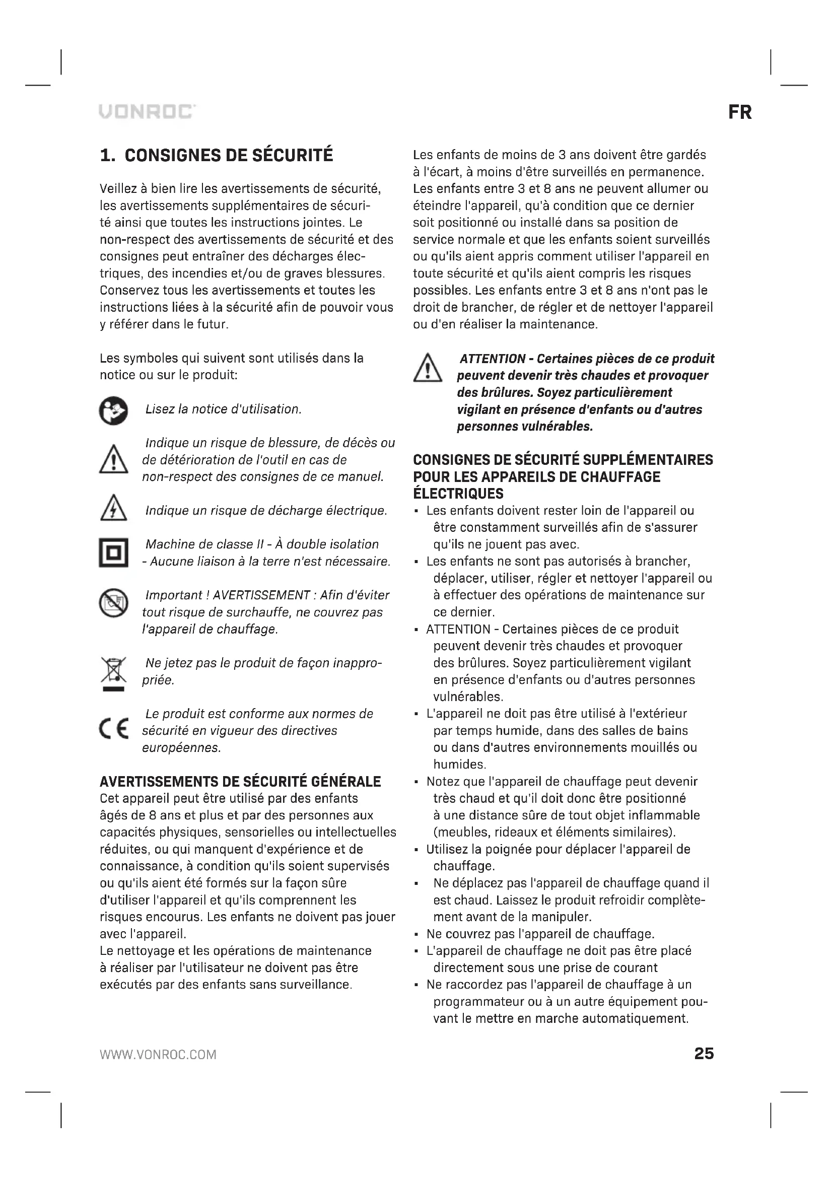 Problème Cause possible Solution L'appareil ne chauffe pas, seul le ventilateur fonctionne L'interrupteur n'apas été réglé sur Chauffage Tournez l'interrupteur jusqu'àla position Chauffage Le thermostat s'est déclenché Tournez le thermostat et écoutez si un clic se produit. S'il n'yapas de clic et que le thermostat n'est pas endommagé, l'appareil de chauffage s'allume automatiquement une fois refroidi La coupure àréinitiali- sation auto- matique s'est déclenchée Éteignez l'appareil de chauffage et contrôlez l'absence de blocage de l'arrivée ou de la sortie d'air. Débranchez la prise et patientez au moins 10 minutes pour que le système de sécurité se réinitialise avant de redémarrer l'appareil de chauffage. Bruit anormal L'appareil n'est pas bien posé àla verticale Placez l'appareil de chauffage sur une surface de niveau ENVIRONNEMENT Les appareils électriques et électroniques défectueux ou en fin de vie doivent être rapportés dans des sites de recyclage appropriés. Pour les pays de la Communauté Européenne uniquement Ne jetez pas les outils électriques avec les déchets ménagers. Conformément àla Directive Européenne 2012/19/UE relative àl'élimination des déchets électriques et électroniques et àsa transposition dans la législation nationale, les outils électriques usagés doivent être collectés séparément et être jetés de façon écologique. GARANTIE Les produits VONROC sont développés avec les normes de qualité les plus hautes et ils sont garantis pour être exempts de défaut de pièces et de main d'œuvre pour la durée stipulée par la loi et àcompter de la date d'achat initiale. Si, au cours de cette période, le produit devait rencontrer une quelconque panne due àun défaut de pièce ou de main d'œuvre, contactez VONROC directement. Les conditions suivantes sont exclues de la garan- tie: