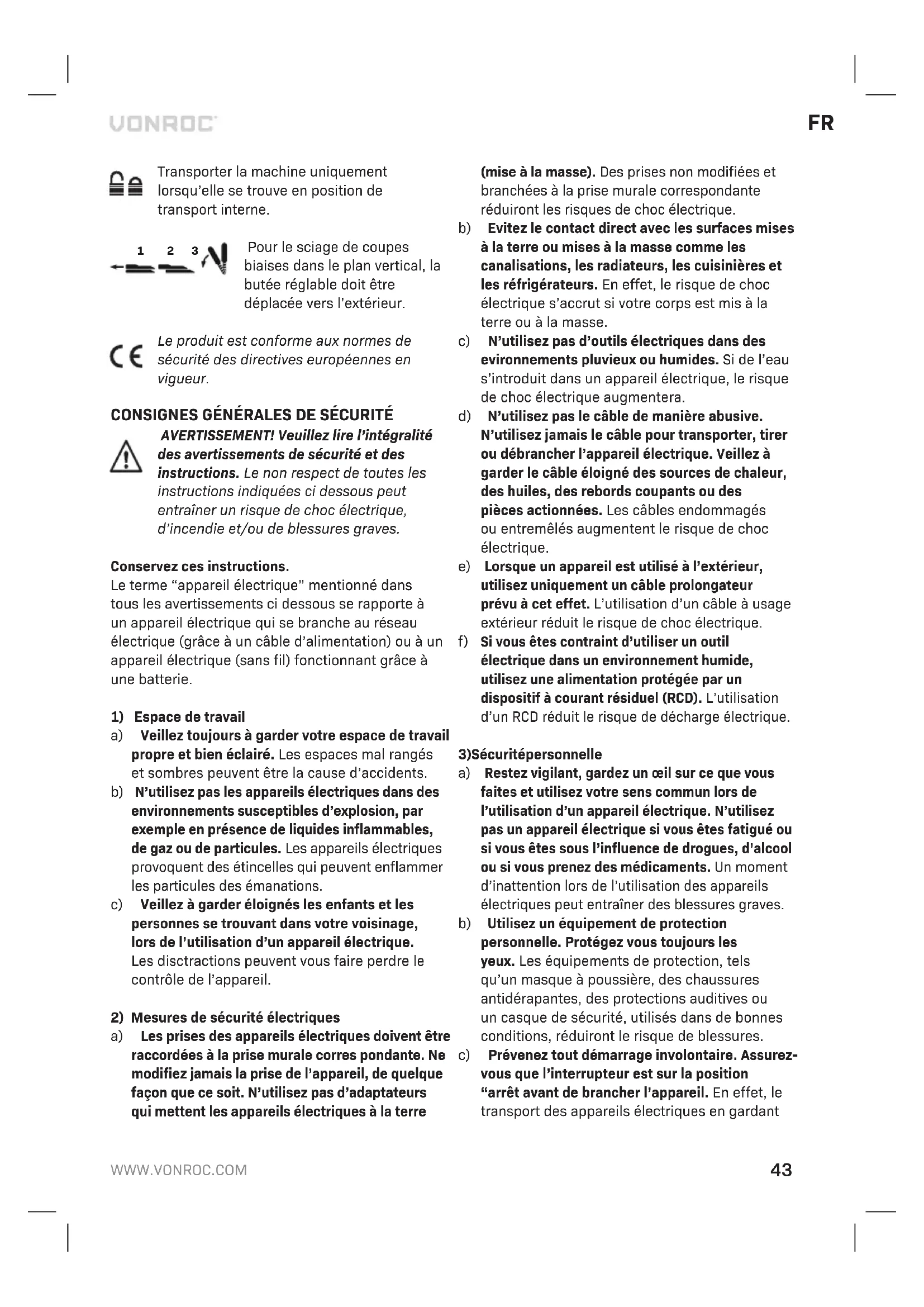 - Bougez la scie d’onglet en avant et en arrière de sorte que l’huile se répande sur toute la glissière. ENVIRONNEMENT Les équipements électroniques ou électriques défectueux ou destinés à être mis au rebut doivent être déposés aux points de recyclage appropriés. Uniquement pour les pays de l’UE Ne jetez pas les outils électriques avec les déchets domestiques. Selon la Directive européenne 2012/19/CE relative aux déchets d’équipements électriques et électroniques et sa mise en oeuvre dans le droit national, les outils électriques hors d’usage doivent être collectés séparément et mis au rebut de manière écologique. GARANTIE Les produits VONROC sont développés aux plus hauts standards de qualité et ils sont garantis contre les défauts de pièces et de main d’oeuvre pendant la durée légale stipulée à partir de la date d’achat d’origine du produit. En cas d’une quelconque panne du produit pendant cette durée qui serait due à un défaut matériel et/ou de main d’oeuvre, contactez directement VONROC. Les circonstances suivantes ne sont pas prises en charge par la garantie: