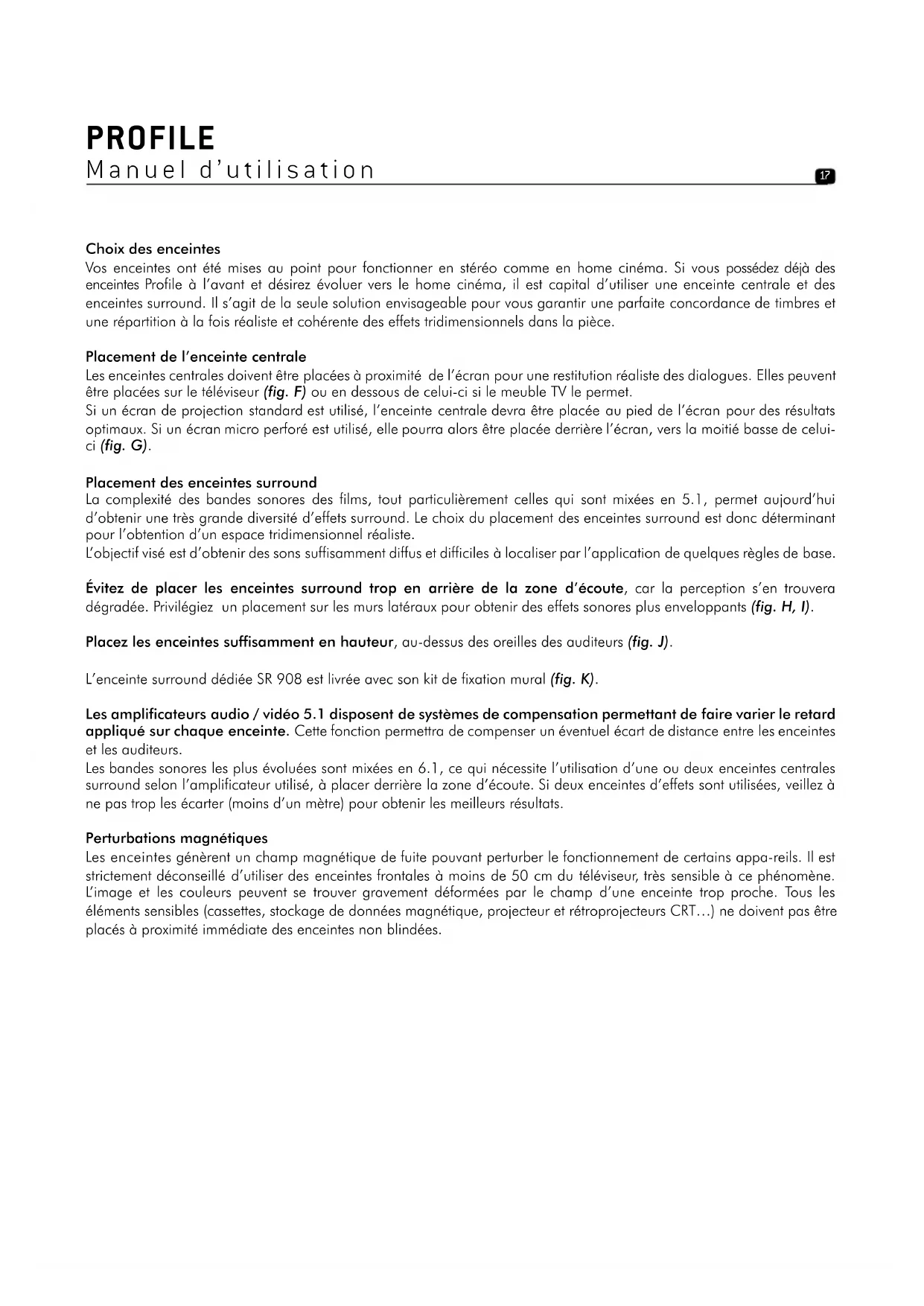 - Exemple 2 : Le centre du boomer est à 30 cm du sol (enceinte colonne) (A = 30 cm), à 1 m du mur arrière (C = 1 m), la distance aux murs latéraux sera B =√AC = 54,8 cm. Important Les grilles en tissu font partie intégrante des enceintes de la ligne Profile. Pour des performances optimales, nous vous conseillons de les laisser en place. Branchements Les connecteurs des Profile assurent des contacts fiables et polyvalents, pour câbles dénudés (jusqu’à 4 mm de diamètre) ou des fourches. Il est impératif de respecter la polarité des enceintes. Le connecteur marqué "+" doit être connecté sur la sortie correspondante de l’amplificateur, le connecteur marqué " - " sur la borne négative (fig. E). Si cette condition n’est pas respectée, l’image stéréo et la perception du grave se dégraderont considérablement. Conseils d’utilisation Le comportement des enceintes dépend de l’acoustique du local d’écoute, du bon positionnement des enceintes dans celui-ci et de l’emplacement de l’auditeur. Il est possible d’interagir sur ces éléments pour corriger ou améliorer un effet recherché. La perception stéréophonique est imprécise et mal centrée : essayez de rapprocher les enceintes l’une de l’autre et / ou les orienter vers le point d’écoute Le son est dur, agressif : l’acoustique de votre local est probablement trop réverbérante. Envisagez l’utilisation de matériaux absorbants (tapis, canapé, tentures murales, rideaux…) et réfléchissants (mobilier) pour absorber ou diffuser les résonances. Le son est «plat «, étouffé : excès de matériaux absorbants dans la pièce, le son est bouché, sans relief. Recherchez un meilleur compromis entre les matériaux absorbants et réfléchissants de votre intérieur. D’une manière générale, on cherchera à ce que le mur placé derrière les enceintes soit de nature réfléchissante pour que le son se développe correctement. À l’inverse, le mur placé derrière la zone d’écoute sera idéalement absorbant pour éviter que des réflexions arrières ne viennent «polluer» la perception de l’image stéréophonique. Le mobilier pourra être placé judicieusement sur les murs latéraux pour diffuser les ondes sonores afin d’éviter d’exciter certaines zones de fréquences notamment dans le médium (suppression du «flutter écho»). PROFILE Manuel d’utilisation 15F G H I J K PROFILE Manuel d’utilisation 16Choix des enceintes Vos enceintes ont été mises au point pour fonctionner en stéréo comme en home cinéma. Si vous possédez déjà des enceintes Profile à l’avant et désirez évoluer vers le home cinéma, il est capital d’utiliser une enceinte centrale et des enceintes surround. Il s’agit de la seule solution envisageable pour vous garantir une parfaite concordance de timbres et une répartition à la fois réaliste et cohérente des effets tridimensionnels dans la pièce. Placement de l’enceinte centrale Les enceintes centrales doivent être placées à proximité de l’écran pour une restitution réaliste des dialogues. Elles peuvent être placées sur le téléviseur (fig. F) ou en dessous de celui-ci si le meuble TV le permet. Si un écran de projection standard est utilisé, l’enceinte centrale devra être placée au pied de l’écran pour des résultats optimaux. Si un écran micro perforé est utilisé, elle pourra alors être placée derrière l’écran, vers la moitié basse de celui- ci (fig. G). Placement des enceintes surround La complexité des bandes sonores des films, tout particulièrement celles qui sont mixées en 5.1, permet aujourd’hui d’obtenir une très grande diversité d’effets surround. Le choix du placement des enceintes surround est donc déterminant pour l’obtention d’un espace tridimensionnel réaliste. L’objectif visé est d’obtenir des sons suffisamment diffus et difficiles à localiser par l’application de quelques règles de base. Évitez de placer les enceintes surround trop en arrière de la zone d’écoute, car la perception s’en trouvera dégradée. Privilégiez un placement sur les murs latéraux pour obtenir des effets sonores plus enveloppants (fig. H, I). Placez les enceintes suffisamment en hauteur, au-dessus des oreilles des auditeurs (fig. J). L’enceinte surround dédiée SR 908 est livrée avec son kit de fixation mural (fig. K). Les amplificateurs audio / vidéo 5.1 disposent de systèmes de compensation permettant de faire varier le retard appliqué sur chaque enceinte. Cette fonction permettra de compenser un éventuel écart de distance entre les enceintes et les auditeurs. Les bandes sonores les plus évoluées sont mixées en 6.1, ce qui nécessite l’utilisation d’une ou deux enceintes centrales surround selon l’amplificateur utilisé, à placer derrière la zone d’écoute. Si deux enceintes d’effets sont utilisées, veillez à ne pas trop les écarter (moins d’un mètre) pour obtenir les meilleurs résultats. Perturbations magnétiques Les enceintes génèrent un champ magnétique de fuite pouvant perturber le fonctionnement de certains appa-reils. Il est strictement déconseillé d’utiliser des enceintes frontales à moins de 50 cm du téléviseur, très sensible à ce phénomène. L’image et les couleurs peuvent se trouver gravement déformées par le champ d’une enceinte trop proche. Tous les éléments sensibles (cassettes, stockage de données magnétique, projecteur et rétroprojecteurs CRT…) ne doivent pas être placés à proximité immédiate des enceintes non blindées. PROFILE Manuel d’utilisation 17Accessoires Les enceintes colonnes sont fournies avec quatre pointes (cônes) de découplage, à visser au besoin sur les 4 inserts métalliques situés à la base de l’enceinte. Ces pointes permettent d’assurer une très bonne stabilité aux enceintes colonne, notamment lorsque le sol n’est pas parfaitement plan et lisse. Cette stabilité est essentie