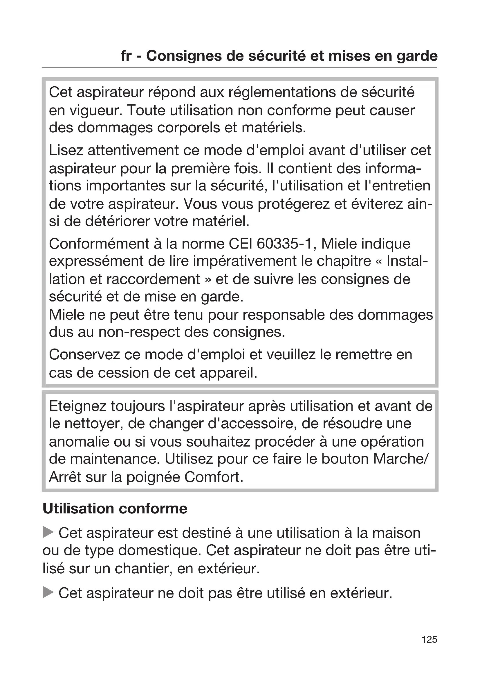 Cet aspirateur répond aux réglementations de sécurité en vigueur. Toute utilisation non conforme peut causer des dommages corporels et matériels. Lisez attentivement ce mode d'emploi avant d'utiliser cet aspirateur pour la première fois. Il contient des informa- tions importantes sur la sécurité, l'utilisation et l'entretien de votre aspirateur. Vous vous protégerez et éviterez ain- si de détériorer votre matériel. Conformément à la norme CEI60335-1, Miele indique expressément de lire impérativement le chapitre «Instal- lation et raccordement» et de suivre les consignes de sécurité et de mise en garde. Miele ne peut être tenu pour responsable des dommages dus au non-respect des consignes. Conservez ce mode d'emploi et veuillez le remettre en cas de cession de cet appareil. Eteignez toujours l'aspirateur après utilisation et avant de le nettoyer, de changer d'accessoire, de résoudre une anomalie ou si vous souhaitez procéder à une opération de maintenance. Utilisez pour ce faire le bouton Marche/ Arrêt sur la poignéeComfort. Utilisation conforme Cet aspirateur est destiné à une utilisation à la maison ou de type domestique. Cet aspirateur ne doit pas être uti- lisé sur un chantier, en extérieur. Cet aspirateur ne doit pas être utilisé en extérieur.fr - Consignes de sécurité et mises en garde