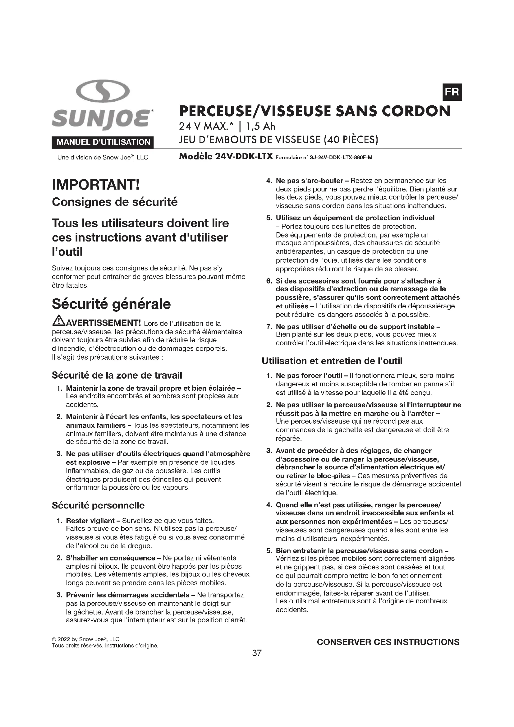 ESFR © 2022 by Snow Joe , LLCTous droits réservés. Instructions d’origine.