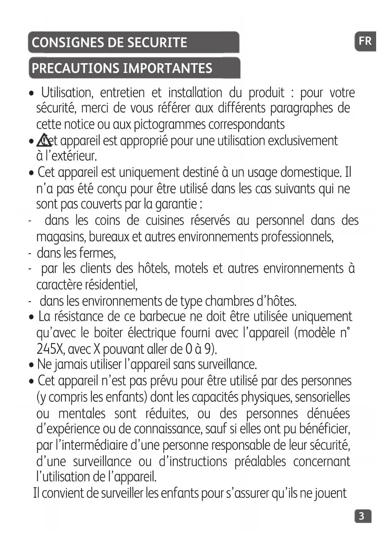 - La résistance de ce barbecue ne doit être utilisée uniquement qu’avec le boiter électrique fourni avec l’appareil (modèle n° 245X, avec X pouvant aller de 0 à 9).