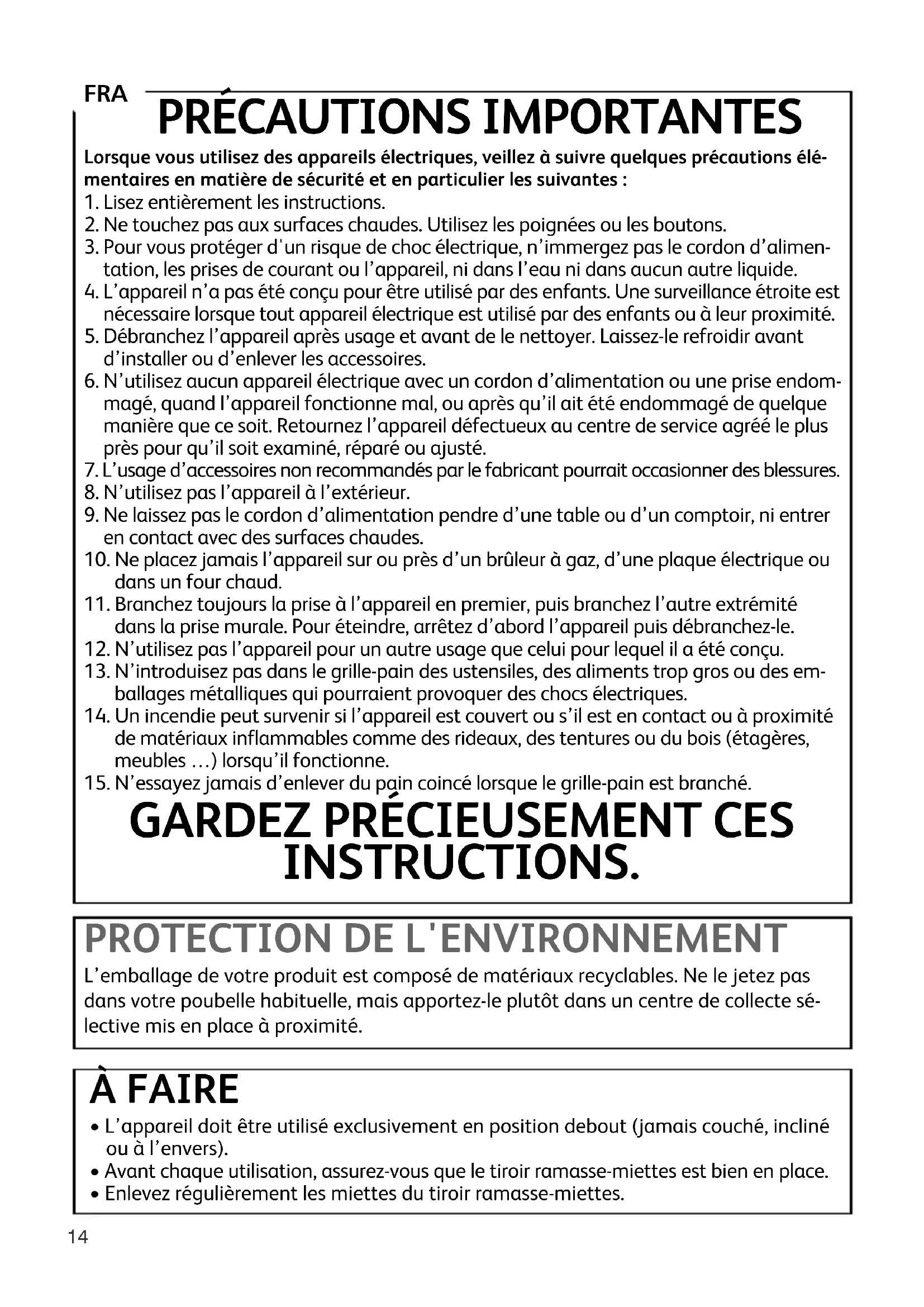 13. N’introduisez pas dans le grille-pain des ustensiles, des aliments trop gros ou des em-