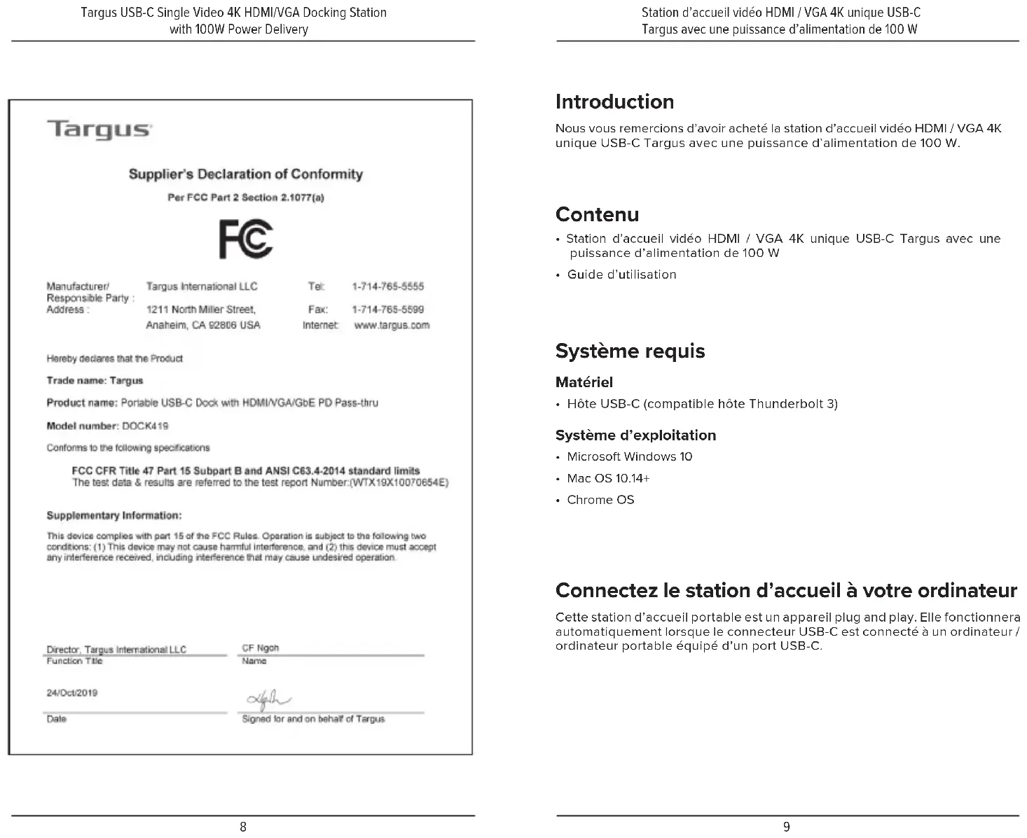 Product name: Portable USB-C Dock with HDMI/VGA/GbE PD Pass-thru Model no. : DOCK419 Sku no. : DOCK419USZ USB-C USB-C Single Video 4K HDMI/ VGA Docking Station with 100W Power Delivery Station d’accueil vidéo HDMI / VGA 4K unique USB-C avec une puissance d’alimentation de 100 W WPP User Guide Guide de l’utilisateur 2 Year Limited Warranty: We pride ourselves on the quality of our products. For complete warranty details and a list of our worldwide oces, please visit www. targus.com. Targus product warranty does not cover any device or product that is not manufactured by Targus (including, but not limited to, laptops, smartphones, devices, or any other product that may be used in connection with the Targus product). Australian customers: For complete warranty details see warranty statement enclosed. Targus is a registered trademark of Targus International LLC in the U.S. and in certain other countries. Microsoft, Windows, and Windows Vista are registered trademarks or trademarks of Microsoft Corporation in the United States and/or other countries. Mac is a trademark of Apple Inc., registered in the U.S. and other countries. All logos and registered trademarks are the property of their respective owners. ©2019 Targus, 1211 North Miller Street, Anaheim, CA 92806. All rights reserved. Garantie limitée de 2 ans : La qualité de nos produits fait notre fierté. Pour plus de renseignements sur la garantie complète et une liste de nos bureaux à travers le monde, veuillez consulter www.targus.com. La garantie sur les produits Targus ne couvre pas les appareils ni les produits qui ne sont pas fabriqués par Targus (y compris, sans toutefois y être limité, les ordinateurs portables, les téléphones portables, et autres dispositifs et produits qui peuvent être utilisés en conjonction avec un produit Targus). Clients de l’Australie: Pour consulter tous les détails de la garantie, consultez l’énoncé de garantie ci-joint. Targus est une marque déposée de Targus International LLC aux États-Unis et dans certains autres pays. Microsoft, Windows, et Windows Vista sont des marques de commerce enregistrées ou des marques de commerce de Microsoft Corporation aux États-Unis et/ou dans d’autres pays. Mac est une marque de commerce de Apple Inc., enregistrée aux États-Unis et dans d’autres pays. Tous les logos et marques de commerce enregistrées sont la propriété exclusive de leurs propriétaires respectifs. ©2019 Targus, 1211 North Miller Street, Anaheim, CA 92806. Tous droits réservés.32 Introduction Thank you for your purchase of the Targus USB-C Single Video 4K HDMI/VGA Docking Station with 100W Power Delivery. Contents