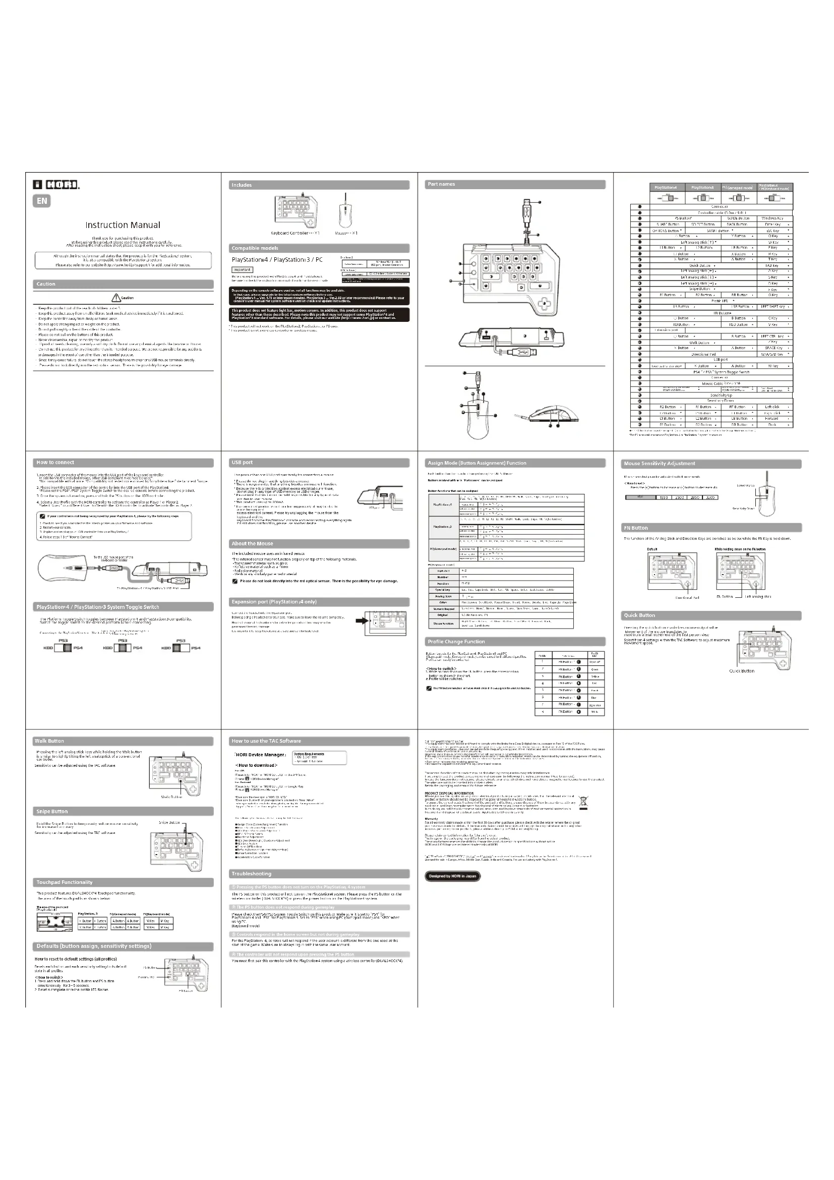 ②LeBoutonPSnerépondpaspendantquejejoueMercidevérifierl'interrupteurPS4/PS3deceproduit.Assurez-vousquel'interrupteurestbiensurPS4pourvotrePlaystation 4etPS3pourvotrePlaystation 3.Mettreégalementl'interrupteurenpositionPS3lorsquevousutilisezunPC(Modemanette)etKBDlorsquevousutilisezunPC③Lamanettefonctionnedanslemenud'accueilmaispaspendantlaphasedejeuPourlaPlaystation 4,lamanettenefonctionnerapassileprofilutiliséestdifférentdeceluiutilisélorsducommencementdujeu.Assurez-vousdetoujoursêtreconnectéaveclemêmeprofil.④Lamanettenerépondpaslorsquej'appuiesurleboutonPSVousdevezd'abordappareillercettemanetteaveclaPlaystation 4enutilisantunemanetteDualshock®4Lafonctionnormalduproduitpeut-êtreperturbéepardeforteinterférenceélectromagnétique.Sitelestlecas,réinitialisezsimplementleproduitpourqu'ilreprennesonfonctionnementnormalenensuivantlemanueld'instructions(Commentseconnecter). Danslecasoulesfonctionsneseréinitialisentpas,mercid'utiliserleproduitdansunenvironnementsansinterférences électromagnétique.Lesfilsnedoiventpasêtreinsérésdansdesprisesdecourant.Conserverl'emballageetlemanuelpourunefutureconsultation.Veuillezconservezlesinformationsdecontactpourtouteréférenceultérieure.L'imagesurl'emballagepeut-ëtredifférenteduproduitréel.Lefabricantseréserveledroitdechangerledesignduproduitoulescaractéristiquestechniquesanspréavis.HORIetlelogosontdesmarquesdéposéesdeHORI.GarantiePourtouteréclamationfaitesdansles30jourssuivantl'achat,mercidevérfieravecvotrerevendeurouleproduitàétéachetépourplusd'information.Silaréclamationdegarantienepeutêtreeffectuéauprèsdu revendeuroriginaloupourtoutautredemandeconcernantnosproduits,mercidecontacterdirectementHORIàinfoeu@hori.jp. INFORMATIONSSURLADESTRUCTIONDUPRODUITLesymboleci-dessussignifieque,conformémentauxloisetréglementationslocales,vousdevezmettreaurebutvotreproduitet/ousabatterieséparémentdesorduresménagères.Lorsqueceproduitnʼestplusutilisable,portez-ledansuncentredecollectedesdéchetsagrééparlesautoritéslocales.Lacollecteetlerecyclageséparédevotreproduitet/oudesabatterielorsdelʼéliminationpermettentdepréserverlesressourcesnaturellesetdeprotégerlʼenvironnementetlasantédesêtreshumains.. “”,”PlayStation”,“DUALSHOCK”,“”et“”sontdesmarquescommercialesdéposéesdeSonyInteractiveEntertainmentInc.Touslesdroitssont réservés. LicenciépourlaventeenEurope,Afrique,Moyen-Orient,Russie,IndeetOcéanie.PouruneutilisationuniquementsurPlayStation