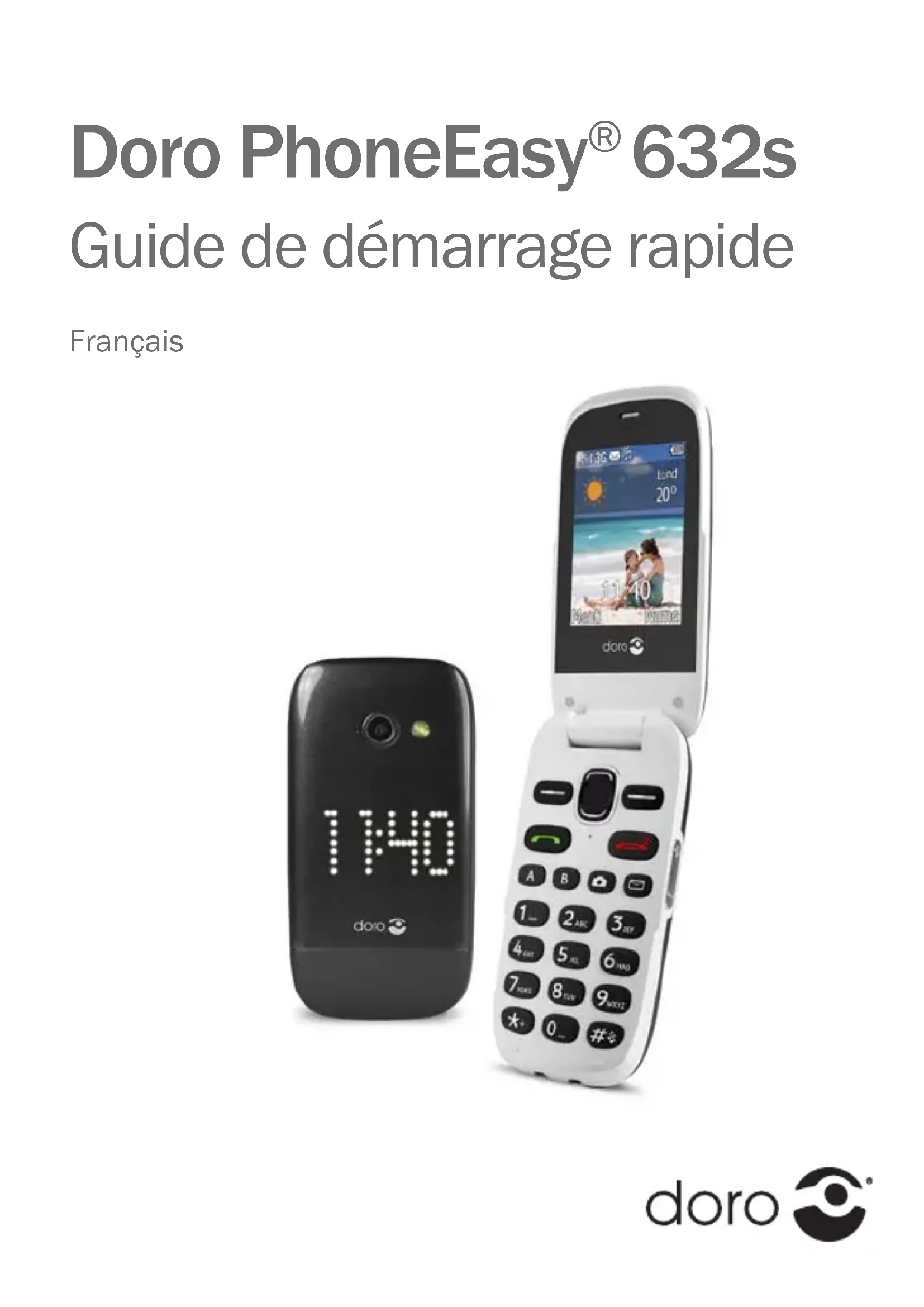 632s Guide de démarrage rapide FrançaisFÉLICITATIONS POUR VOTRE ACHAT ! Un téléphone qui est élégant et facile à utiliser. Appréciez la fonction e-mails, la messagerie vidéo, les mémoires directes et consultez la météo en temps réel. My Doro Manager inclus. Manuel complet Pour plus d’informations, consultez le manuel complet sur le site www.doro.fr/Support/ ou contacter notre service d’assistance téléphonique. Les articles fournis avec votre téléphone sont susceptibles de varier en fonction du logiciel et des accessoires disponibles dans votre région ou offerts par votre opérateur. Vous pouvez vous procurer des accessoires supplémentaires chez votre vendeur Doro local. Les accessoires fournis sont conçus pour fonctionner de manière optimale avec votre téléphone.