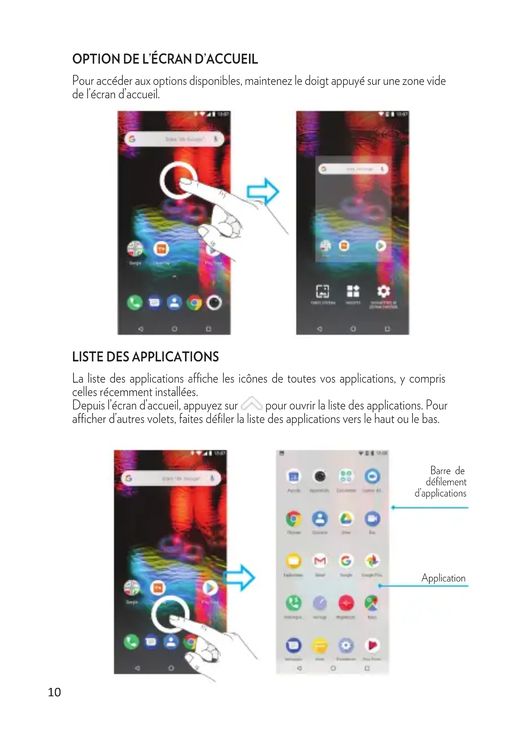 Insérez la carte SIM fournie par votre opérateur, puce orientée vers le bas. Installer la carte SIM, et la carte mémoire. Remettez le cache arrière en place7 Pour alimenter ou recharger votre produit, veuillez uniquement utiliser le chargeur secteur d’origine fourni dans le packaging. L’utilisation d’un char- geur non-conforme vous expose à des risques de brûlures ou d’électro- cution. En cas de dommage sur l’appareil dû à une mauvaise utilisation, la garantie sera annulée. Nous vous conseillons d’eectuer des charges complètes lors des 3 premiers temps de charge. Ne jamais laisser la batterie se décharger complètement, les décharges complètes (en dessous de 10%) causent des dommages à la batterie, ce qui l’usera prématurément. Comme il s’agit de batterie lithium-ion, vous pouvez faire des charges partielles, sans que cela l’endommage Note : Afin d’éviter un éventuel dommage électrique, merci d’utiliser uniquement le chargeur secteur livré avec votre produit ou un chargeur d’origine Danew afin de recharger l’appareil. Pour allumer l’appareil, maintenez la touche Marche/Arrêt enfoncée pendant quelques secondes. Si vous allumez votre appareil pour la première fois ou après avoir réinitialisé les paramètres, suivez les instructions à l’écran pour configurer votre appareil. Pour éteindre l’appareil, maintenez la touche Marche/Arrêt enfoncée, puis appuyez sur Éteindre. Lorsque vous appuyez sur la touche Marche/Arrêt, l’écran s’éteint et se verrouille. De même, si vous n’utilisez pas l’appareil pendant un certain temps, l’écran s’éteint et se verrouille. Pour déverrouiller l’appareil, appuyez sur la touche Marche/Arrêt ou sur la touche Accueil, puis faites glisser votre doigt sur l’écran dans le sens de votre choix. Charger la baerie Allumer et éteindre l’appareil Verrouiller et déverrouiller l’écran10 La liste des applications ache les icônes de toutes vos applications, y compris celles récemment installées. Depuis l’écran d’accueil, appuyez sur pour ouvrir la liste des applications. Pour acher d’autres volets, faites défiler la liste des applications vers le haut ou le bas. Application Barre de défilement d’applications Pour accéder aux options disponibles, maintenez le doigt appuyé sur une zone vide de l’écran d’accueil.