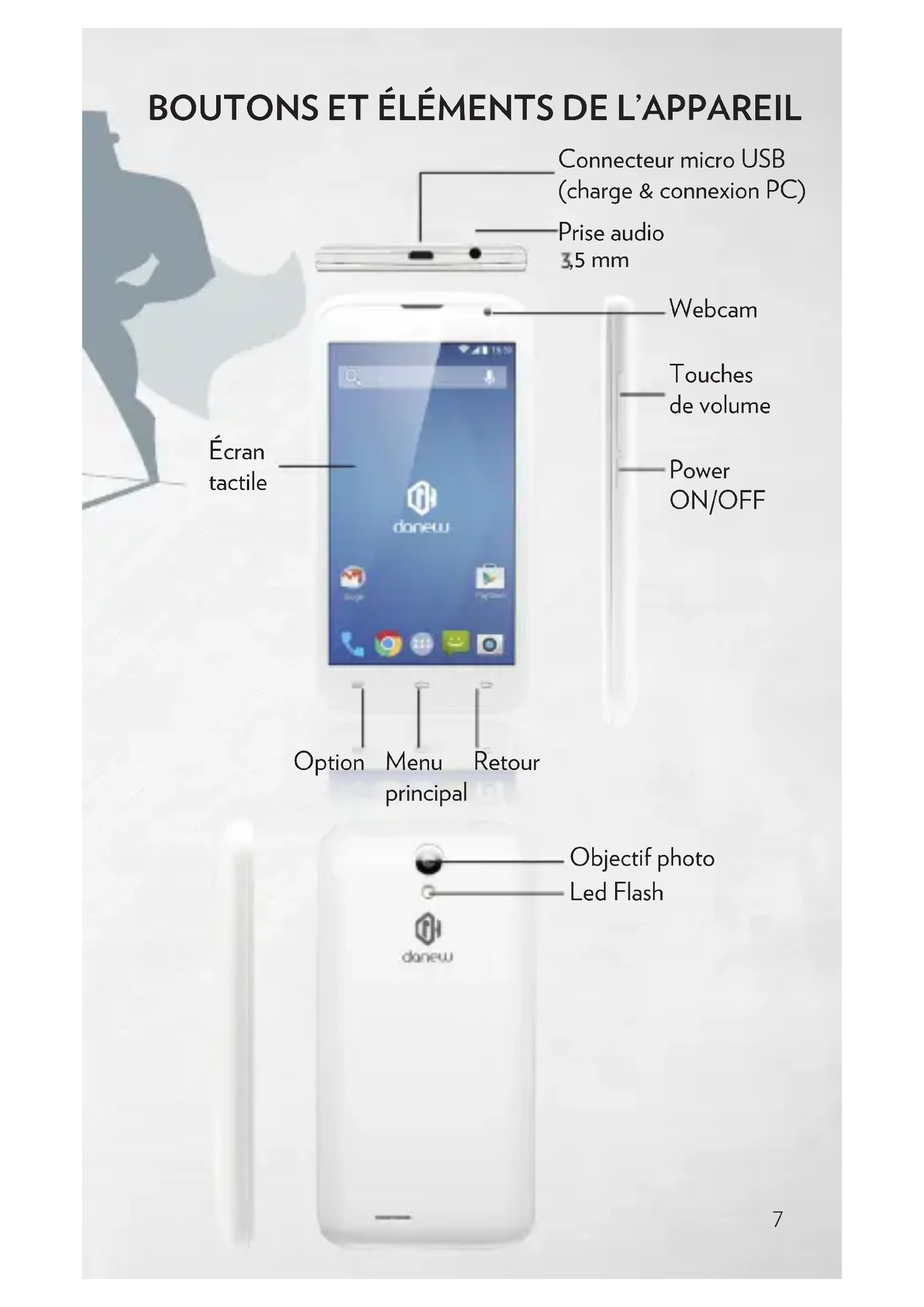 4Chargement des baeries Chargez votre appareil mobile Danew à l’aide d’un chargeur Danew compable, ou d’un port USB haute tension sur PC. Les chargeurs non conformes peuvent être dangereux, entraîner un chargement lent, endommager le produit ou réduire la performance de l’appareil.