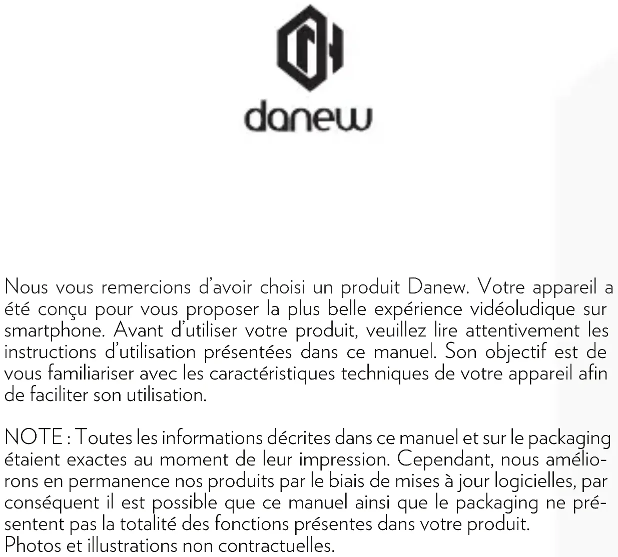 - Informaons de localisaon : les appareils mobiles dotés des technologies de localisaon comme le GPS, l’AGPS ou le Wi-Fi peuvent transmere des informaons de localisaon. Voir la secon « Services de localisaon » pour plus d’informaons. Appareils mobiles et accessoires Ne jetez aucun appareil mobile ou accessoire électrique, tel qu’un chargeur, un kit piéton ou une baerie, dans votre poubelle. Averssement : ne jetez jamais au feu vos baeries, seules ou dans un appareil mobile, car elles risqueraient d’exploser. Les appareils mobiles et les accessoires électriques doivent être mis au rebut de manière appropriée Mise au rebut et recyclage29 conformément aux systèmes de collecte et de recyclage mis en place dans votre pays ou région. Ce produit est conforme à la direcve RoHS. L’emballage du produit et les manuels doivent seulement être mis au re- but conformément aux systèmes de collecte et de recyclage mis en place dans votre pays. Pour plus d’informaons, veuillez contacter les autorités compétentes. Pour les mises à jour «micro logiciel» du produit, nous vous invitons à vous rendre sur le site www.danew.com dans la rubrique Support et Pilotes & Manuels. Rendez-vous sur le site www.danew.com dans la rubrique Enregistrement produit. Pour les demandes de SAV, le service technique doit être contacté an d’ob- tenir le numéro d’autorisaon de retour RMA. Aucun retour ne sera accepté sans numéro RMA obtenu au préalable. Danew se réserve le droit de s’as- surer que le dysfonconnement de l’appareil n’est pas dû à une mauvaise ulisaon ou manipulaon par l’ulisateur. SERVICE TECHNIQUE 0899 782 278 (France), Notre équipe technique apportera les réponses à vos questions : - du lundi au jeudi de 9h à 13h et de 14h à 18h - Le Vendredi de 9h à 13h et de 14h à 17h Emballage et manuels du produit Support et garane* *Produit garanti 1 an et accessoires garantis 1 mois à compter de votre date d’achat.30