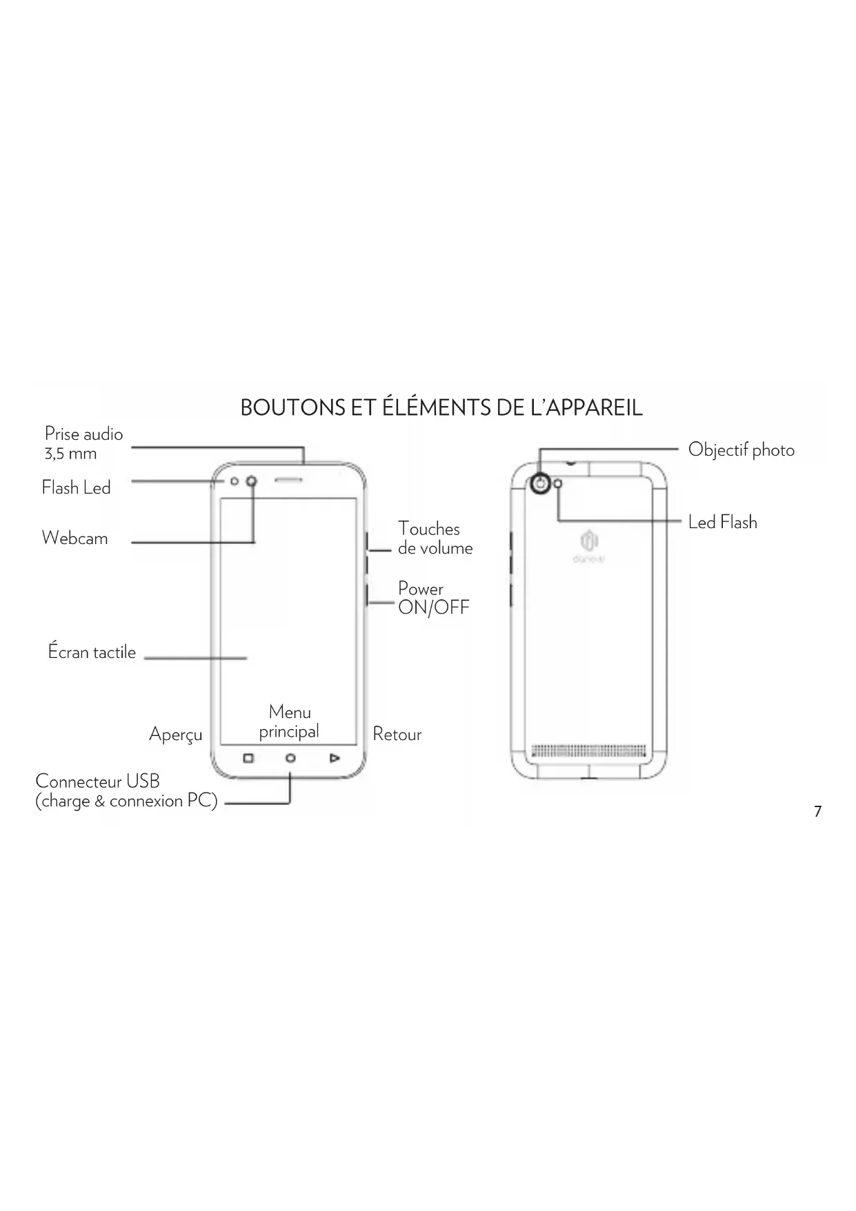 - épaisseur minimum retenue7 BOUTONS ET ÉLÉMENTS DE L’APPAREIL Prise audio 3,5 mm Connecteur USB (charge & connexion PC) Écran tactile Led Flash Objectif photo Touches de volume Webcam Flash Led Power ON/OFF Aperçu Menu principal Retour8 PREMIER PAS
