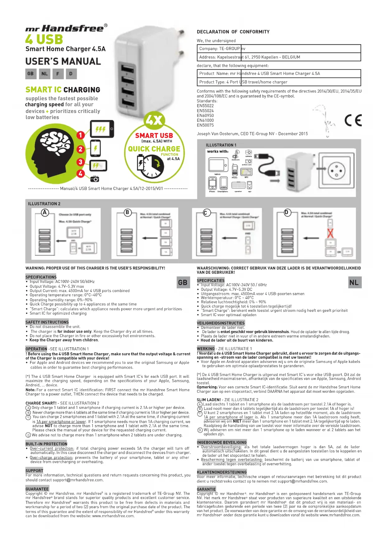 - Le chargeur a été conçu pour être utilisé à l’intérieur uniquement. Gardez le chargeur au sec en tout temps.• Ne placez pas le chargeur dans le feu ou d’autres environnements excessivement chauds.• Gardez le chargeur hors de la portée des enfants.FONCTIONNEMENT - VOIR ILLUSTRATION 1 ! Avant d’utiliser le 4 USB Smart Home Charger, assurez-vous que la tension et le courant de sortie du chargeur est compatible avec votre appareil!• Pour les appareils Apple et Android nous vous recommandons d’utiliser les câbles Samsung ou Apple d’origine afin de garantir les meilleures performances de charge.(*) Le 4 USB Smart Home Charger est doté de Smart IC pour chaque port USB. Il permet de maximiser la vitesse de charge, en fonction des spécifications de votre appareil Apple, Samsung, Android... Remarque: Pour une identification Smart IC correcte: D’ABORD connecter le mr Handsfree Smart Home Charger à une prise de courant, PUIS connecter l’appareil qui doit être chargé.CHARGEMENT INTELLIGENT! - VOIR ILLUSTRATION 2 A. Ne rechargez qu’une tablette et 1 smartphone si le courant de charge de chaque appareil est de 2.1A ou supérieur.B. Ne chargez jamais plus de 4 tablettes en même temp si le courant de charge de chaque tablette est de 1A ou supérieur. C. Vous pouvez charger 2 smartphones et 1 tablette de 2.1A en même temps, si le courant de charge de chaque smartphone est de 1A ou inférieure. Si un des smartphones a besoin d’un courant de charge de plus de 1A, nous vous conseillons de ne PAS charger plus de 1 smartphone et 1 tablette de 2.1A en même temps. Veuillez consulter le manuel de votre appareil pour plus d’informations concernant le courant de charge requis. D. Nous vous conseillons de ne pas charger plus d’un smartphone lors du chargement de 2 tablettes.PROTECTION INTEGRÉE• Protection contre les surtensions: si la puissance de charge totale dépasse 5A, le chargeur s’éteint automatiquement. Dans ce cas, débranchez les appareils du chargeur et retirez le chargeur de la prise.• Protection contre les surcharges: protège la batterie de votre smartphone, tablette ou de toute autre périphérique contre la surcharge ou la surchauffe. SUPPORT DE CLIENTSPour plus d’informations, des questions techniques ou des demandes de retour concernant ce produit, il faut contacter support@mrhandsfree.com. GARANTIECopyright © mr Handsfree . mr Handsfree est une marque déposée de TE-Group NV. La marque de mr Handsfree est synonyme de produits de qualité supérieure et d’un service après-vente excellent. C’est la raison pour laquelle mr Handsfree garantit ce produit contre tout défaut de matériel ou de fabrication pour une période de deux (2) ans à compter de la date d’achat initiale. Pour connaître les conditions générales de cette garantie et l’étendue des responsabilités de mr Handsfree au titre de cette garantie, consultez notre site web www.mrhandsfree.com. FR D ACHTUNG: KORREKTE NUTZUNG DIESES LADEGERÄT IST DER VERANTWORTUNG DES BENUTZERS!TECHNISCHE DATEN• Eingangsspannung: AC100V-240V 50/60Hz• Ausgangsspannung: 4,57~5,3V DC• Ausgangsstrom: max. 4500mA für 4 USB-Ports zusammen• Betriebstemperaturbereich: 0 °C ~ 40 °C• Luftfeuchtigkeitsbereich: 0% ~ 90%• Schnell-Ladung bis zu vier Geräte gleichzeitig möglich!• “Smart Charge” : berechnet welche Geräte dringenden aktuellen Bedürfnisse brauchen und priorisiert • Smart IC für optimalisierten AufladungSICHERHEITSHINWEISE• Das Gerät nicht demontieren.