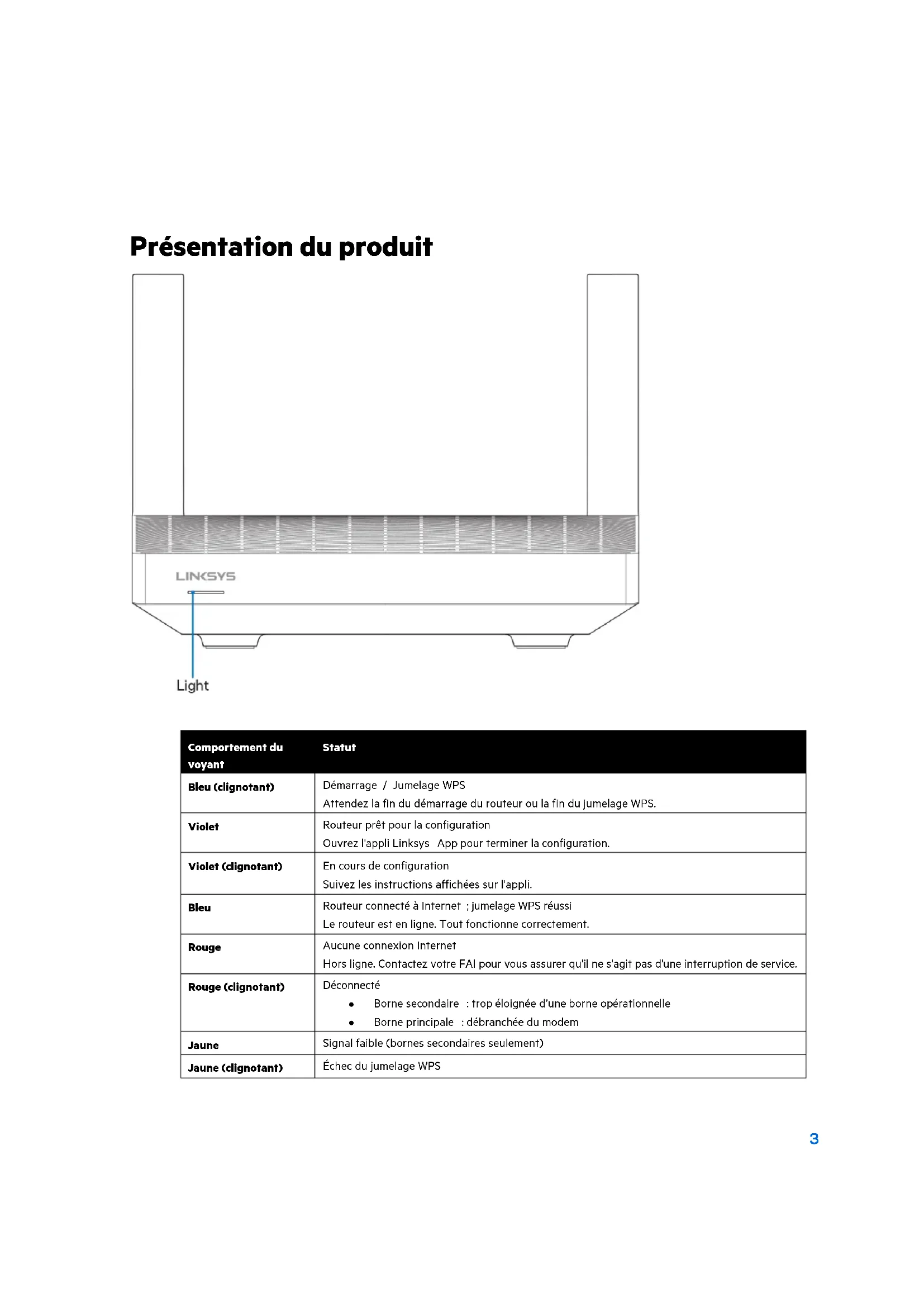Comportement du voyant Statut Bleu (clignotant) Démarrage / Jumelage WPS Attendez la fin du démarrage du routeur ou la fin du jumelage WPS. Violet Routeur prêt pour la configuration Ouvrez l'appli Linksys App pour terminer la configuration. Violet (clignotant) En cours de configuration Suivez les instructions affichées sur l'appli. Bleu Routeur connecté à Internet ; jumelage WPS réussi Le routeur est en ligne. Tout fonctionne correctement. Rouge Aucune connexion Internet Hors ligne. Contactez votre FAI pour vous assurer qu'il ne s'agit pas d'une interruption de service. Rouge (clignotant) Déconnecté