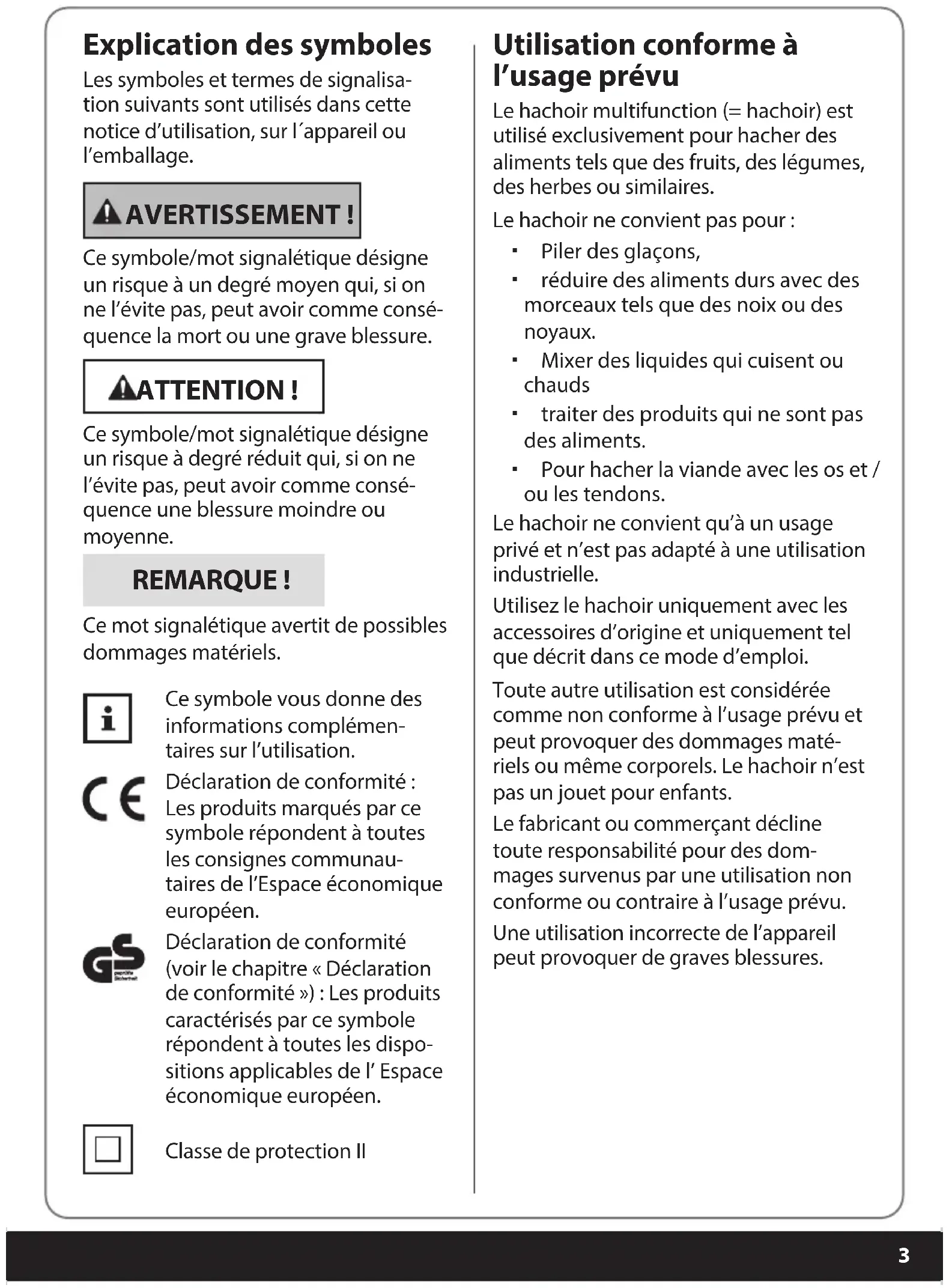 Explication des symboles Les symboles et termes de signalisa- tion suivants sont utilisés dans cette notice d’utilisation, sur l´appareil ou l’emballage. AVERTISSEMENT ! Ce symbole/mot signalétique désigne un risque à un degré moyen qui, si on ne l’évite pas, peut avoir comme consé- quence la mort ou une grave blessure. ATTENTION ! Ce symbole/mot signalétique désigne un risque à degré réduit qui, si on ne l’évite pas, peut avoir comme consé- quence une blessure moindre ou moyenne. REMARQUE ! Ce mot signalétique avertit de possibles dommages matériels. Ce symbole vous donne des informations complémen- taires sur l’utilisation. Déclaration de conformité : Les produits marqués par ce symbole répondent à toutes les consignes communau- taires de l’Espace économique européen. Déclaration de conformité (voir le chapitre « Déclaration de conformité ») : Les produits caractérisés par ce symbole répondent à toutes les dispo- sitions applicables de l’ Espace économique européen. Classe de protection II Utilisation conforme à l’usage prévu Le hachoir multifunction (= hachoir) est utilisé exclusivement pour hacher des aliments tels que des fruits, des légumes, des herbes ou similaires. Le hachoir ne convient pas pour : Piler des glaçons, réduire des aliments durs avec des morceaux tels que des noix ou des noyaux. Mixer des liquides qui cuisent ou chauds traiter des produits qui ne sont pas des aliments. Pour hacher la viande avec les os et / ou les tendons. Le hachoir ne convient qu’à un usage privé et n’est pas adapté à une utilisation industrielle. Utilisez le hachoir uniquement avec les accessoires d’origine et uniquement tel que décrit dans ce mode d’emploi. Toute autre utilisation est considérée comme non conforme à l’usage prévu et peut provoquer des dommages maté- riels ou même corporels. Le hachoir n’est pas un jouet pour enfants. Le fabricant ou commerçant décline toute responsabilité pour des dom- mages survenus par une utilisation non conforme ou contraire à l’usage prévu. Une utilisation incorrecte de l’appareil peut provoquer de graves blessures. Druckbuch MiniHacker FR.indb 3Druckbuch MiniHacker FR.indb 3 30.06.2022 11:10:5630.06.2022 11:10:564 Consignes de sécurité AVERTISSEMENT ! Risque d’électrocution ! Une installation électrique défectueuse ou une tension de secteur trop élevée peut pro- voquer un choc électrique. Ne branchez le hachoir que si la tension de secteur de la prise électrique correspond aux indications mention- nées sur la plaque signalé- tique. Ne branchez le hachoir que sur une prise électrique bien accessible an de pou- voir le couper rapidement du secteur électrique en cas de panne. N’utilisez pas le hachoir si’il présente des dommages visibles ou si le câble élec- trique ou la che réseau sont défectueux. Ne branchez jamais le ha- choir en même temps avec d’autres appareils sur un bloc multiprises. Lorsque le câble électrique du hachoir est endommagé, il doit être remplacé par le fabricant, son SAV ou une personne de qualication similaire pour éviter tout dommage. N’ouvrez pas le boîtier, faites eectuer la réparation par des professionnels. Adres- sez-vous pour ceci à un atelier de professionnels. En cas de réparations de sa propre initiative, de bran- chement non conforme ou d’utilisation incorrecte, tous droits de responsabilité et de garantie sont exclus. Seules des pièces détachées correspondant à l’appareil d’origine pourront être utilisées lors de réparations. Dans ce hachoir se trouvent des pièces électriques et mécaniques indispensables pour la protection contre des sources de risque. N’utilisez pas le hachoir avec une minuterie externe ou avec un système d’en- clenchement à distance séparé. Ne plongez ni le hachoir ni le câble électrique ou la che réseau dans de l’eau ou d’autres liquides. Placez le hachoir de telle manière qu’aucun liquide ne puisse passer sur la che de raccordement de l’appa- reil. Druckbuch MiniHacker FR.indb 4Druckbuch MiniHacker FR.indb 4 30.06.2022 11:10:5630.06.2022 11:10:565