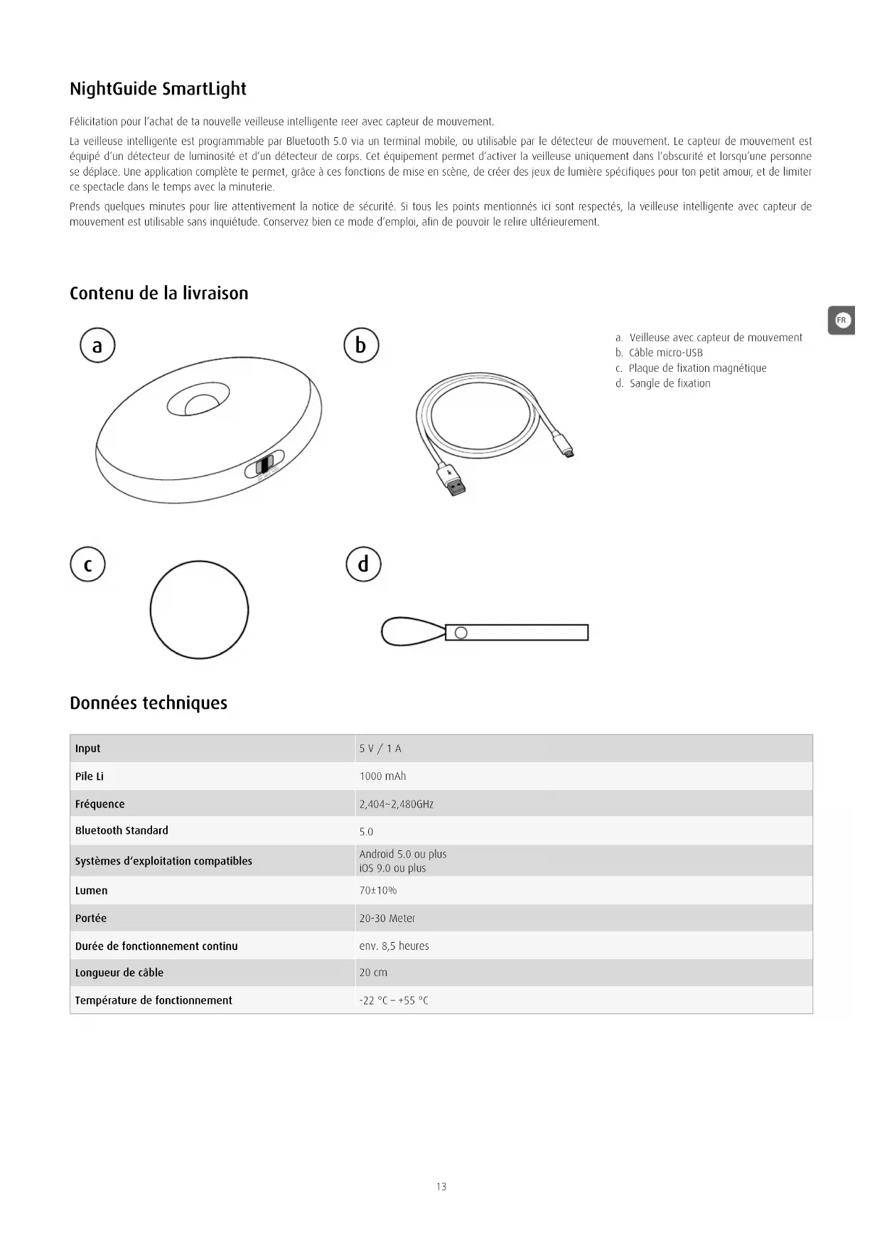 Systèmes d‘exploitation compatibles Android 5.0 ou plus iOS 9.0 ou plus Lumen 70±10% Portée 20-30 Meter Durée de fonctionnement continu env. 8,5heures Longueur de câble 20 cm Température de fonctionnement -22 °C – +55 °C Données techniques NightGuide SmartLight Félicitation pour l‘achat de ta nouvelle veilleuse intelligente reer avec capteur de mouvement. La veilleuse intelligente est programmable par Bluetooth5.0 via un terminal mobile, ou utilisable par le détecteur de mouvement. Le capteur de mouvement est équipé d‘un détecteur de luminosité et d‘un détecteur de corps. Cet équipement permet d‘activer la veilleuse uniquement dans l‘obscurité et lorsqu‘une personne se déplace. Une application complète te permet, grâce à ces fonctions de mise en scène, de créer des jeux de lumière spécifiques pour ton petit amour, et de limiter ce spectacle dans le temps avec la minuterie. Prends quelques minutes pour lire attentivement la notice de sécurité. Si tous les points mentionnés ici sont respectés, la veilleuse intelligente avec capteur de mouvement est utilisable sans inquiétude. Conservez bien ce mode d‘emploi, afin de pouvoir le relire ultérieurement. Contenu de la livraison a. Veilleuse avec capteur de mouvement b. Câble micro-USB c. Plaque de fixation magnétique d. Sangle de fixation