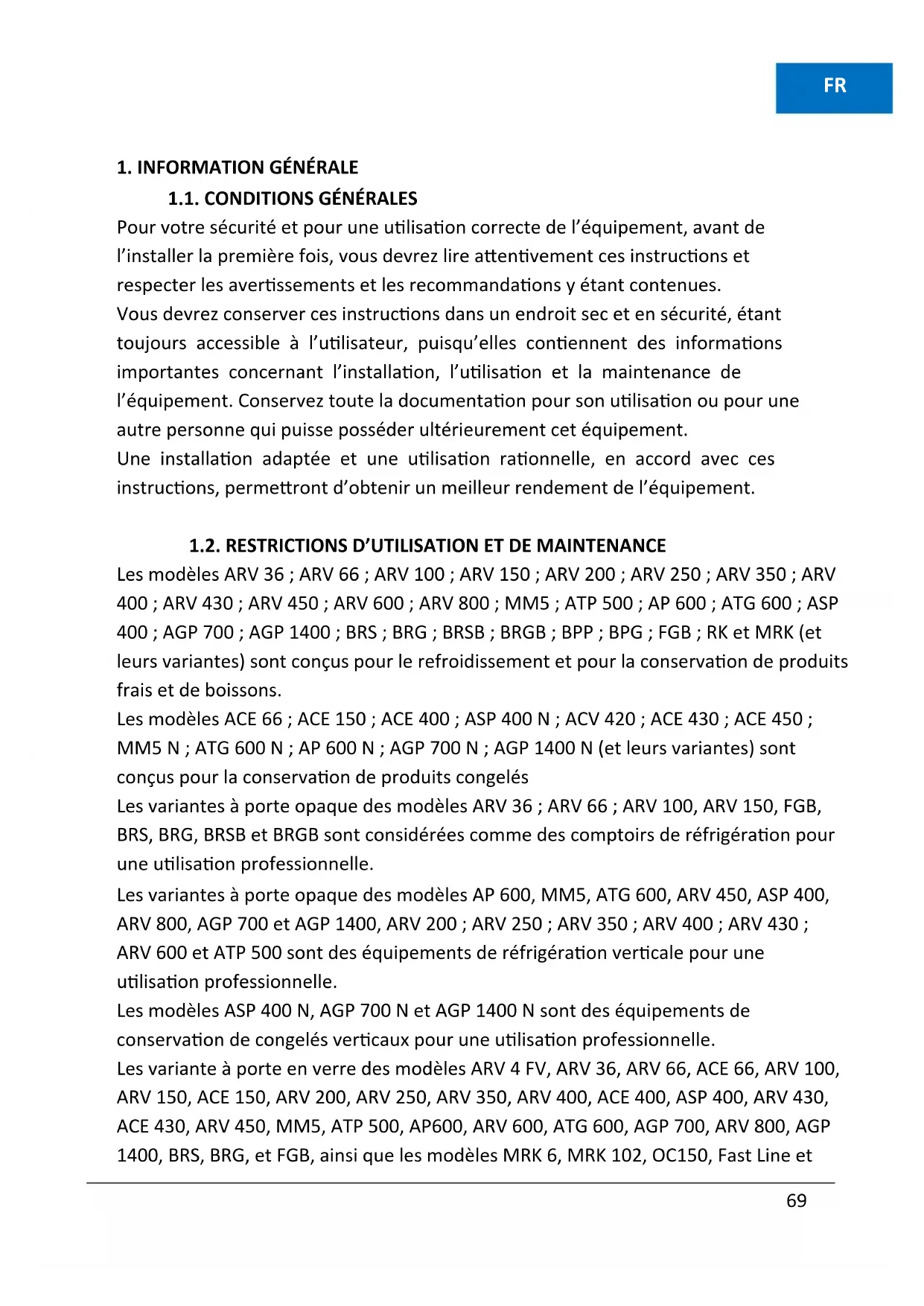 Les modèles ARV 36 ; ARV 66 ; ARV 100 ; ARV 150 ; ARV 200 ; ARV 250 ; ARV 350 ; ARV 400 ; ARV 430 ; ARV 450 ; ARV 600 ; ARV 800 ; MM5 ; ATP 500 ; AP 600 ; ATG 600 ; ASP 400 ; AGP 700 ; AGP 1400 ; BRS ; BRG ; BRSB ; BRGB ; BPP ; BPG ; FGB ; RK et MRK (et leurs variantes) sont conçus pour le refroidissement et pour la conservation de produits frais et de boissons. Les modèles ACE 66 ; ACE 150 ; ACE 400 ; ASP 400 N ; ACV 420 ; ACE 430 ; ACE 450 ; MM5 N ; ATG 600 N ; AP 600 N ; AGP 700 N ; AGP 1400 N (et leurs variantes) sont conçus pour la conservation de produits congelés Les variantes à porte opaque des modèles ARV 36 ; ARV 66 ; ARV 100, ARV 150, FGB, BRS, BRG, BRSB et BRGB sont considérées comme des comptoirs de réfrigération pour une utilisation professionnelle. Les variantes à porte opaque des modèles AP 600, MM5, ATG 600, ARV 450, ASP 400, ARV 800, AGP 700 et AGP 1400, ARV 200 ; ARV 250 ; ARV 350 ; ARV 400 ; ARV 430 ; ARV 600 et ATP 500 sont des équipements de réfrigération verticale pour une utilisation professionnelle. Les modèles ASP 400 N, AGP 700 N et AGP 1400 N sont des équipements de conservation de congelés verticaux pour une utilisation professionnelle. Les variante à porte en verre des modèles ARV 4 FV, ARV 36, ARV 66, ACE 66, ARV 100, ARV 150, ACE 150, ARV 200, ARV 250, ARV 350, ARV 400, ACE 400, ASP 400, ARV 430, ACE 430, ARV 450, MM5, ATP 500, AP600, ARV 600, ATG 600, AGP 700, ARV 800, AGP 1400, BRS, BRG, et FGB, ainsi que les modèles MRK 6, MRK 102, OC150, Fast Line et70