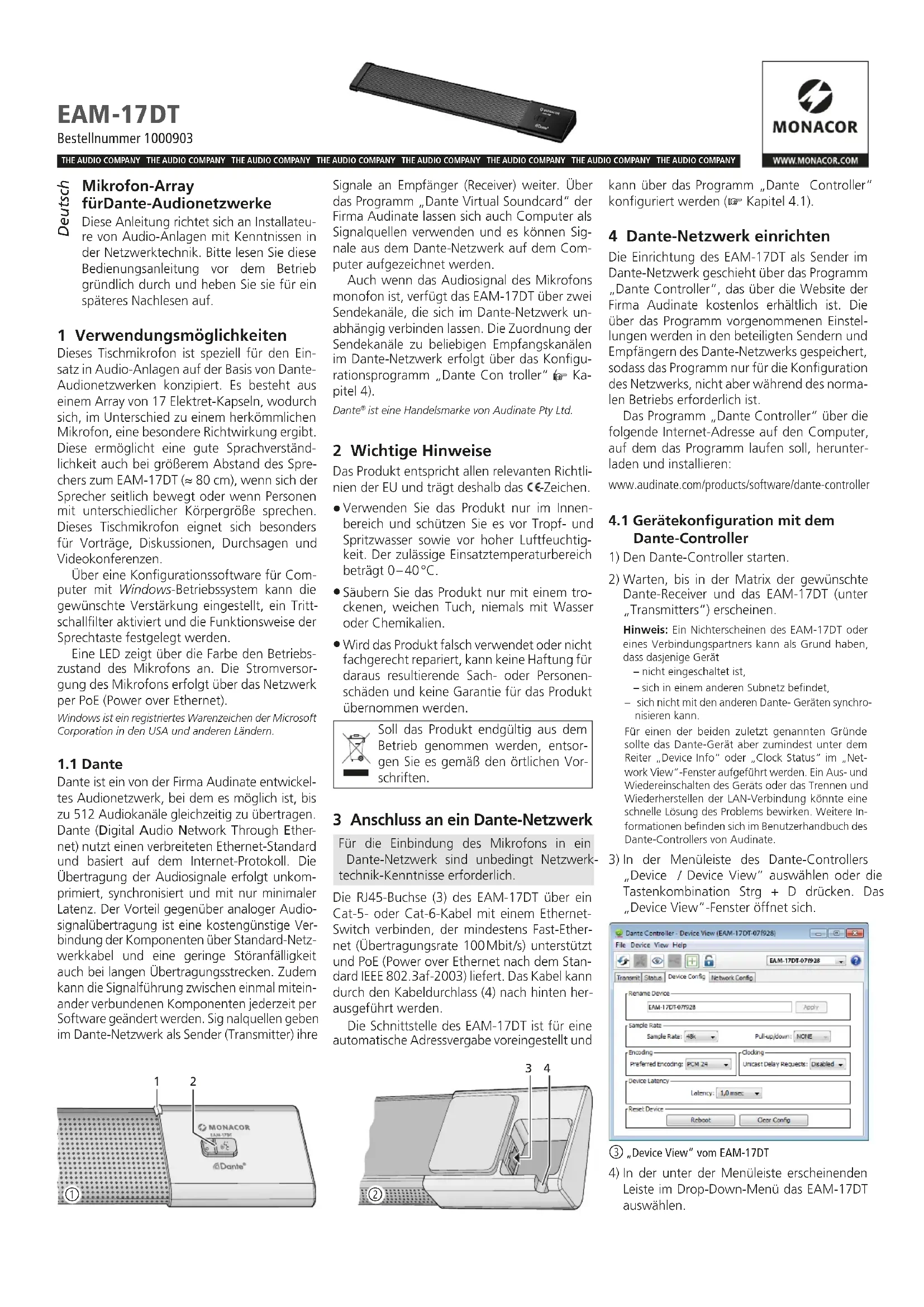 Dante est un réseau audio développé par la société Audinate avec lequel il est possible de transmettre simultanément jusqu’à 512 canaux audio. Dante (Digital Audio Networt Through Ethernet) utilise un standard Ethernet répandu et se base sur le protocole internet. La trans- mission des signaux audio se faite de manière non compressée, synchronisée avec une la- tence minimale. L’avantage par rapport à une transmission analogique de signal audio est la connexion des composants via un câble réseau standard à un prix faible et une faible sensibi- lité aux interférences même pour de longues distances. De plus, la transmission du signal entre les composants reliés entre eux peut à tout moment être modifiée via le logiciel. Dans le réseau Dante, les sources de signal servent d’émetteurs (transmitters) et transmettent ou Cat-6. Le câble peut être sorti à l’arrière par le passage de câble (4). L’interface de l’EAM-17DT est préréglée pour une attribution automatique des adresses et peut être configurée via le programme « Dante Controller » (