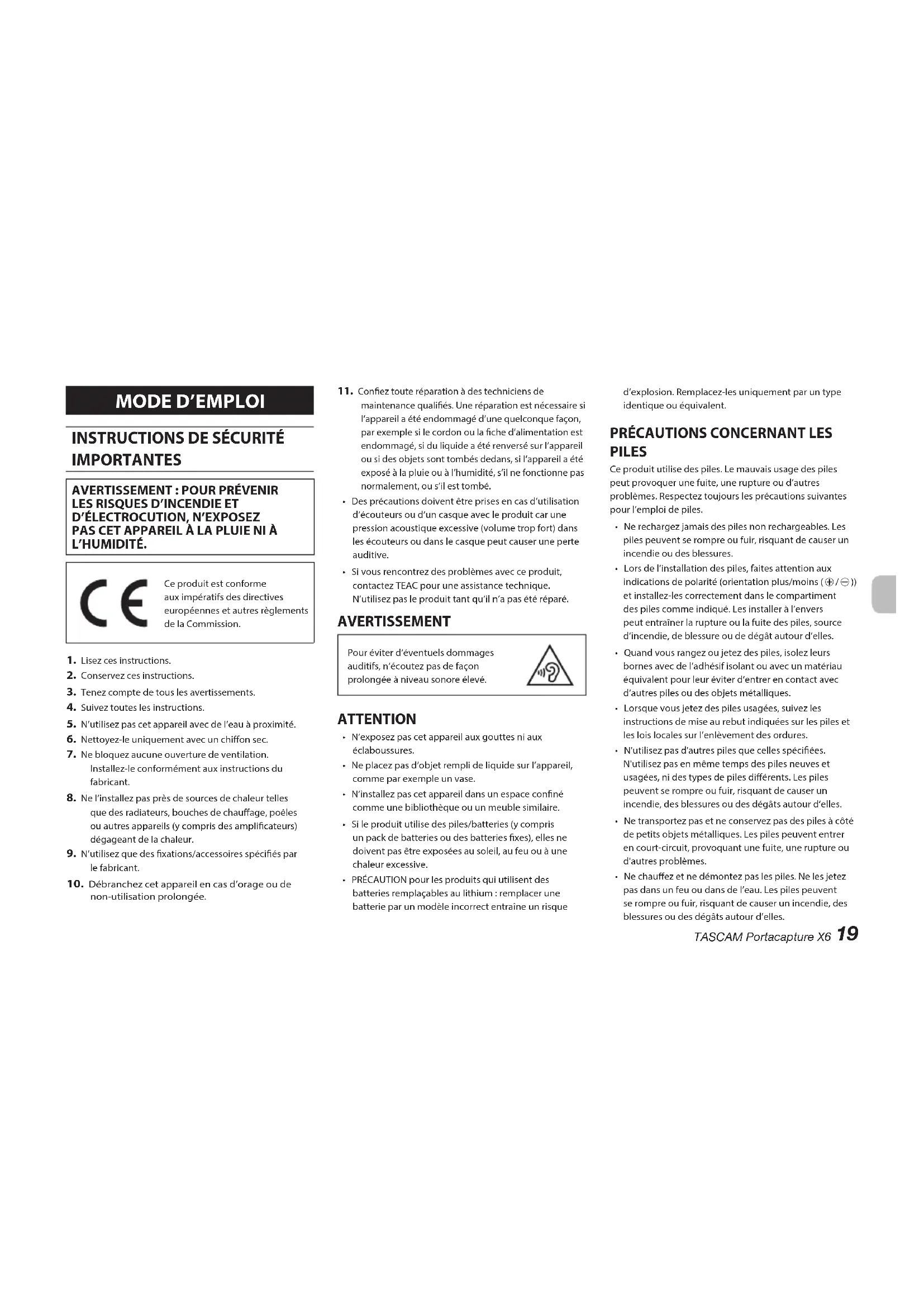 PILES Ce produit utilise des piles. Le mauvais usage des piles peut provoquer une fuite, une rupture ou d’autres problèmes. Respectez toujours les précautions suivantes pour l’emploi de piles.• Ne rechargez jamais des piles non rechargeables. Les piles peuvent se rompre ou fuir, risquant de causer un incendie ou des blessures.• Lors de l’installation des piles, faites attention aux indications de polarité (orientation plus/moins (¥/^)) et installez-les correctement dans le compartiment des piles comme indiqué. Les installer à l’envers peut entraîner la rupture ou la fuite des piles, source d’incendie, de blessure ou de dégât autour d’elles.• Quand vous rangez ou jetez des piles, isolez leurs bornes avec de l’adhésif isolant ou avec un matériau équivalent pour leur éviter d’entrer en contact avec d’autres piles ou des objets métalliques.• Lorsque vous jetez des piles usagées, suivez les instructions de mise au rebut indiquées sur les piles et les lois locales sur l’enlèvement des ordures.• N'utilisez pas d'autres piles que celles spéciées. N'utilisez pas en même temps des piles neuves et usagées, ni des types de piles diérents. Les piles peuvent se rompre ou fuir, risquant de causer un incendie, des blessures ou des dégâts autour d’elles.• Ne transportez pas et ne conservez pas des piles à côté de petits objets métalliques. Les piles peuvent entrer en court-circuit, provoquant une fuite, une rupture ou d'autres problèmes.• Ne chauez et ne démontez pas les piles. Ne les jetez pas dans un feu ou dans de l’eau. Les piles peuvent se rompre ou fuir, risquant de causer un incendie, des blessures ou des dégâts autour d’elles. TASCAM Portacapture X6 19• Si le liquide de la pile s’échappe, essuyez tout liquide répandu dans le boîtier des piles avant d’insérer de nouvelles piles. Si le liquide d’une pile touche un œil, il peut entraîner une perte de la vue. Dans ce cas, rincez abondamment à l’eau claire sans frotter l’œil et consultez immédiatement un médecin. Si le liquide touche le corps ou les vêtements d’une personne, il peut entraîner des blessures ou brûlures cutanées. Si cela se produit, rincez abondamment à l’eau claire puis consultez immédiatement un médecin.• L’alimentation de l’unité doit être coupée quand vous installez ou remplacez des piles.• Retirez les piles si vous envisagez de ne pas utiliser l’unité durant une période prolongée. Les piles peuvent se rompre ou fuir, risquant de causer un incendie, des blessures ou des dégâts autour d’elles. Si le liquide de la pile s’échappe, essuyez tout liquide répandu dans le boîtier des piles avant d’insérer de nouvelles piles.• Ne démontez pas une pile. L'acide qu'elle contient peut entraîner des blessures cutanées ou des dommages aux vêtements. Pour les consommateurs européens Mise au rebut des équipements électriques et électroniques et des piles et/ou accumulateurs (a) Tous les équipements électriques et électroniques et piles/accumulateurs hors d’usage doivent être traités séparément de la collecte municipale d’ordures ménagères dans des points de collecte désignés par le gouvernement ou les autorités locales.(b) En vous débarrassant correctement des équipements électriques/électroniques et piles/accumulateurs hors d’usage, vous contribuerez à la sauvegarde de précieuses ressources et à la prévention de potentiels eets négatifs sur la santé humaine et l’environnement.(c) Le traitement incorrect des équipements électriques/électroniques et piles/accumulateurs hors d’usage peut avoir des eets graves sur l’environnement et la santé humaine en raison de la présence de substances dangereuses dans les équipements.(d) Le symbole de déchets d’équipements électriques et électroniques (DEEE), qui représente une poubelle à roulettes barrée d’une croix, indique que les équipements électriques/électroniques et piles/accumulateurs doivent être collectés et traités séparément des déchets ménagers. Si une pile ou un accumulateur contient plus que les valeurs de plomb (Pb), mercure (Hg) et/ou cadmium (Cd) spéciées dans la directive sur les piles et accumulateurs (2006/66/EC, 2013/56/EU), alors les symboles chimiques de ces éléments seront indiqués sous le symbole DEEE. Pb, Hg, Cd (e) Des systèmes de retour et de collecte sont disponibles pour l’utilisateur nal. Pour des informations plus détaillées sur la mise au rebut des vieux équipements électriques/électroniques et piles/accumulateurs hors d’usage, veuillez contacter votre mairie, le service d’ordures ménagères ou le magasin dans lequel vous avez acquis l’équipement.