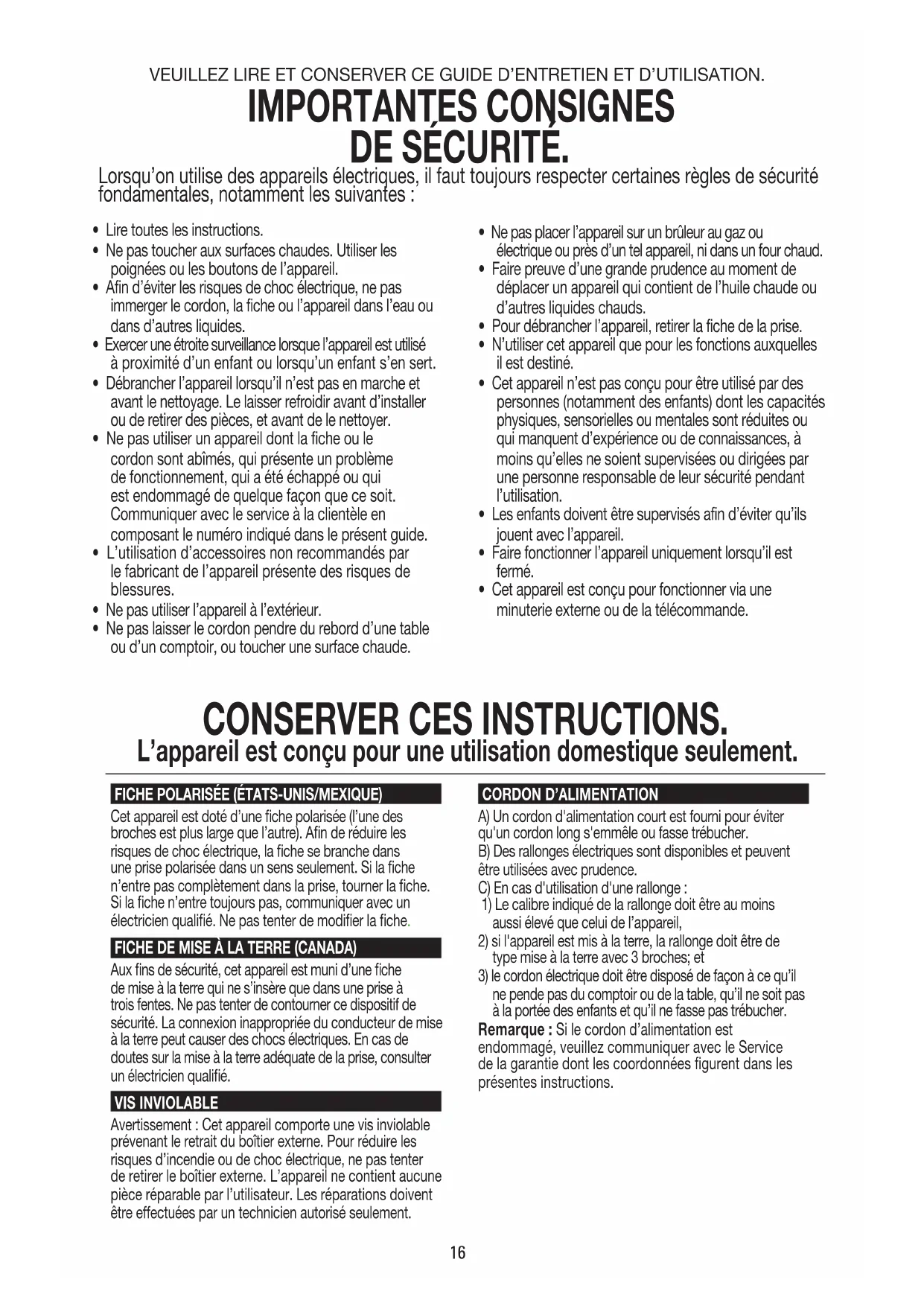 ne pende pas du comptoir ou de la table, qu’il ne soit pas à la portée des enfants et qu’il ne fasse pas trébucher. Remarque : Si le cordon d’alimentation est endommagé, veuillez communiquer avec le Service de la garantie dont les coordonnées gurent dans les présentes instructions. VEUILLEZ LIRE ET CONSERVER CE GUIDE D’ENTRETIEN ET D’UTILISATION. IMPORTANTES CONSIGNES DE SÉCURITÉ. Lorsqu’on utilise des appareils électriques, il faut toujours respecter certaines règles de sécurité fondamentales, notamment les suivantes : CONSERVER CES INSTRUCTIONS. L’appareil est conçu pour une utilisation domestique seulement.17 Le produit peut différer légèrement de celui illustré.