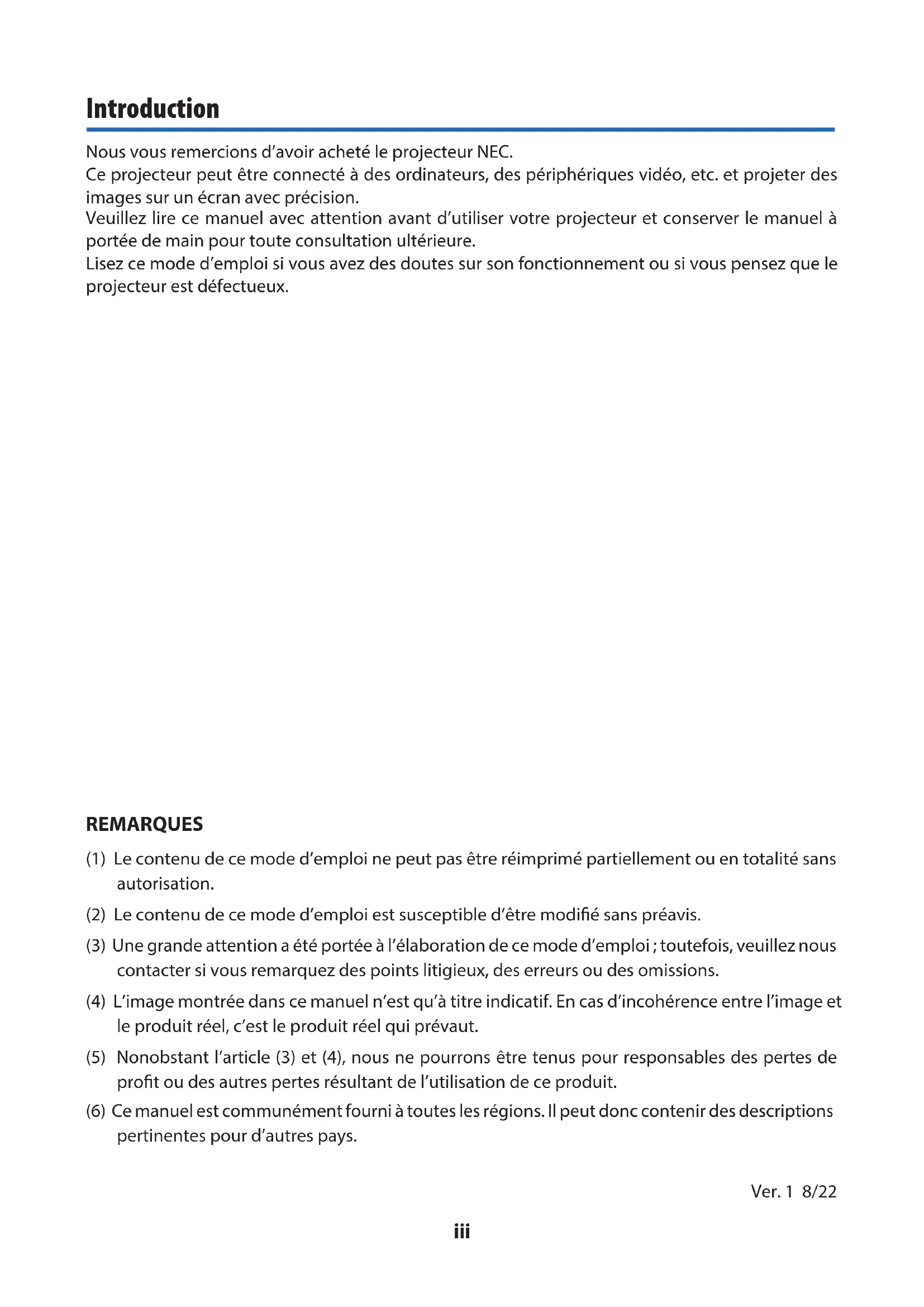 - 9-12. ENREGISTREZ VOTRE PROJECTEUR! (pour les résidents aux États-Unis, Canada et Mexique) iii Nous vous remercions d’avoir acheté le projecteur NEC. Ce projecteur peut être connecté à des ordinateurs, des périphériques vidéo, etc. et projeter des images sur un écran avec précision. Veuillez lire ce manuel avec attention avant d’utiliser votre projecteur et conserver le manuel à portée de main pour toute consultation ultérieure. Lisez ce mode d’emploi si vous avez des doutes sur son fonctionnement ou si vous pensez que le projecteur est défectueux. Ver. 1 8/22 REMARQUES (1) Le contenu de ce mode d’emploi ne peut pas être réimprimé partiellement ou en totalité sans autorisation. (2) Le contenu de ce mode d’emploi est susceptible d’être modié sans préavis. (3) Une grande attention a été portée à l’élaboration de ce mode d’emploi ; toutefois, veuillez nous contacter si vous remarquez des points litigieux, des erreurs ou des omissions. (4) L’image montrée dans ce manuel n’est qu’à titre indicatif. En cas d’incohérence entre l’image et le produit réel, c’est le produit réel qui prévaut. (5) Nonobstant l’article (3) et (4), nous ne pourrons être tenus pour responsables des pertes de prot ou des autres pertes résultant de l’utilisation de ce produit. (6) Ce manuel est communément fourni à toutes les régions. Il peut donc contenir des descriptions pertinentes pour d’autres pays. Introductioniv À propos des symboles Pour garantir une utilisation correcte et en toute sécurité du produit, ce manuel utilise un certain nombre de symboles pour éviter de vous blesser, vous et d’autres personnes, ainsi que les dom- mages matériels. Les symboles et leur signication sont décrits ci-dessous. Assurez-vous de bien les comprendre avant de lire ce manuel. AVERTISSEMENT Ne pas tenir compte de ce symbole et manipuler le produit de manière erronée pourrait entraîner des accidents risquant de provoquer la mort ou des blessures graves. ATTENTION Ne pas respecter ce symbole et manipuler le produit de manière erronée peut entraîner des blessures corporelles ou des dommages aux biens environnants. Exemples de symboles Ce symbole indique que vous devez faire attention aux chocs électriques. Ce symbole indique que vous devez faire attention aux températures élevées. Ce symbole indique quelque chose qui doit être interdit. Ce symbole indique quelque chose qui ne doit pas être mouillé. Ce symbole indique que vous ne devez pas toucher avec les mains mouillées. Ce symbole indique quelque chose qui ne doit pas être démonté. Ce symbole indique des choses que vous devez faire. Ce symbole indique que le câble d’alimentation doit être débranché de la prise de courant. Informations ImportantesInformations Importantes p. 152