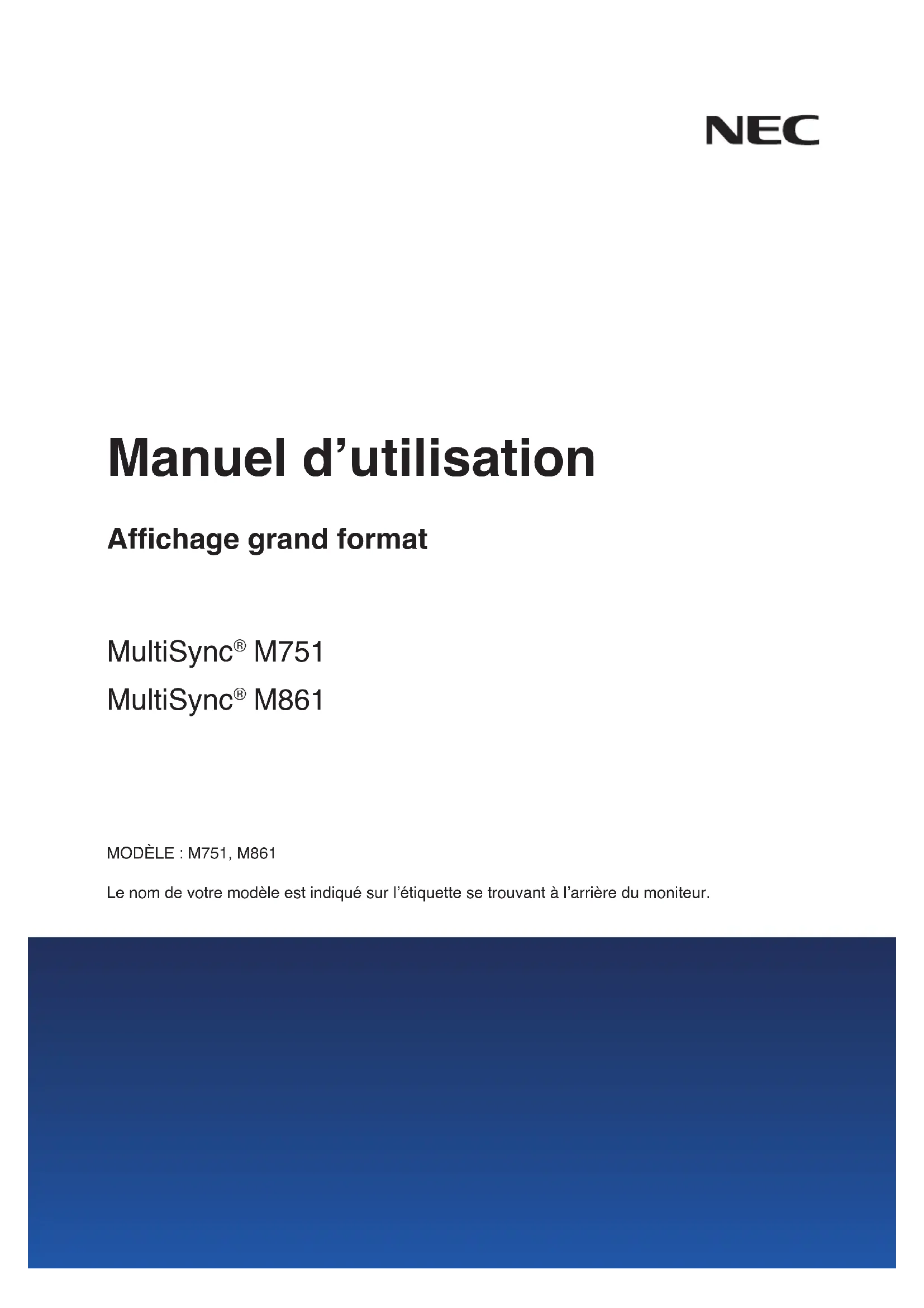 Téléchargez la notice de votre Moniteur au format PDF gratuitement ! Retrouvez votre notice MultiSync M861 - NEC et reprennez votre appareil électronique en main. Sur cette page sont publiés tous les documents nécessaires à l'utilisation de votre appareil MultiSync M861 de la marque NEC.
