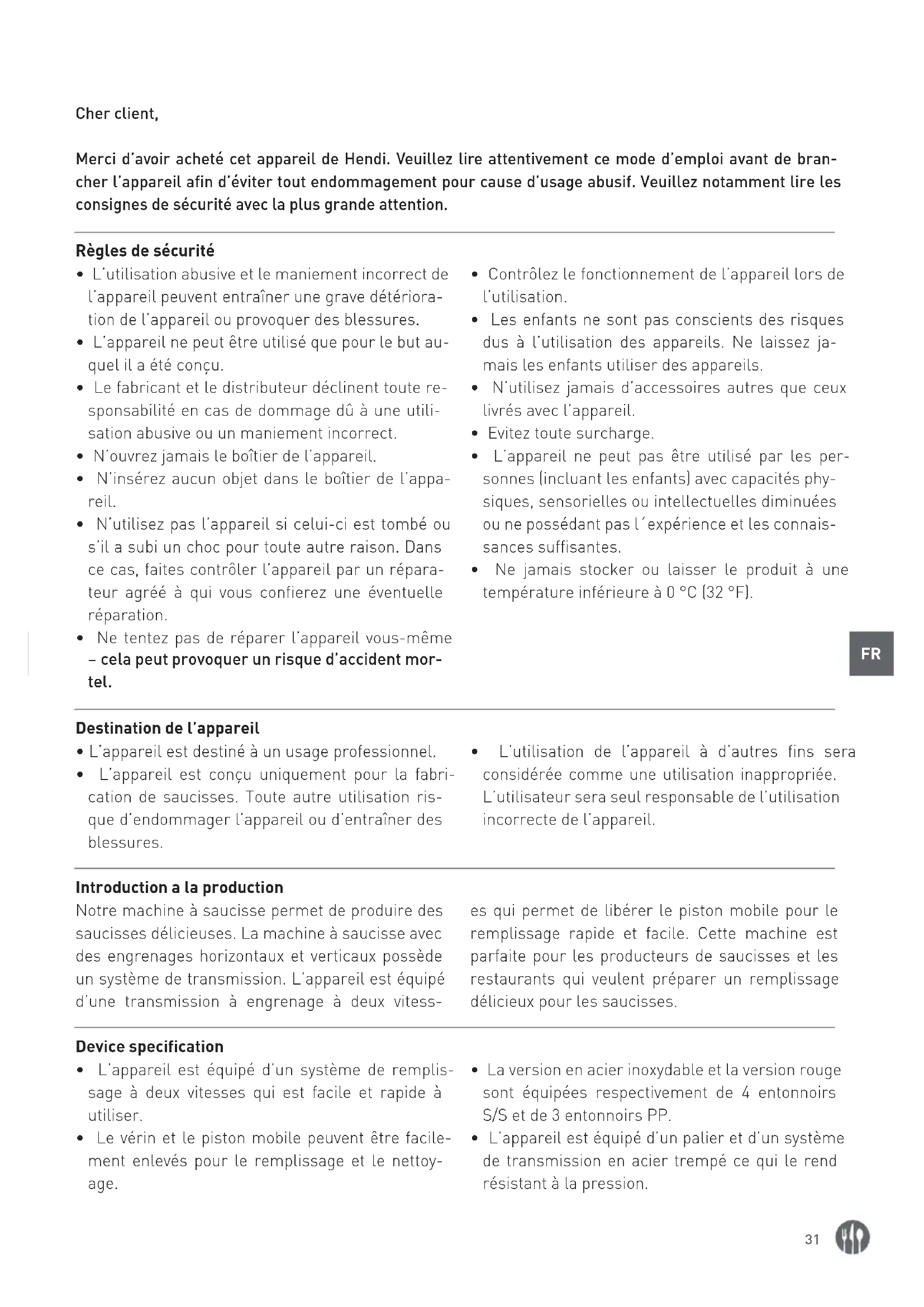 - L’appareil est conçu uniquement pour la fabri- cation de saucisses. Toute autre utilisation ris- que d’endommager l’appareil ou d’entraîner des blessures.