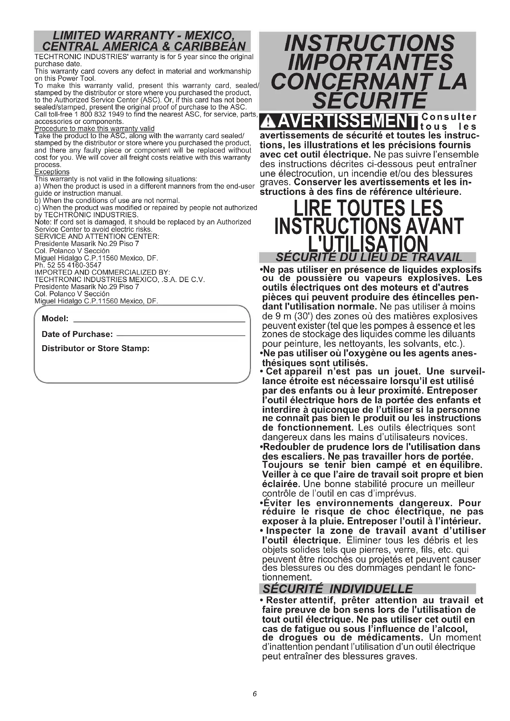 TECHTRONIC INDUSTRIES' garantit le produit pendant cinq ans à partir de la date d’achat d’origine. Le présent bon de garantie couvre tous les vices de matériau et de fabrication que peut afcher cet outil électrique. Pour assurer la validité de la présente garantie, veuillez présenter le bon de commande, estampillé du sceau du distributeur ou du magasin où le produit a été acheté, au centre de réparations agréé. Si le bon de commande n’a pas été estampillé, veuillez fournir la preuve d’achat d’origine au centre de réparations agréé. Pour un entretien, des pièces, des accessoires ou d’autres composants, composer sans frais le 1-800-832-1949 an d’obtenir les coordonnées du centre de réparations agréé le plus près. Procédure pour assurer la validité de la garantiePrésenter le produit au centre de réparations agréé, accompagné du bon de commande estampillé du sceau du distributeur ou du magasin où le produit a été acheté. Toute pièce défectueuse ou tout composant défectueux sera remplacé sans frais. Milwaukee assume tous les frais de transport liés à ce processus de garantie. ExceptionsLa garantie ne s’applique pas dans les situations suivantes : a) Si le produit a été utilisé pour une n autre que celle indiquée dans le guide de l’utilisateur nal ou le manuel d’instructions.b) Si les conditions d’utilisations ne sont pas habituelles.c) Si le produit a été modié ou réparé par une personne non autorisée par TECHTRONIC INDUSTRIES.Note : Si le cordon électrique est endommagé, il doit être remplacé par un centre de réparations agréé pour éviter les risques d’électrocution.CENTRE DE RÉPARATIONS ET DE SERVICE:Presidente Masarik No.29 Piso 7Col. Polanco V Sección Miguel Hidalgo C.P.11560 Mexico, DF. Ph. 52 55 4160-3547IMPORTÉ ET COMMERCIALISÉ PAR :TECHTRONIC INDUSTRIES MEXICO, .S.A. DE C.V.Presidente Masarik No.29 Piso 7Col. Polanco V Sección Miguel Hidalgo C.P.11560 Mexico, DF. Modèle : Date d’achat : Sceau du distributeur ou du magasin : IMPORTANTES INSTRUCCIONES DE SEGURIDAD ADVERTENCIA Lea todas las advertencias, instrucciones e ilustraciones de seguridad y las especicaciones provistas con esta herramienta eléctrica. El no cumplir con todas las instrucciones indicadas a continuación puede causar un choque eléctrico, incendio y/o lesiones personales graves. Guarde todas las advertencias e instrucciones para futura consulta.
