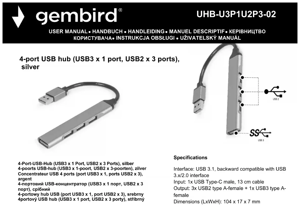 UHBU3P1U2P302 - USB hub Gembird - Notice d'utilisation et mode d'emploi gratuit