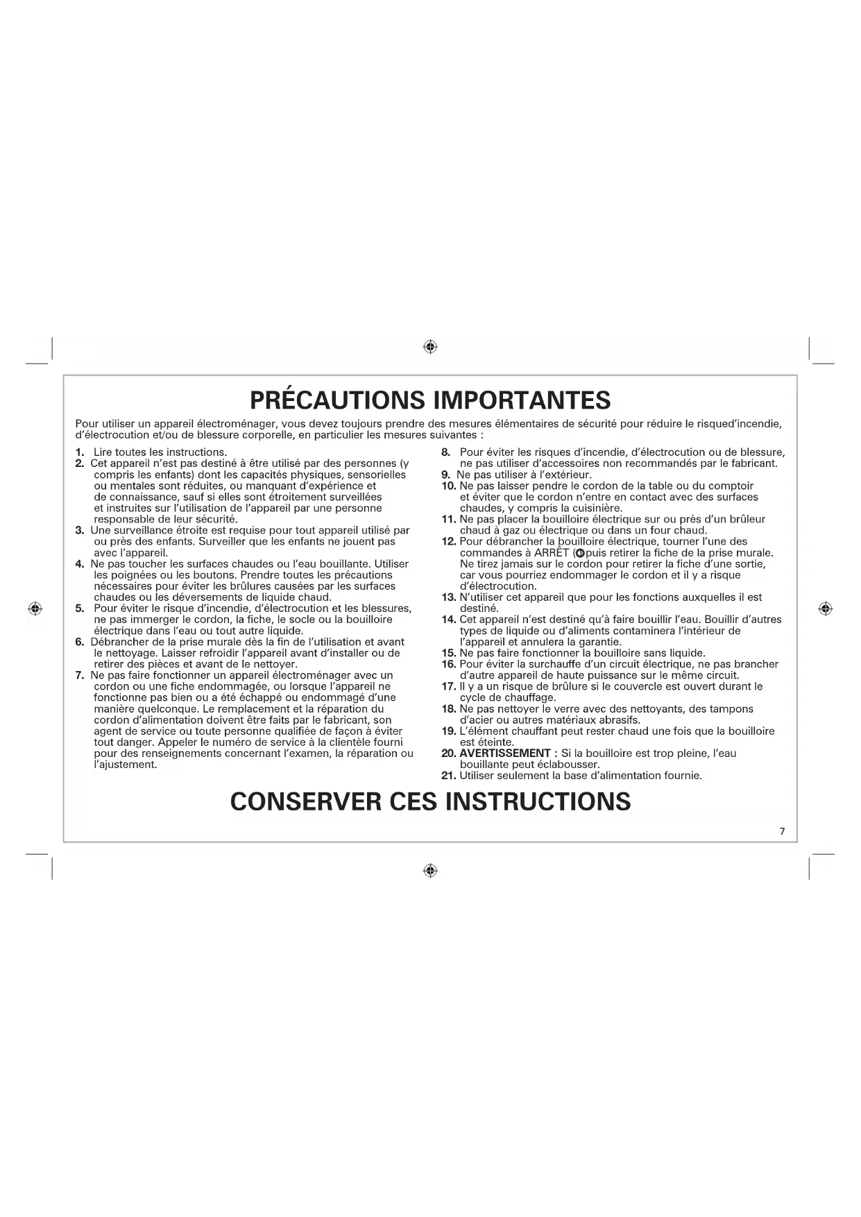 - Est-ce que la fiche est insérée fermement dans la prise murale ? Filtre métallique antitartre : Le tartre est causé par la chaux et le calcium contenu dans l’eau calcaire. Le filtre métallique retient ces particules en suspension dans la bouilloire. Le filtre doit être nettoyé périodiquement pour assurer sa qualité de filtration optimale. Pour nettoyer le filtre, débrancher la bouilloire et laisser refroidir. Brosser doucement le filtre avec une brosse à dents propre et humide. Rincer la brosse à dents et répéter si nécessaire.12 Cette garantie s’applique aux produits achetés et utilisées aux É.-U. et au Canada. C’est la seule garantie expresse pour ce produit et est en lieu et place de tout autre garantie ou condition. Ce produit est garanti contre tout défaut de matériaux et de main-d’oeuvre pour une période de un (1) an à compter de la date d’achat d’origine. Au cours de cette période, votre seul recours est la réparation ou le remplacement de ce produit ou tout composant s’avérant défectueux, à notre gré, mais vous êtes responsable de tous les coûts liés à l’expédition du produit et le retour d’un produit ou d’un composant dans le cadre de cette garantie. Si le produit ou un composant n’est plus offert, nous le remplacerons par un produit similaire de valeur égale ou supérieure. Cette garantie ne couvre pas les filtres, l’usure d’un usage normal, l’utilisation non conforme aux directives imprimées, ou des dommages au produit résultant d’un accident, modification, utilisation abusive ou incorrecte. Cette garantie ne couvre pas le bris de verre sauf si le bris est constaté du déballage suivant l’achat. Cette garantie s’applique seulement à l’acheteur original ou à la personne l’ayant reçu en cadeau. La présentation du reçu de vente d’origine comme preuve d’achat est nécessaire pour faire une réclamation au titre de cette garantie. Cette garantie s’annule si le produit est utilisé autrement que par une famille ou si l’appareil est soumis à toute tension ou forme d’onde différente des caractéristiques nominales précisées sur l’étiquette (par ex. : 120 V ~ 60 Hz). Nous excluons toutes les réclamations au titre de cette garantie pour les dommages spéciaux, consécutifs et indirects causés par la violation de garantie expresse ou implicite. Toute responsabilité est limitée au prix d’achat. Chaque garantie implicite, y compris toute garantie ou condition de qualité marchande ou d’adéquation à un usage particulier, est exonérée, sauf dans la mesure interdite par la loi, auquel cas la garantie ou condition est limitée à la durée de cette garantie écrite. Cette garantie vous donne des droits légaux précis. Vous pouvez avoir d’autres droits qui varient selon l’endroit où vous habitez. Certaines provinces ne permettent pas les limitations sur les garanties implicites ou les dommages spéciaux ou indirects de telle sorte que les limitations ci-dessus ne s’appliquent peut-être pas à votre cas. Ne pas retourner cet appareil au magasin lors d’une réclamation au titre de cette garantie. Téléphoner au 1.800.851.8900 aux É.-U. ou au 1.800.267.2826 au Canada ou visiter le site internet www.hamiltonbeach.com aux É.-U. ou www.hamiltonbeach.ca au Canada. Pour un service plus rapide, trouvez le numéro de modèle, le type d’appareil et les numéros de série sur votre appareil. Garantie limitée13 SALVAGUARDIAS IMPORTANTES