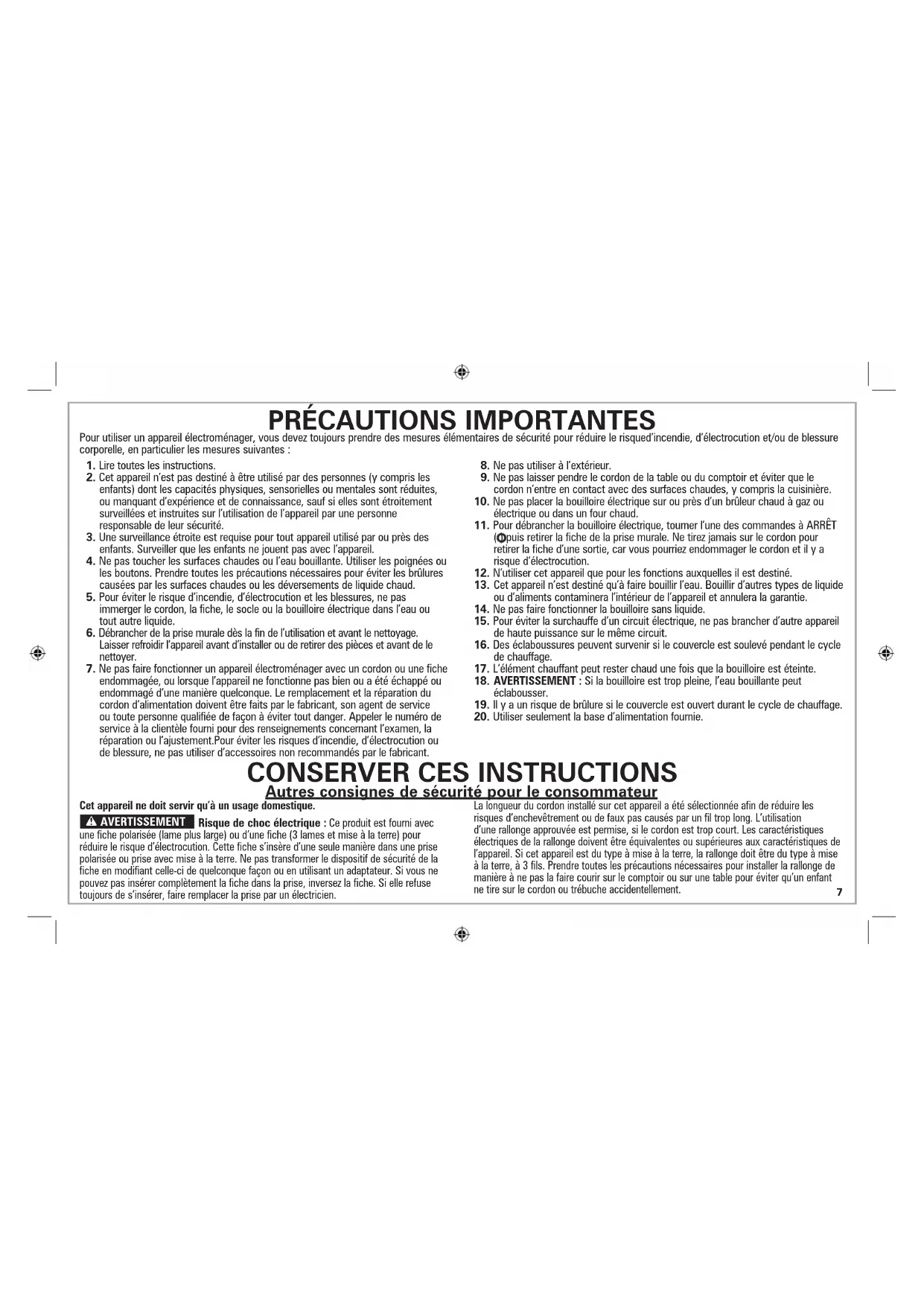 7. Ne pas faire fonctionner un appareil électroménager avec un cordon ou une fiche