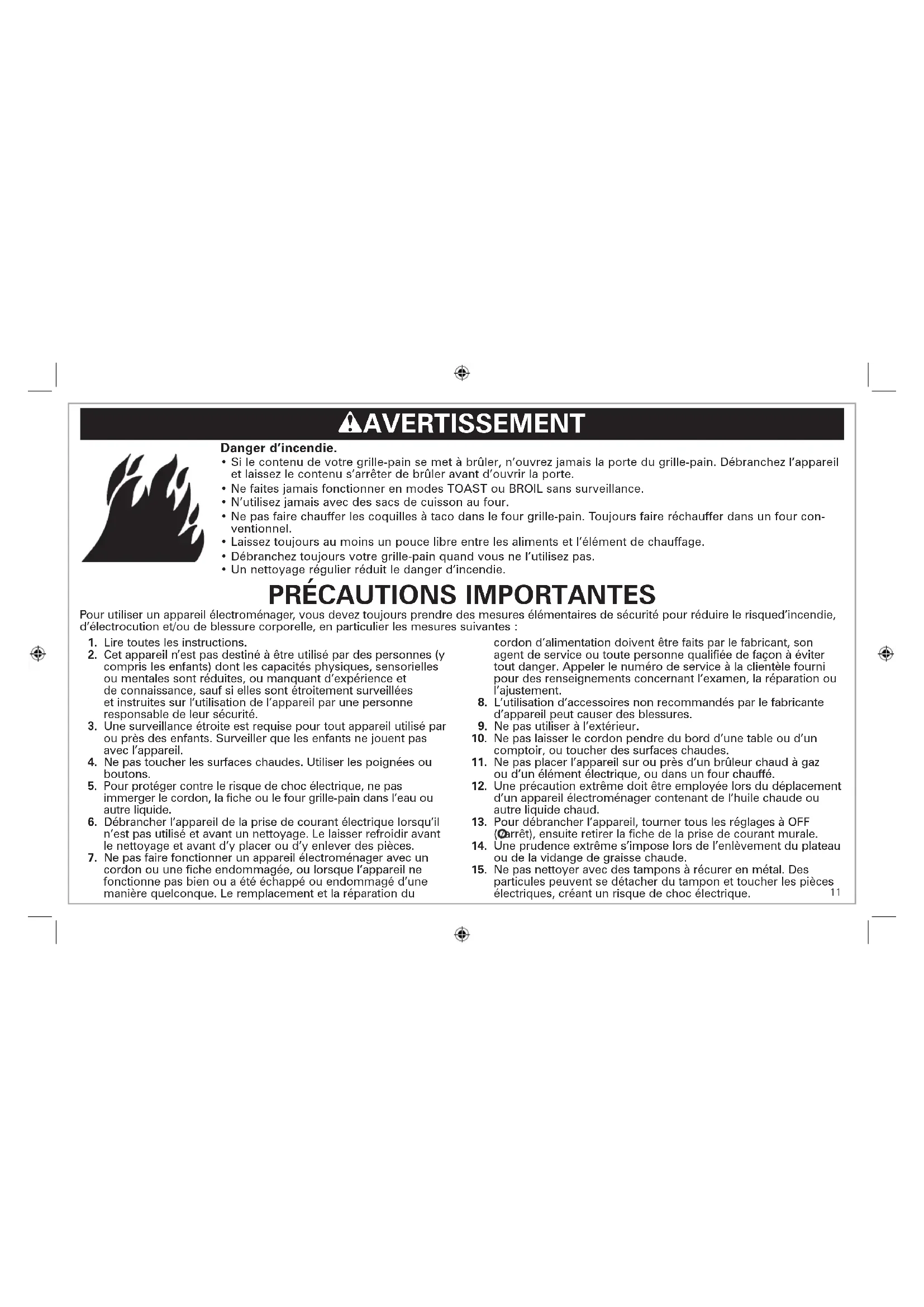 particules peuvent se détacher du tampon et toucher les pièces électriques, créant un risque de choc électrique.12 Autres consignes de sécurité pour le consommateur Cet appareil est destiné à l’utilisation domestique seulement. w AVERTISSEMENT Risque de choc électrique : Cet appareil est fourni avec une fiche polarisée (une broche large) pour réduire le risque d’électrocution. Cette fiche n’entre que dans un seul sens dans une prise polarisée. Ne contrecarrez pas l’objectif sécuritaire de cette fiche en la modifiant de quelque manière que ce soit ou en utilisant un adaptateur. Si vous ne pouvez pas insérer complètement la fiche dans la prise, inversez la fiche. Si elle refuse toujours de s’insérer, faire remplacer la prise par un électricien. La longueur du cordon installé sur cet appareil a été sélectionnée afin de réduire les risques d’enchevêtrement ou de faux pas causés par un fil trop long. L’utilisation d’une rallonge approuvée est permise si le cordon est trop court. Les caractéristiques électriques de la rallonge doivent être équivalentes ou supérieures aux caractéristiques de l’appareil. Prendre toutes les précautions nécessaires pour installer la rallonge de manière à ne pas la faire courir sur le comptoir ou sur une table pour éviter qu’un enfant ne tire sur le cordon ou trébuche accidentellement. Pour éviter la surcharge du circuit électrique, ne pas utiliser un autre appareil à haute puissance sur le même circuit que cet appareil. Cet appareil est doté d’une porte en verre renforcé de sécurité. Le verre renforcé est quatre fois plus fort que le verre ordinaire et plus résistant aux bris. Le verre renforcé peut se briser, mais il se brise en pièces sans bords coupants. Il faut prendre soin d’éviter d’égratigner la surface de la porte ou d’endommager le contour. Si la porte a une égratignure ou un bris, composer notre numéro sans frais d’interurbain d’assistance à la clientèle. Toujours débrancher votre four grille-pain de la prise de courant lorsqu’il n’est pas utilisé.