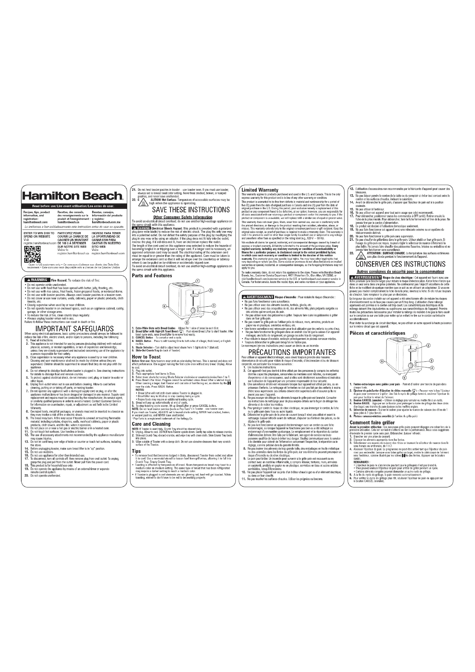 - Pour déloger les aliments coincés dans les fentes, débrancher le grille-pain de la prise de courant et laisser refroidir. Utiliser un ustensile non métallique pour déloger l’aliment des éléments et le laisser tomber dans le plateau ramasse-miettes. Vider le plateau ramasse-miettes.• Le grillage est affecté par la température du pain. Le pain à la température ambiante peut griller à une nuance moyenne au réglage moyen. Le même genre de pain réfrigéré peut nécessiter un réglage plus foncé pour atteindre une nuance moyenne.• Si le grille-pain est branché et que les éléments ne deviennent pas rouges, les aliments grilleront. Pendant le grillage, les éléments ne devenant pas rouges n’indiquent pas un mauvais fonctionnement. Garantie limitée Cette garantie s’applique aux produits achetés et utilisées aux É.-U. et au Canada. C’est la seule garantie expresse pour ce produit et est en lieu et place de tout autre garantie ou condition. Ce produit est garanti contre tout défaut de matériaux et de main-d’oeuvre pour une période de cinq (5) ans à compter de la date d’achat d’origine au Canada et un (1) an à compter de la date d’achat d’origine aux É.-U. Au cours de cette période, votre recours exclusif se limitera au remplacement de ce produit ou tout autre composant défectueux, à notre discrétion. Cependant, vous êtes responsables des frais associés au retour du produit ou d’un composant en vertu de la présente garantie. Si le produit ou le composant est non disponible, nous le remplacerons avec un article similaire de valeur égale ou supérieure.Cette garantie ne couvre pas le verre, les filtres, l’usure d’un usage normal, l’utilisation non conforme aux directives imprimées, ou des dommages au produit résultant d’un accident, modification, utilisation abusive ou incorrecte. Cette garantie s’applique seulement à l’acheteur original ou à la personne l’ayant reçu en cadeau. La présentation du reçu de vente d’origine comme preuve d’achat est nécessaire pour faire une réclamation au titre de cette garantie. Cette garantie s’annule si le produit est utilisé autrement que par une famille ou si l’appareil est soumis à toute tension ou forme d’onde différente des caractéristiques nominales précisées sur l’étiquette (par ex. : 120 V ~ 60 Hz).Nous excluons toutes les réclamations au titre de cette garantie pour les dommages spéciaux, consécutifs et indirects causés par la violation de garantie expresse ou implicite. Toute responsabilité est limitée au prix d’achat. Chaque garantie implicite, y compris toute garantie ou condition de qualité marchande ou d’adéquation à un usage particulier, est exonérée, sauf dans la mesure interdite par la loi, auquel cas la garantie ou condition est limitée à la durée de cette garantie écrite. Cette garantie vous donne des droits légaux précis. Vous pouvez avoir d’autres droits qui varient selon l’endroit où vous habitez. Certaines provinces ne permettent pas les limitations sur les garanties implicites ou les dommages spéciaux ou indirects de telle sorte que les limitations ci-dessus ne s’appliquent peut-être pas à votre cas.Pour faire une réclamation au titre de la garantie, veuillez ne pas retourner cet appareil au magasin. Veuillez nous écrire à Hamilton Beach Brands, Inc., Customer Service Department, 4421 Waterfront Dr., Glen Allen, VA 23060, ou visiter le site hamiltonbeach.com/customer-service aux États-Unis ou hamiltonbeach.ca/customer-service au Canada. Pour obtenir un service plus rapide, veuillez repérer les numéros de modèle, de type et de séries sur votre appareil.w ADVERTENCIA Riesgo de incendio: Para reducir el riesgo de incendio: