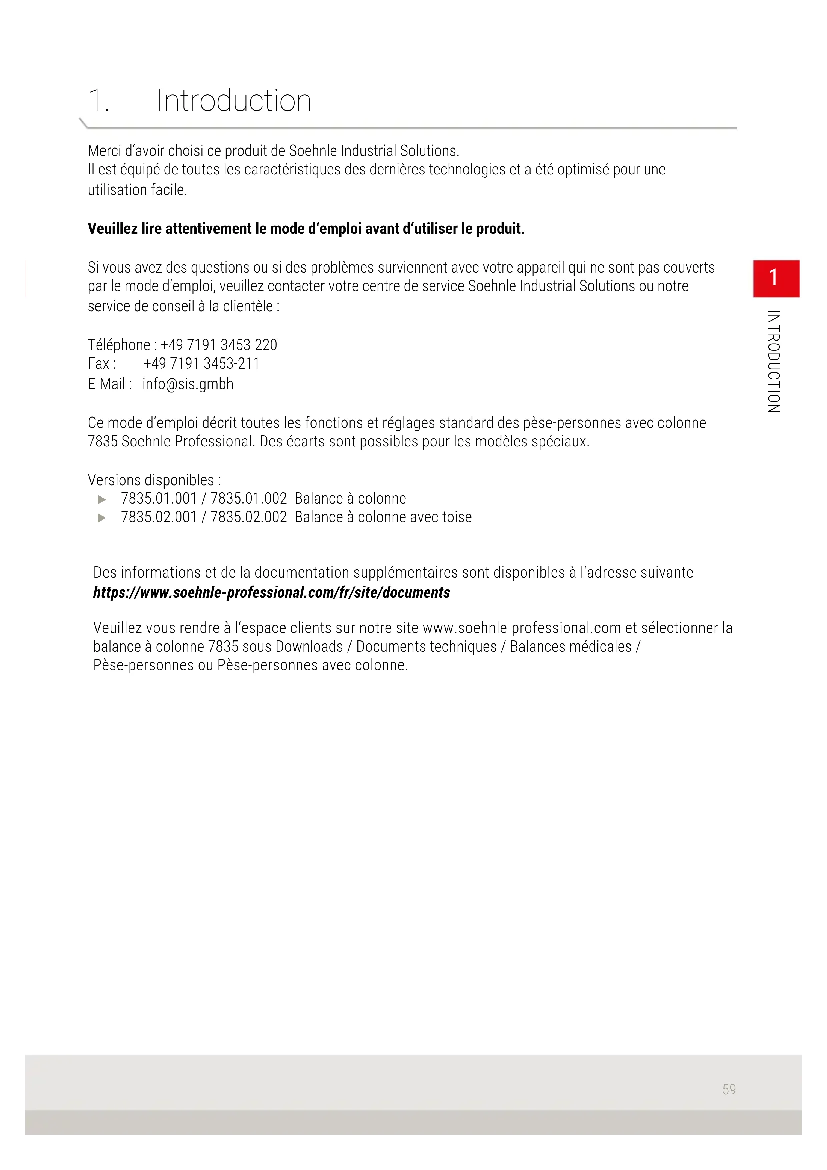 Merci d‘avoir choisi ce produit de Soehnle Industrial Solutions. Il est équipé de toutes les caractéristiques des dernières technologies et a été optimisé pour une utilisation facile. Veuillez lire attentivement le mode d‘emploi avant d‘utiliser le produit. Si vous avez des questions ou si des problèmes surviennent avec votre appareil qui ne sont pas couverts par le mode d‘emploi, veuillez contacter votre centre de service Soehnle Industrial Solutions ou notre service de conseil à la clientèle : Téléphone : +49 7191 3453-220 Fax : +49 7191 3453-211 E-Mail : info@sis.gmbh Ce mode d‘emploi décrit toutes les fonctions et réglages standard des pèse-personnes avec colonne 7835 Soehnle Professional. Des écarts sont possibles pour les modèles spéciaux. Versions disponibles :