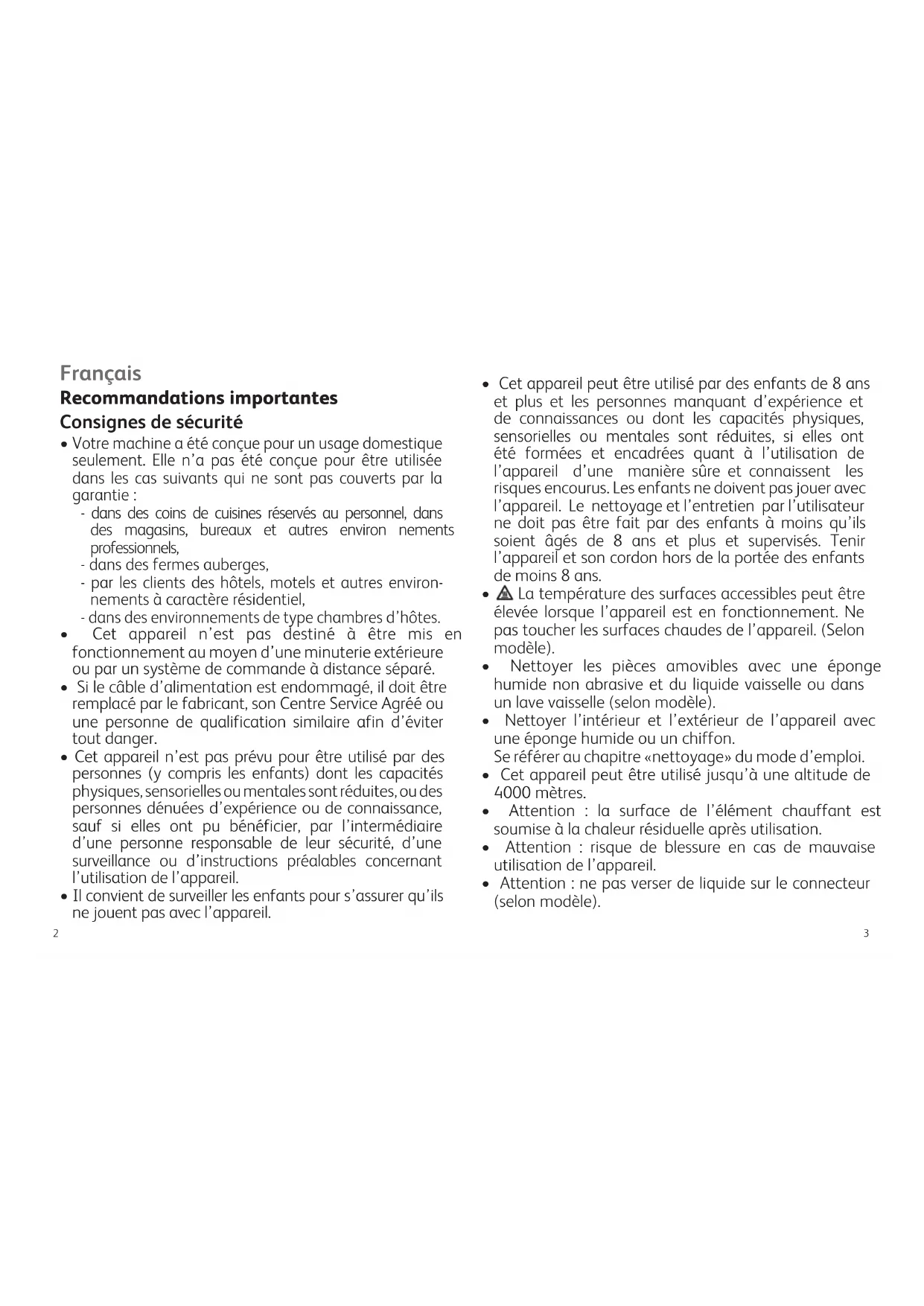 - Cet appareil peut être utilisé par des enfants de 8 ans et plus et les personnes manquant d’expérience et de connaissances ou dont les capacités physiques, sensorielles ou mentales sont réduites, si elles ont été formées et encadrées quant à l’utilisation de l’appareil d’une manière sûre et connaissent les risques encourus. Les enfants ne doivent pas jouer avec l’appareil. Le nettoyage et l’entretien par l’utilisateur ne doit pas être fait par des enfants à moins qu’ils soient âgés de 8 ans et plus et supervisés. Tenir l’appareil et son cordon hors de la portée des enfants de moins 8 ans.