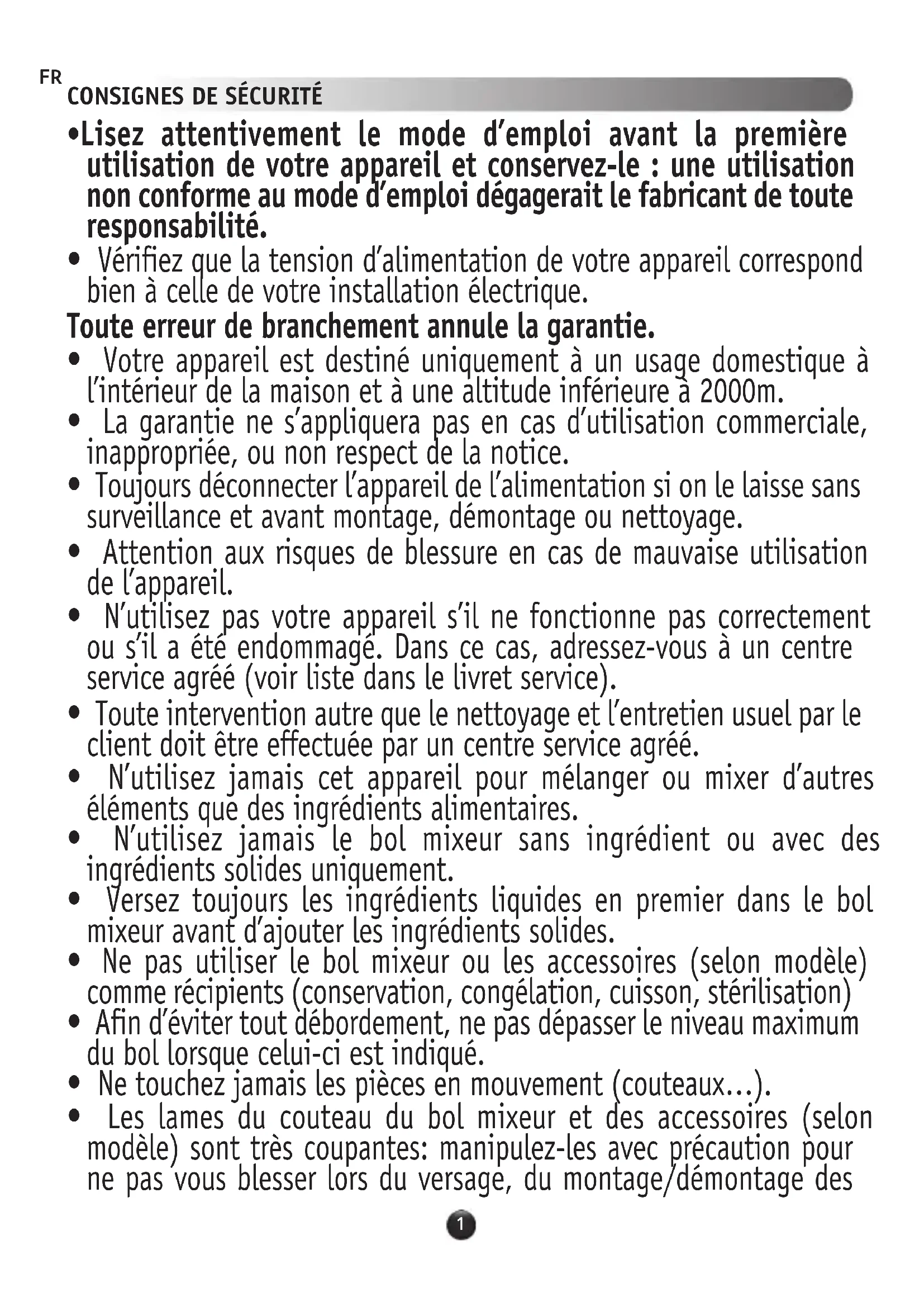 - Lisez attentivement le mode d’emploi avant la première utilisation de votre appareil et conservez-le : une utilisation non conforme au mode d’emploi dégagerait le fabricant de toute responsabilité.