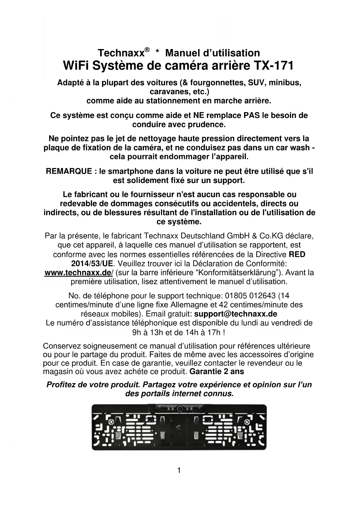 - Manuel d’utilisation WiFi Système de caméra arrière TX-171 Adapté à la plupart des voitures (& fourgonnettes, SUV, minibus, caravanes, etc.) comme aide au stationnement en marche arrière. Ce système est conçu comme aide et NE remplace PAS le besoin de conduire avec prudence. Ne pointez pas le jet de nettoyage haute pression directement vers la plaque de fixation de la caméra, et ne conduisez pas dans un car wash - cela pourrait endommager l’appareil. REMARQUE : le smartphone dans la voiture ne peut être utilisé que s'il est solidement fixé sur un support. Le fabricant ou le fournisseur n'est aucun cas responsable ou redevable de dommages consécutifs ou accidentels, directs ou indirects, ou de blessures résultant de l'installation ou de l'utilisation de ce système. Par la présente, le fabricant Technaxx Deutschland GmbH & Co.KG déclare, que cet appareil, à laquelle ces manuel d’utilisation se rapportent, est conforme avec les normes essentielles référencées de la Directive RED 2014/53/UE. Veuillez trouver ici la Déclaration de Conformité: www.technaxx.de/ (sur la barre inférieure “Konformitätserklärung”). Avant la première utilisation, lisez attentivement le manuel d’utilisation. No. de téléphone pour le support technique: 01805 012643 (14 centimes/minute d’une ligne fixe Allemagne et 42 centimes/minute des réseaux mobiles). Email gratuit: support@technaxx.de Le numéro d’assistance téléphonique est disponible du lundi au vendredi de 9h à 13h et de 14h à 17h ! Conservez soigneusement ce manual d’utilisation pour références ultérieure ou pour le partage du produit. Faites de même avec les accessoires d’origine pour ce produit. En case de garantie, veuillez contacter le revendeur ou le magasin où vous avez achéte ce produit. Garantie 2 ans Profitez de votre produit. Partagez votre expérience et opinion sur l’un des portails internet connus.2 Contenu Caractéristiques ............................................................................................. 2 Caractéristiques techniques ........................................................................... 3 Normes de sécurité ........................................................................................ 4 Présentation générale du produit ................................................................... 4 Support de plaque d'immatriculation avec caméra ..................................... 4 Mettre en service ........................................................................................... 4 Insérez la plaque d’immatriculation dans le support ....................................... 7 Réglage de l'angle de la caméra .................................................................... 7 Téléchargement & installation de l'APP ......................................................... 8 iOS: Configurer la connexion Wi-Fi : .......................................................... 8 Android : Configurer la connexion Wi-Fi : ................................................... 9 Démarrez/Ouvrez l’appli JoyTrip .............................................................. 10 Conseils, remarques & mises en garde .................................................... 11 FAQ ............................................................................................................. 11 Informations générales ................................................................................ 11 Conditions environnementales ..................................................................... 12 Élimination ................................................................................................... 12 Caractéristiques ⚫ Caméra de recul discrète montée dans le support de plaque d'immatriculation ⚫ Adapté pour la majorité des véhicules comme aide au stationnement en marche arrière. ⚫ Votre smartphone doit prendre en charge la communication IEEE 802.11ac 5GHz ⚫ Diffusion de la vidéo via WiFi 5GHZ avec l’appli du smartphone (JoyTrip) ⚫ Transmission vidéo sans fil jusqu'à ~15m ⚫ LED IR pour la vision nocturne ~3m ⚫ Alignement de caméra ajustable et angle de vision de 120° ⚫ Alimentation de la caméra sur le phare de marche arrière ⚫ Classe de protection de caméra IP67 (étanche à la poussière & protection contre l’immersion temporaire) ⚫ Support de plaque d'immatriculation adapté à la norme sur une seule ligne (52x11cm) ⚫ Affichage de la distance sur la ligne de recul sur le smartphone ⚫ Capture de photos et de vidéos via l’appli ⚫ Plus de sécurité pour reculer3 Caractéristiques techniques Support de plaque d'immatriculation avec caméra et module sans fil Capteur d’image 2MP CMOS Résolution / IPS de la caméra 1024x720 pixels / 30 Compression vidéo H.264 Angle de vision 120° Éclairage minimum 0,1 Lux / balance des blancs automatique Distance en vision nocturne