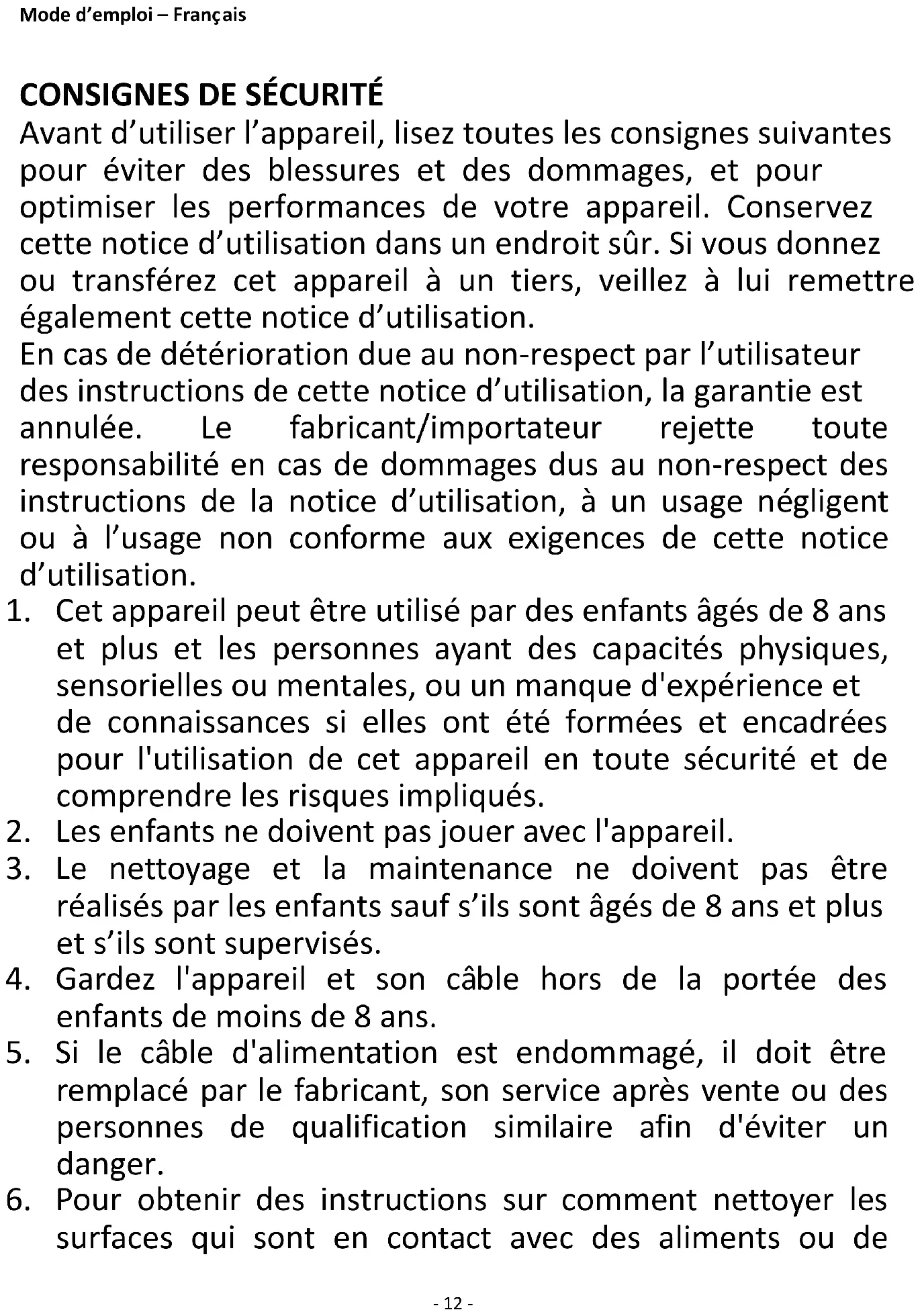 Avant d’utiliser l’appareil, lisez toutes les consignes suivantes pour éviter des blessures et des dommages, et pour optimiser les performances de votre appareil. Conservez cette notice d’utilisation dans un endroit sûr. Si vous donnez ou transférez cet appareil à un tiers, veillez à lui remettre également cette notice d’utilisation. En cas de détérioration due au non-respect par l’utilisateur des instructions de cette notice d’utilisation, la garantie est annulée. Le fabricant/importateur rejette toute responsabilité en cas de dommages dus au non-respect des instructions de la notice d’utilisation, à un usage négligent ou à l’usage non conforme aux exigences de cette notice d’utilisation.