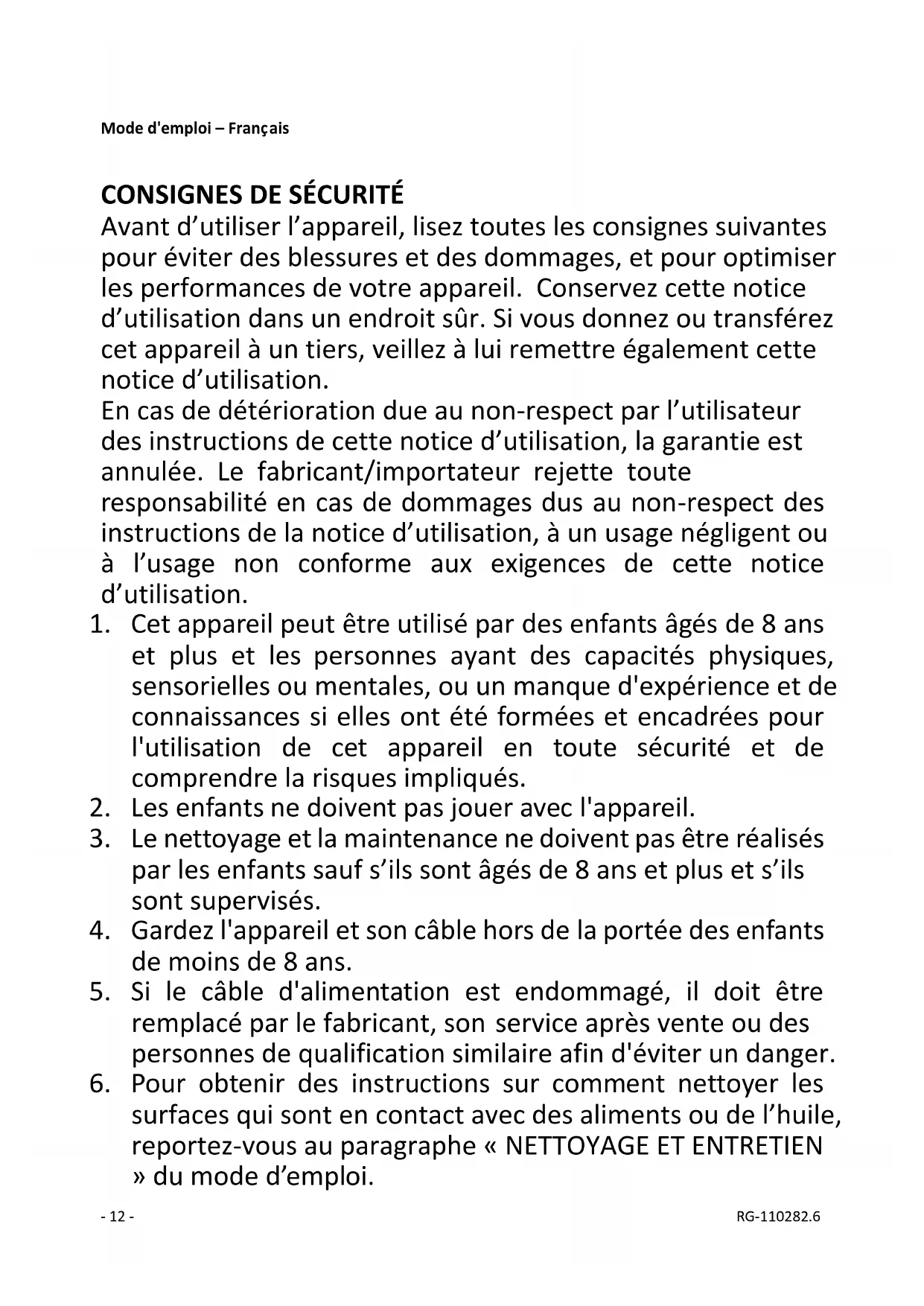 surfaces qui sont en contact avec des aliments ou de l’huile, reportez-vous au paragraphe « NETTOYAGE ET ENTRETIEN » du mode d’emploi.- 13 - RG-110282.6