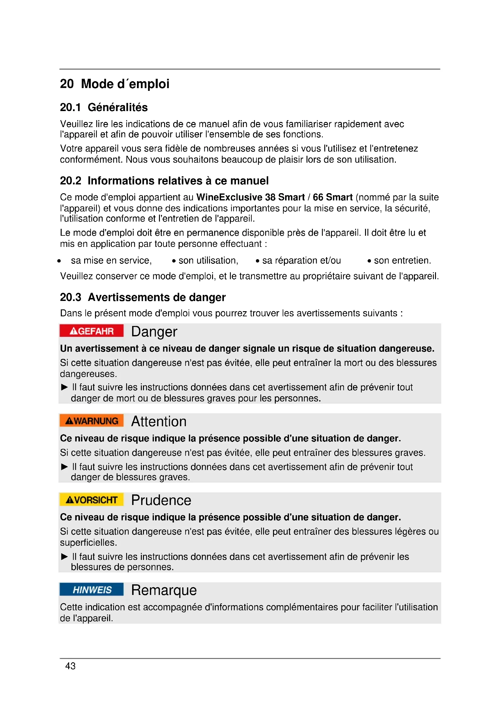 Ce mode d'emploi appartient au WineExclusive 38 Smart / 66 Smart (nommé par la suite l'appareil) et vous donne des indications importantes pour la mise en service, la sécurité, l'utilisation conforme et l'entretien de l'appareil. Le mode d'emploi doit être en permanence disponible près de l'appareil. Il doit être lu et mis en application par toute personne effectuant :