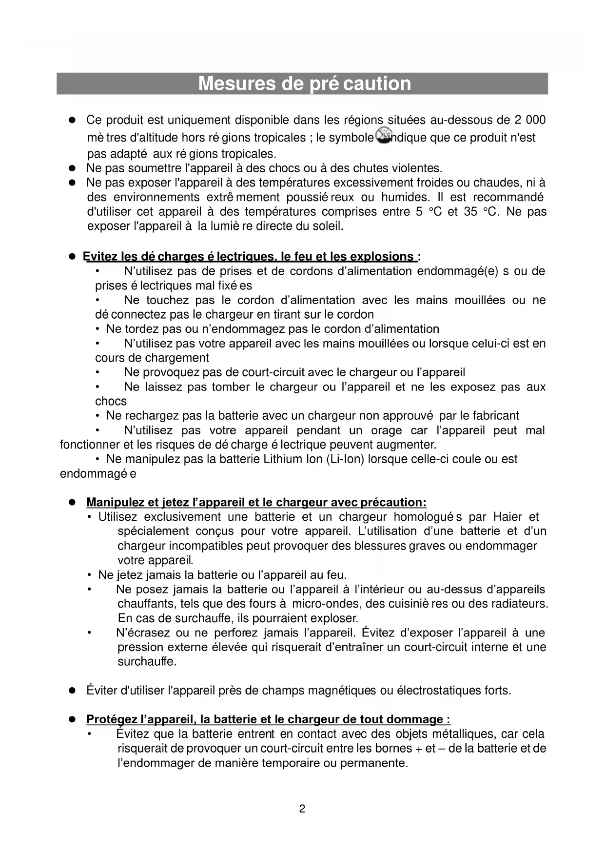 - Utilisez exclusivement une batterie et un chargeur homologués par Haier et spécialement conçus pour votre appareil. L’utilisation d’une batterie et d’un chargeur incompatibles peut provoquer des blessures graves ou endommager votre appareil.